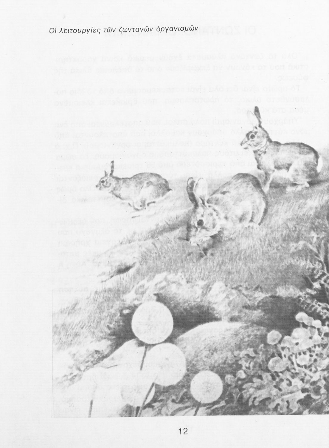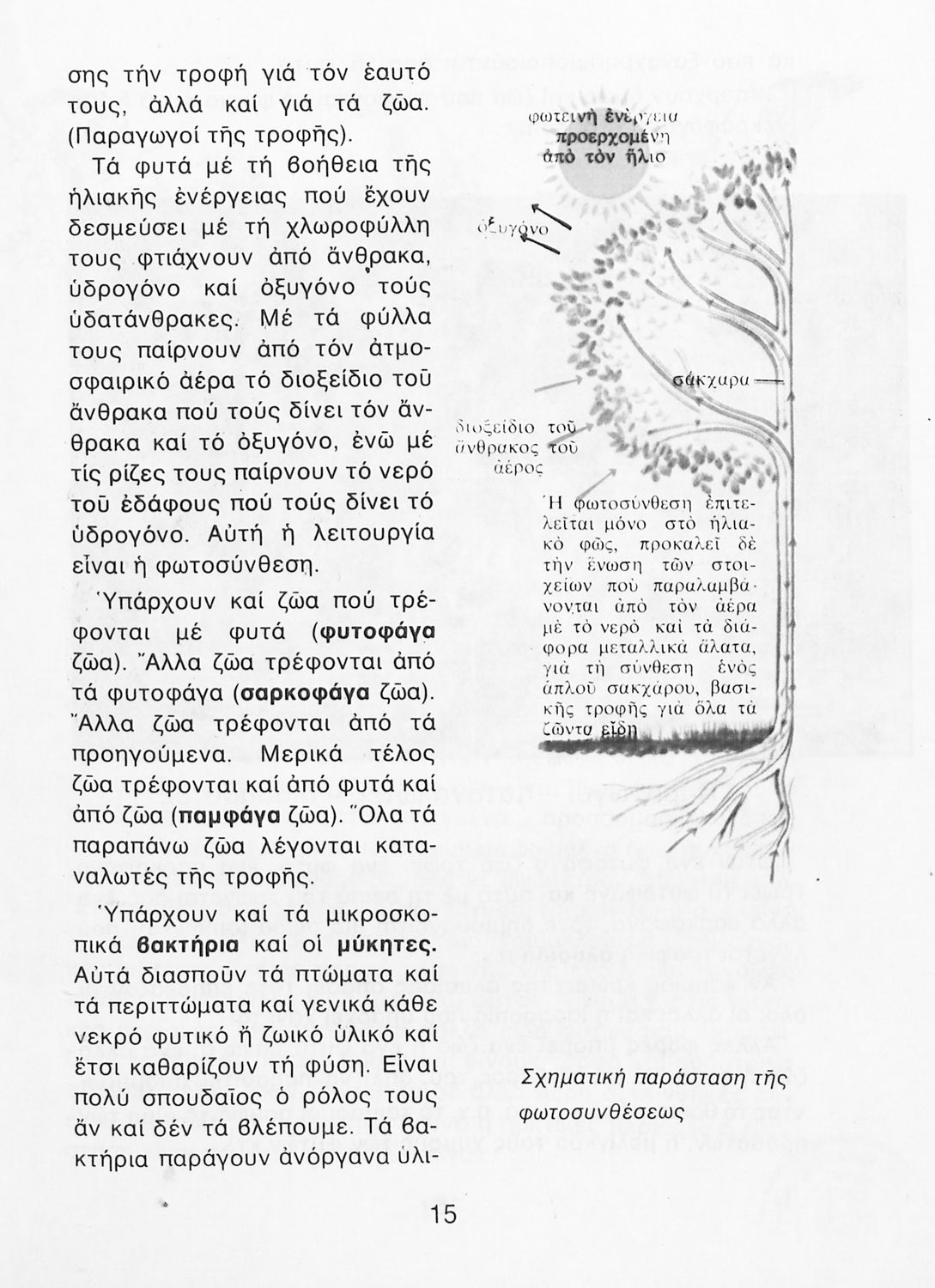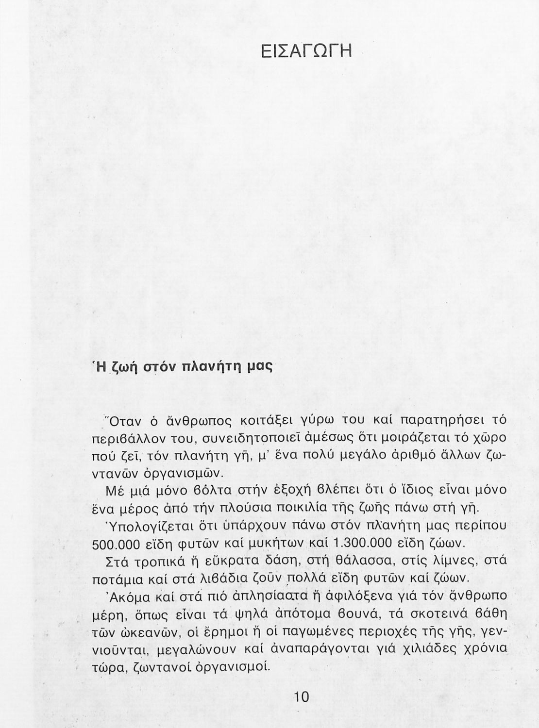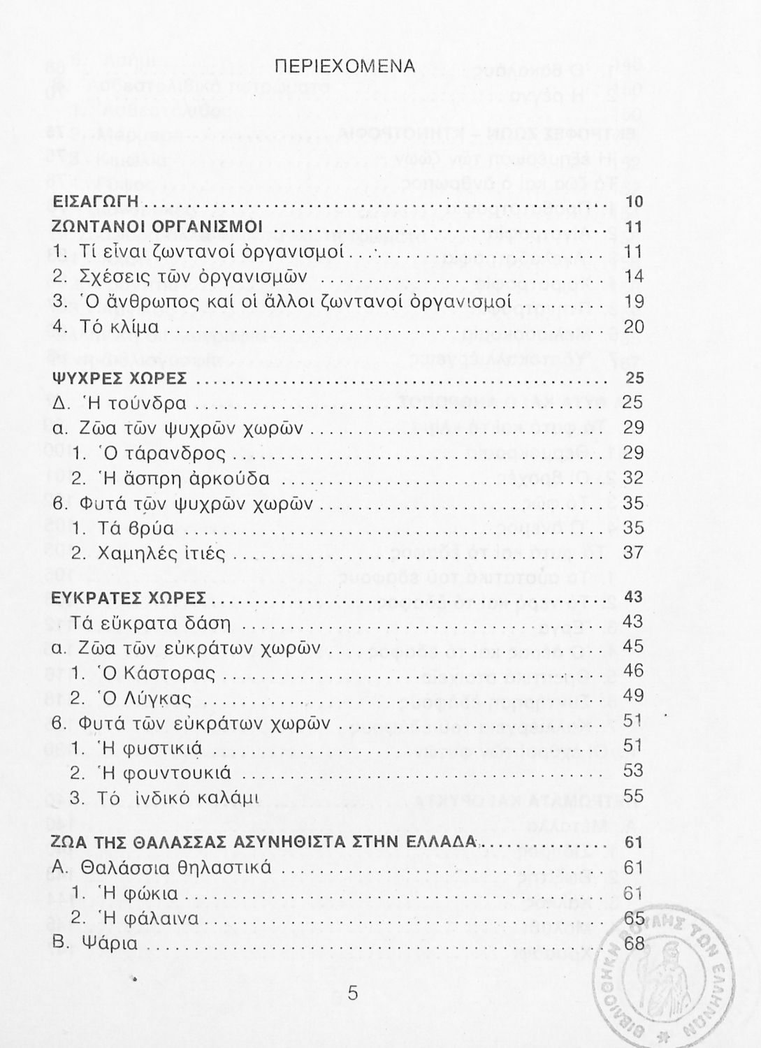 Σχολικό εγχειρίδιο Φυτολογίας και Ζωολογίας της Ε' Δημοτικού. Το βιβλίο παρουσιάζει τις διαφορετικές κατηγορίες ζώων και φυτών, τα χαρακτηριστικά τους και το φυσικό τους περιβάλλον. Παρουσιάζει τα διαφορετικά μέρη των φυτών και των ζώων καθώς και τους τρόπους με τους οποίους αξιοποιούνται από τους ανθρώπους μέσω της καλλιέργειας και της κτηνοτροφίας. Τέλος, το βιβλίο κατηγοριοποιεί τα ζώα και τα φυτά ανάλογα με το φυσικό τους περιβάλλον.