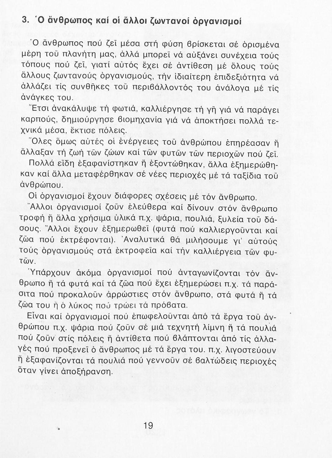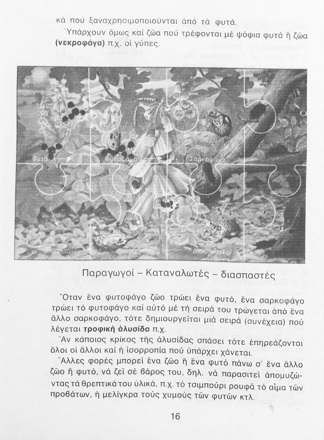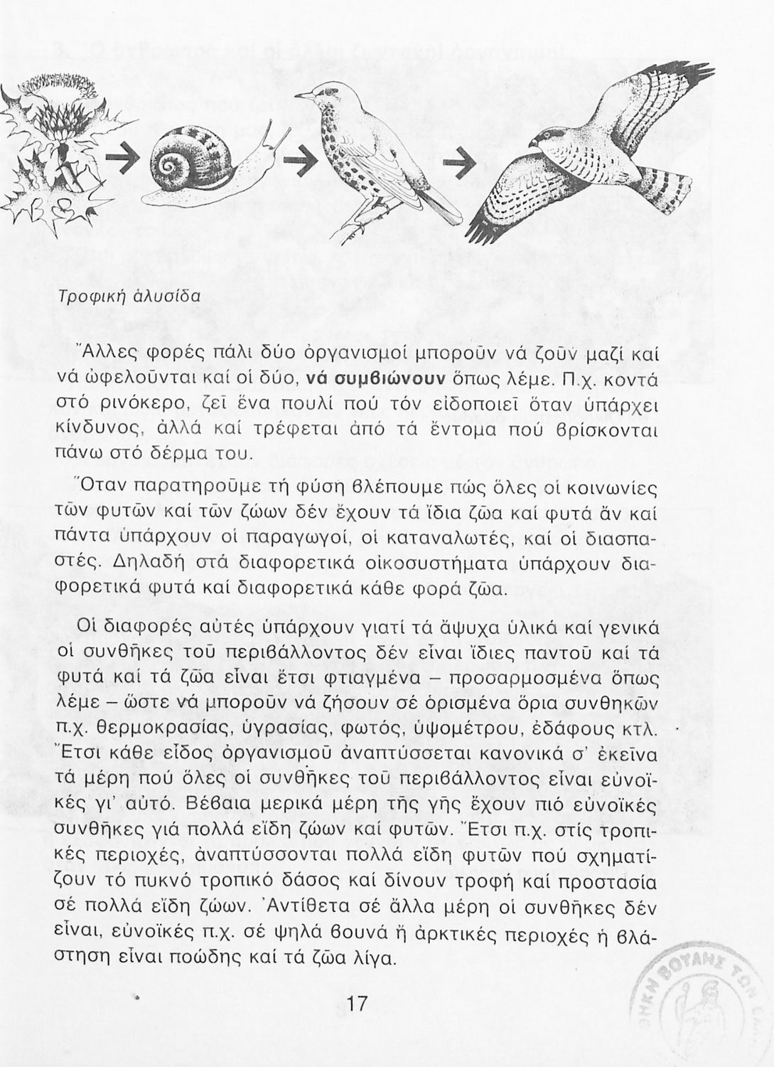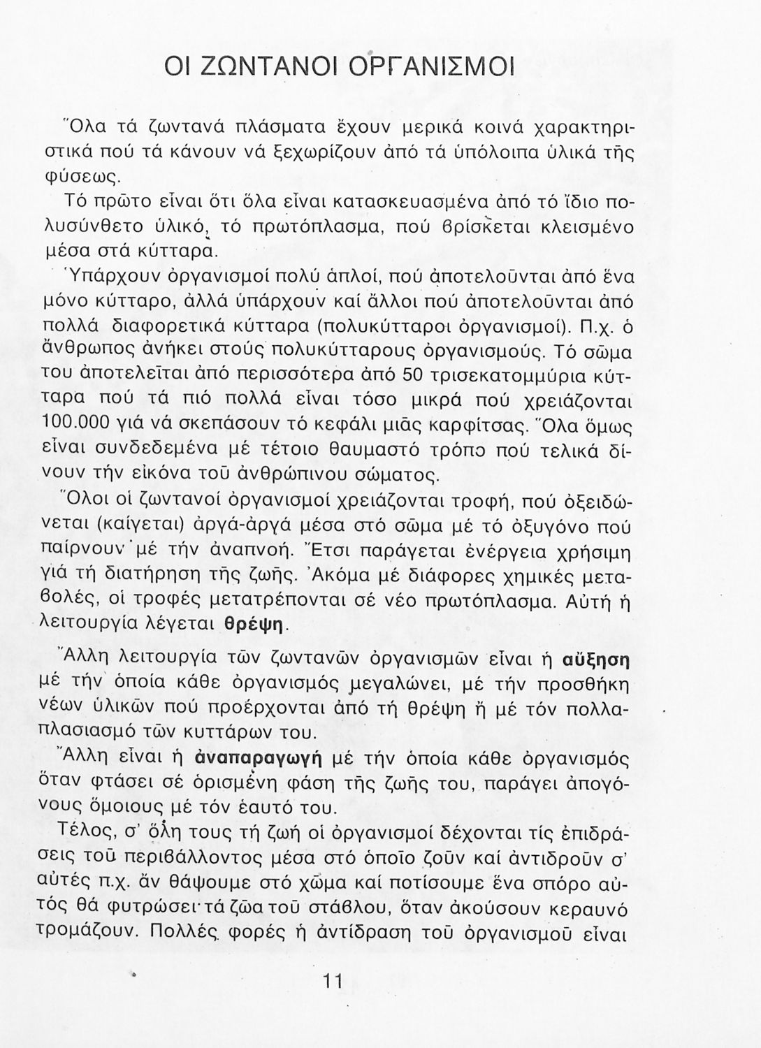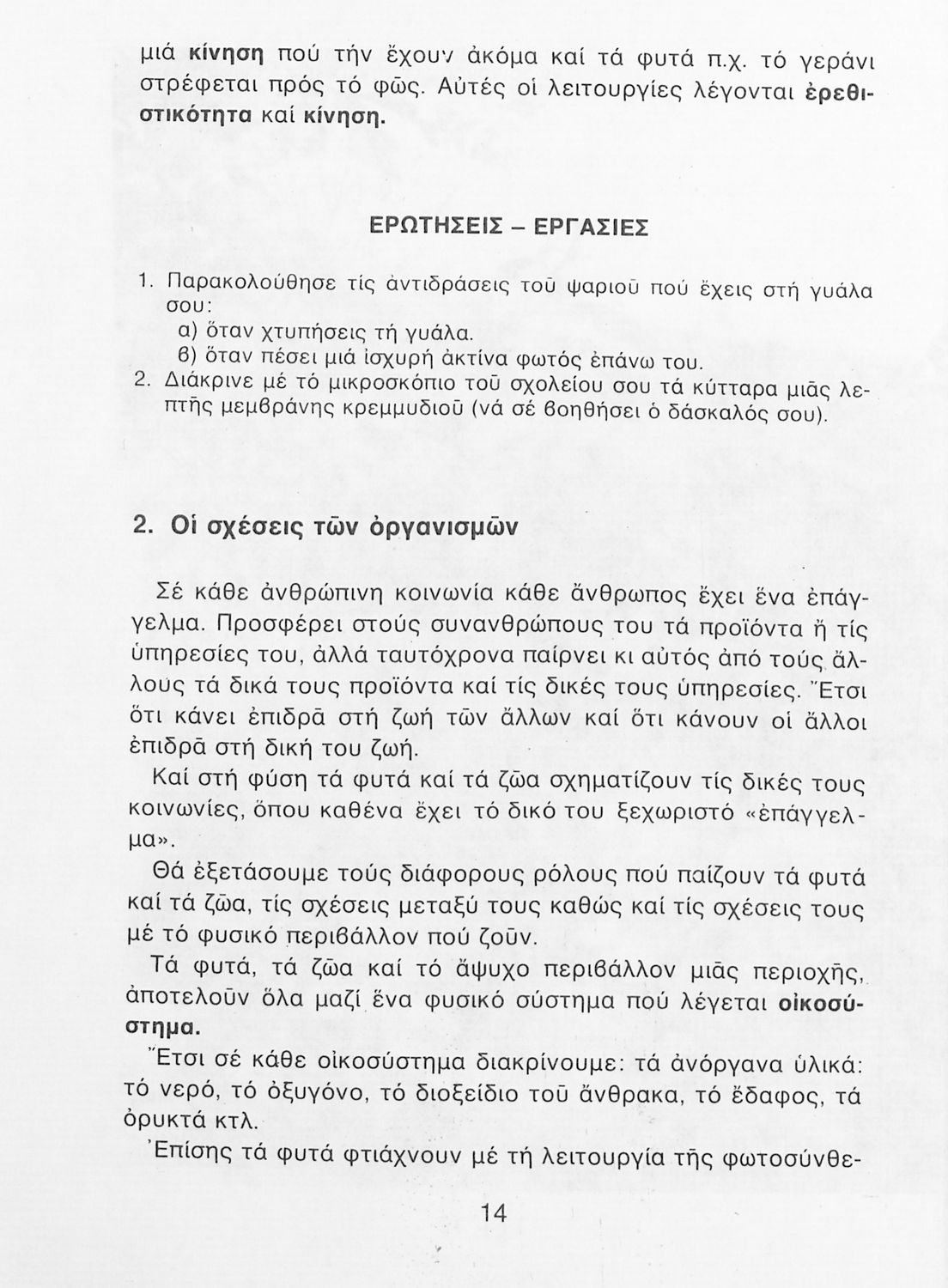 Σχολικό εγχειρίδιο Φυτολογίας και Ζωολογίας της Ε' Δημοτικού. Το βιβλίο παρουσιάζει τις διαφορετικές κατηγορίες ζώων και φυτών, τα χαρακτηριστικά τους και το φυσικό τους περιβάλλον. Παρουσιάζει τα διαφορετικά μέρη των φυτών και των ζώων καθώς και τους τρόπους με τους οποίους αξιοποιούνται από τους ανθρώπους μέσω της καλλιέργειας και της κτηνοτροφίας. Τέλος, το βιβλίο κατηγοριοποιεί τα ζώα και τα φυτά ανάλογα με το φυσικό τους περιβάλλον.