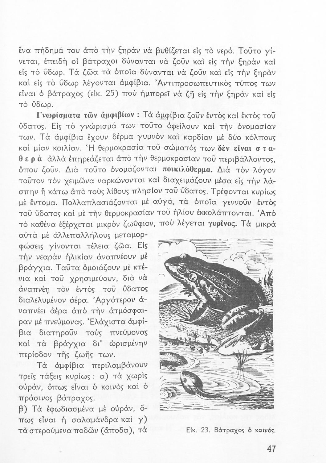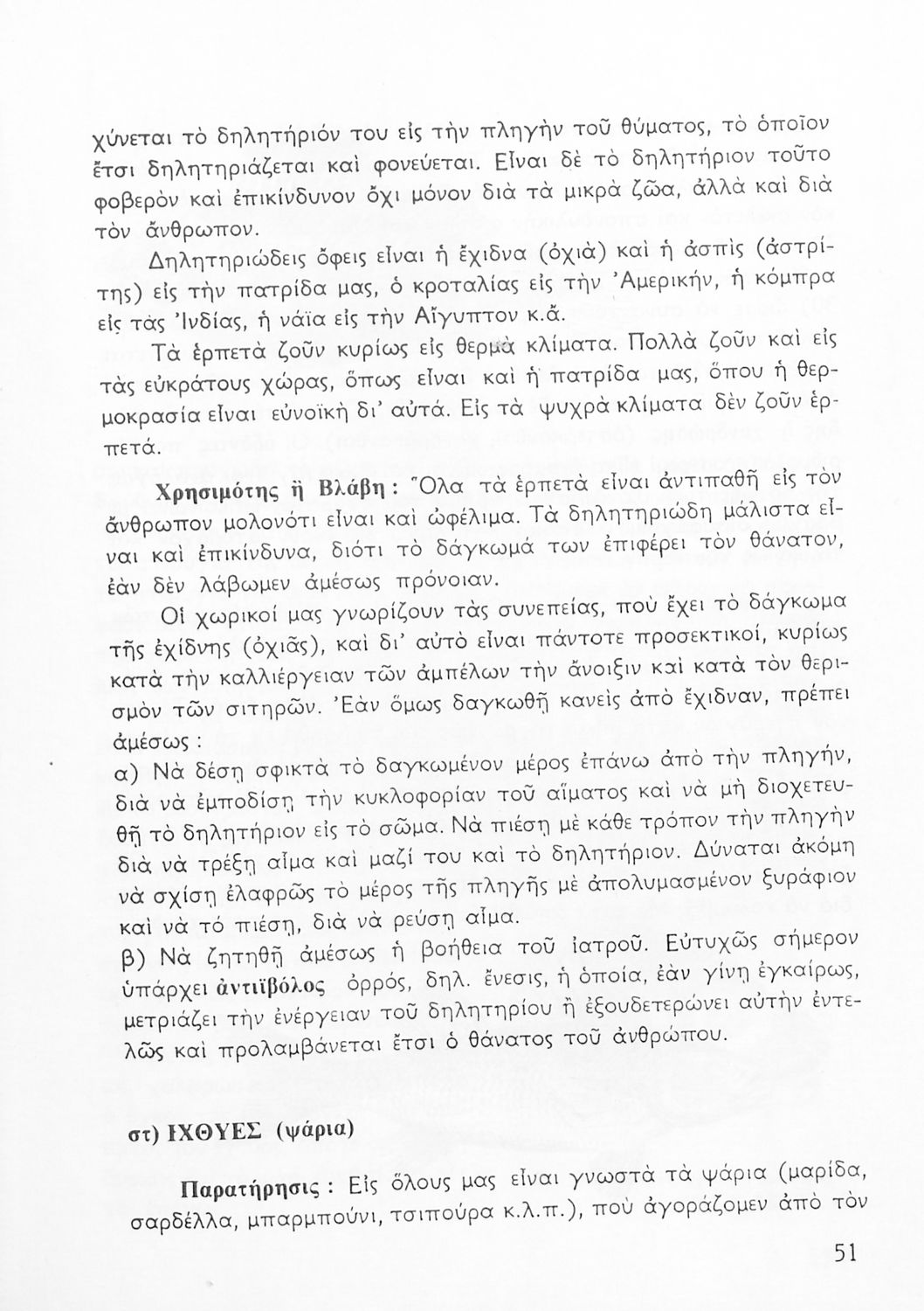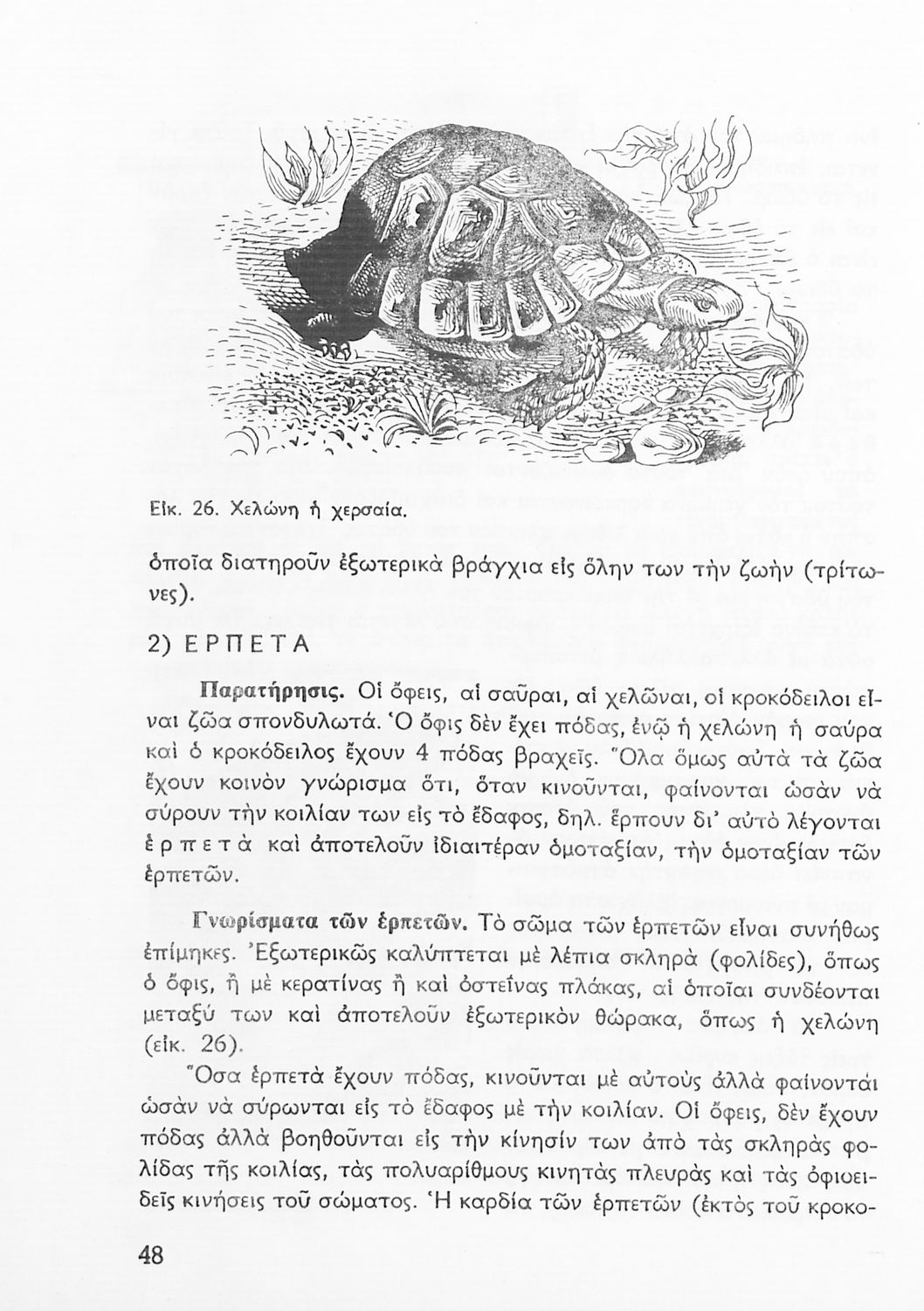 Σχολικό εγχειρίδιο Φυσικής Ιστορίας της ΣΤ΄ Δημοτικού το οποίο κάνει μια επισκόπηση της επιστημών της φυτολογίας, της ζωολογίας και της ανθρωπολογίας,. Κατηγοριοποιεί τα ζώα και παραθέτει βασικά γνωρίσματα κάθε κατηγορίας αλλά και τις σχέσεις εξάρτησης των ανθρώπων με κάθε είδος (πχ αλιεία, κτηνοτροφία) στο ελληνικό πλαίσιο. Το δεύτερο μέρος αναλύει τα μέρη του ανθρώπινου σώματος και εστιάζει σε ζητήματα υγιεινής.