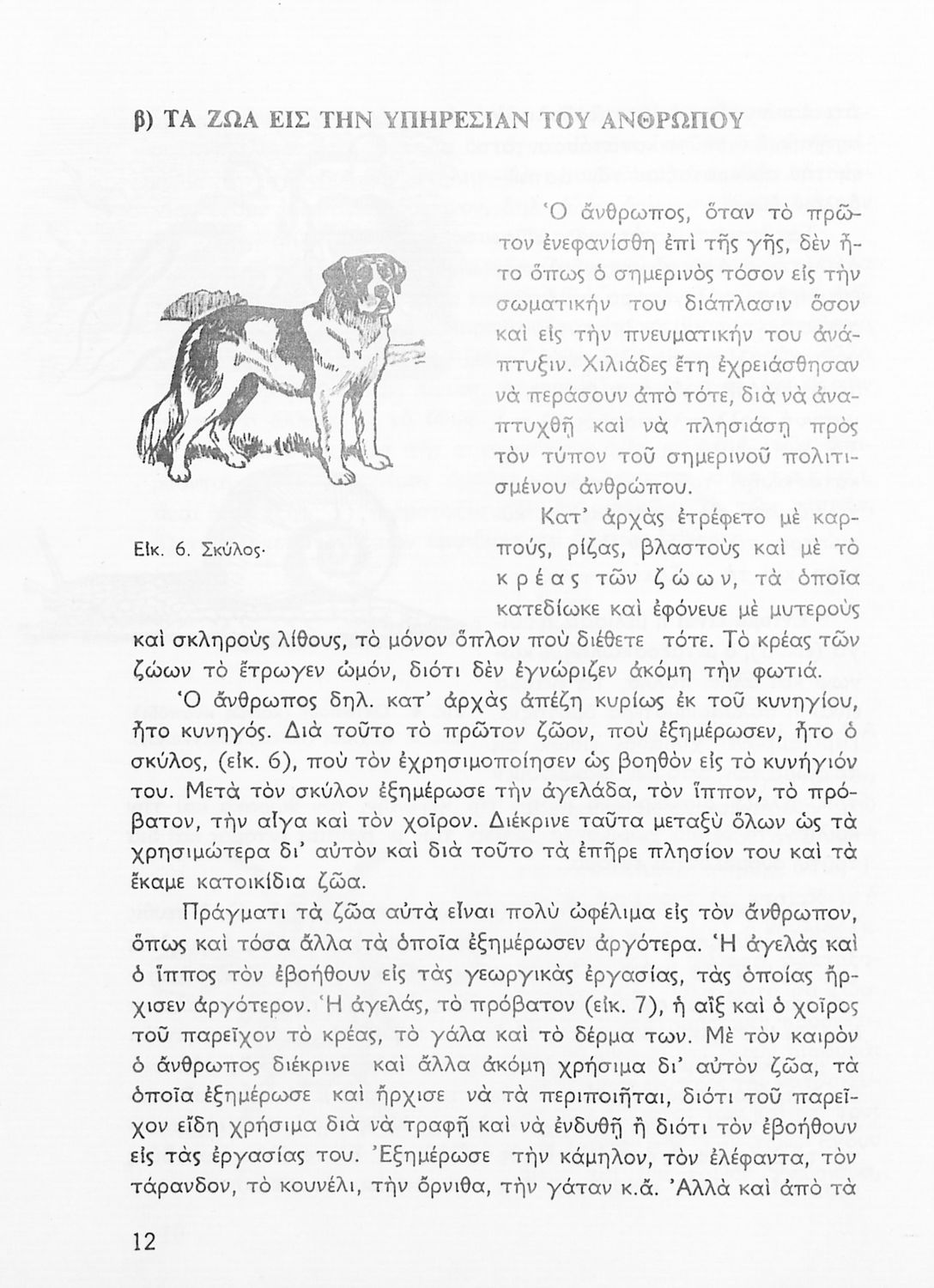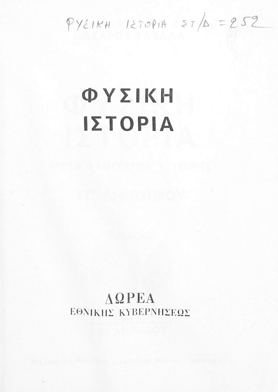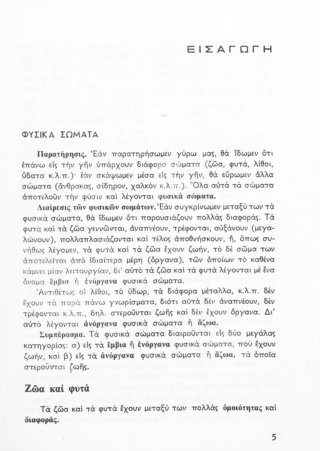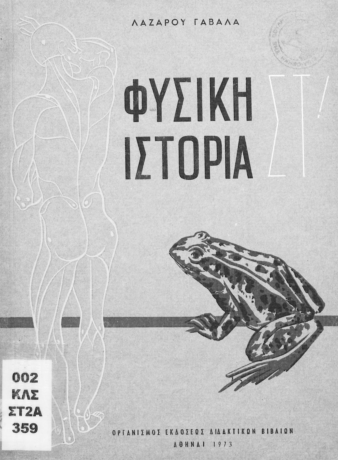 Σχολικό εγχειρίδιο Φυσικής Ιστορίας της ΣΤ΄ Δημοτικού το οποίο κάνει μια επισκόπηση της επιστημών της φυτολογίας, της ζωολογίας και της ανθρωπολογίας,. Κατηγοριοποιεί τα ζώα και παραθέτει βασικά γνωρίσματα κάθε κατηγορίας αλλά και τις σχέσεις εξάρτησης των ανθρώπων με κάθε είδος (πχ αλιεία, κτηνοτροφία) στο ελληνικό πλαίσιο. Το δεύτερο μέρος αναλύει τα μέρη του ανθρώπινου σώματος και εστιάζει σε ζητήματα υγιεινής.