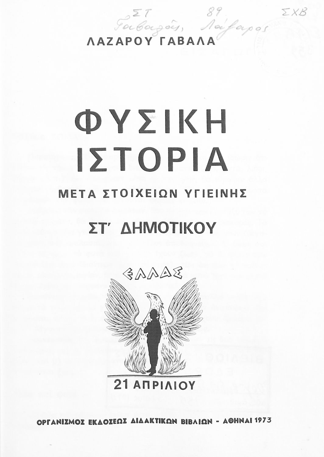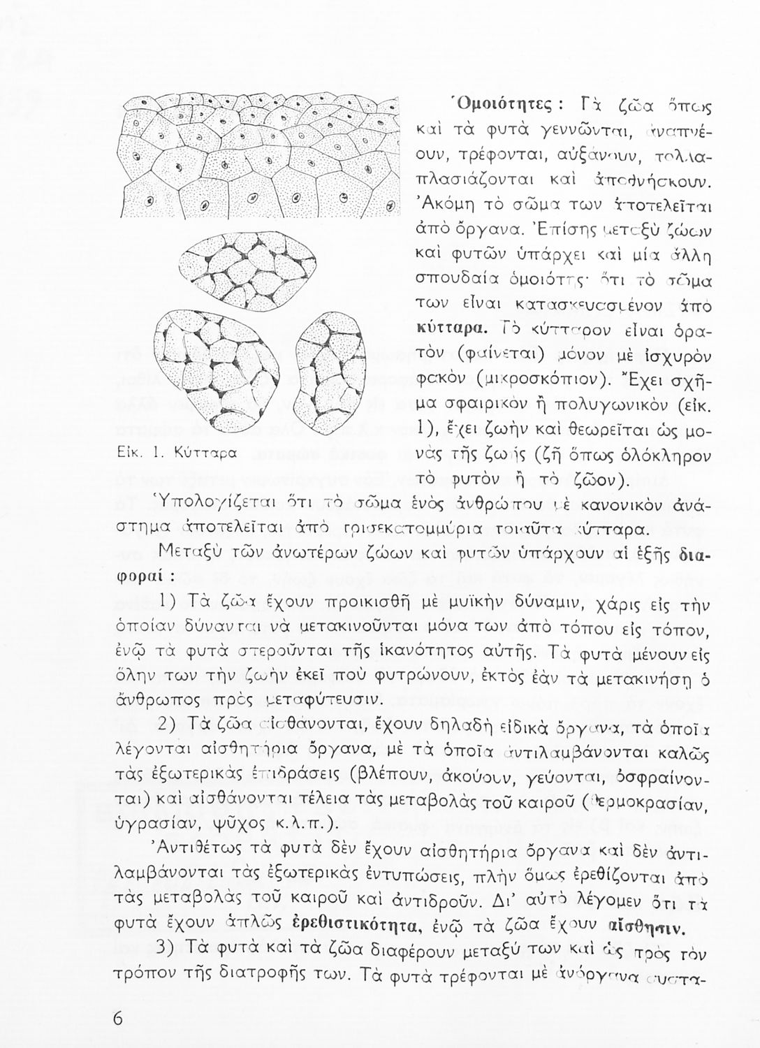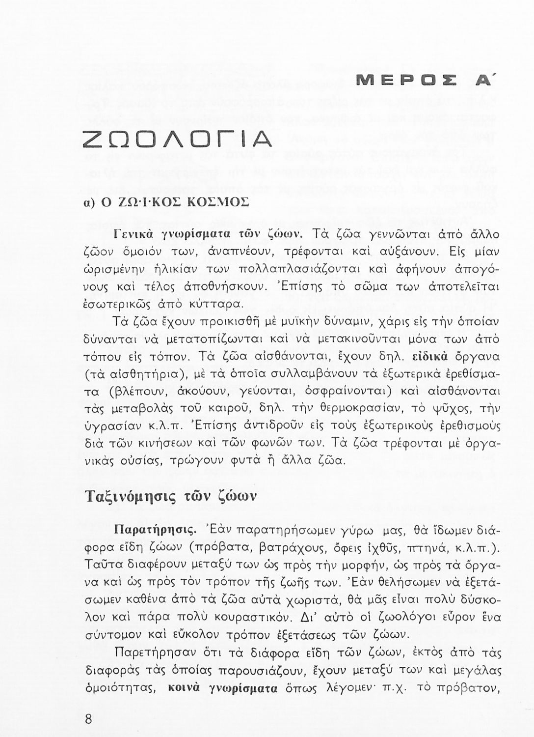 Σχολικό εγχειρίδιο Φυσικής Ιστορίας της ΣΤ΄ Δημοτικού το οποίο κάνει μια επισκόπηση της επιστημών της φυτολογίας, της ζωολογίας και της ανθρωπολογίας,. Κατηγοριοποιεί τα ζώα και παραθέτει βασικά γνωρίσματα κάθε κατηγορίας αλλά και τις σχέσεις εξάρτησης των ανθρώπων με κάθε είδος (πχ αλιεία, κτηνοτροφία) στο ελληνικό πλαίσιο. Το δεύτερο μέρος αναλύει τα μέρη του ανθρώπινου σώματος και εστιάζει σε ζητήματα υγιεινής.