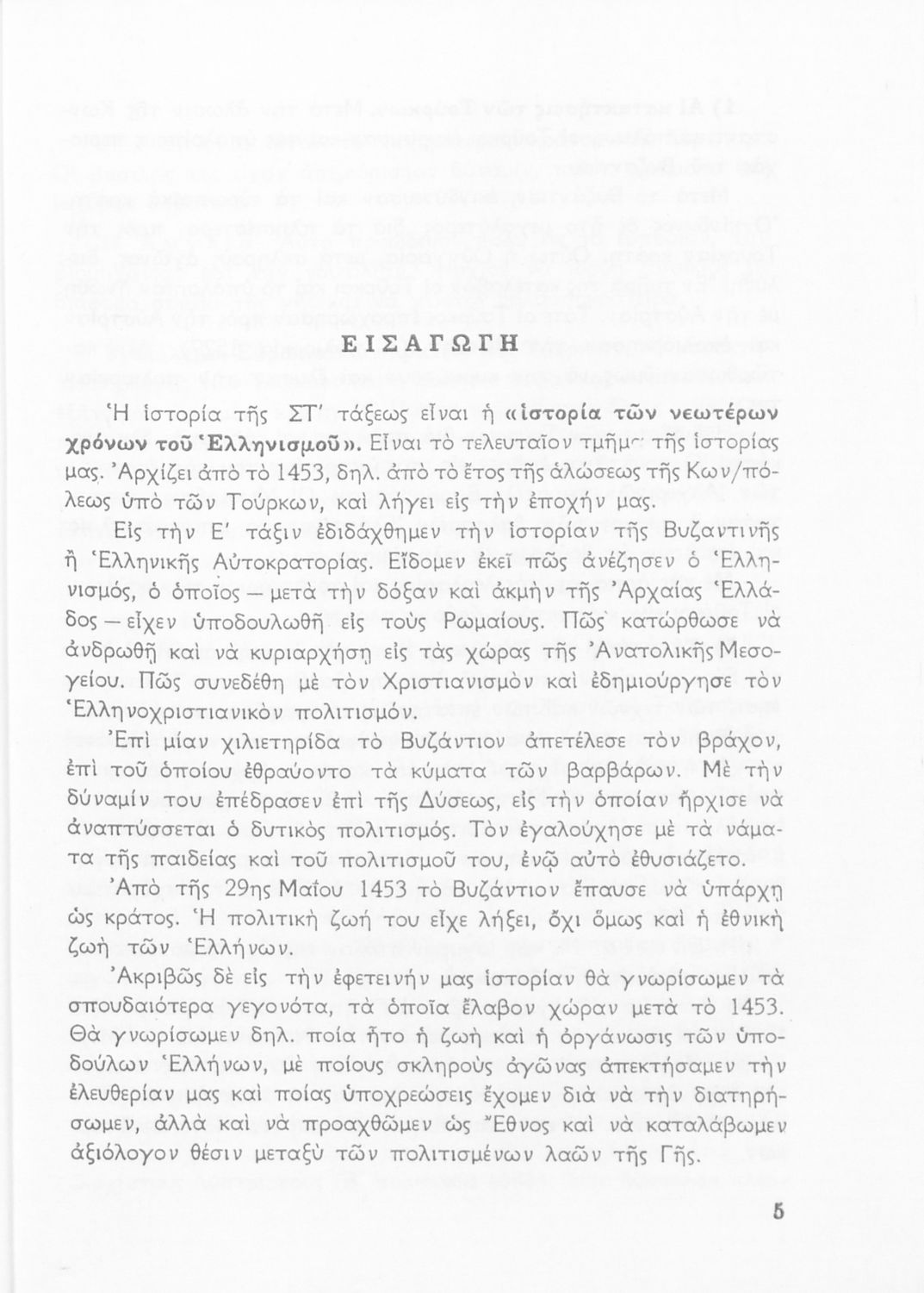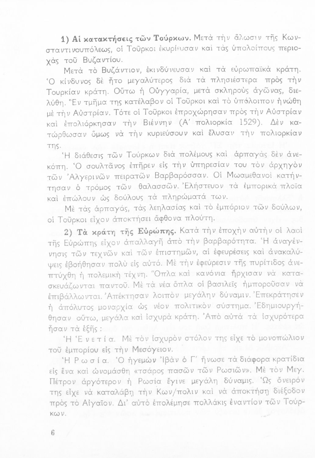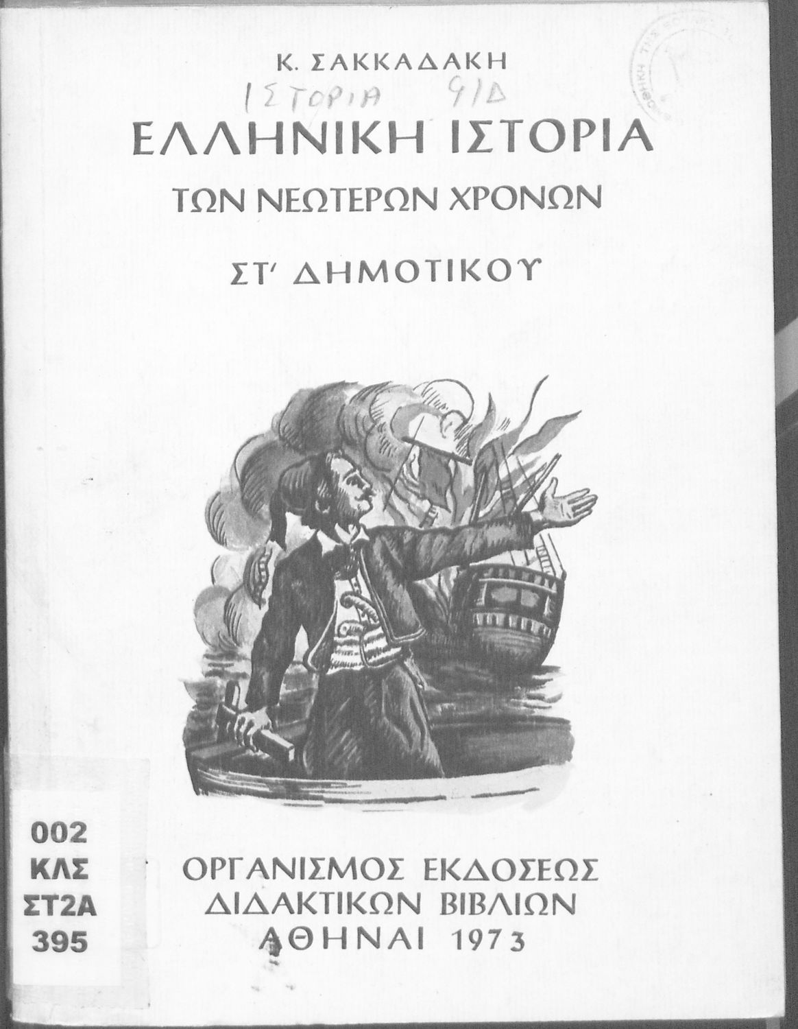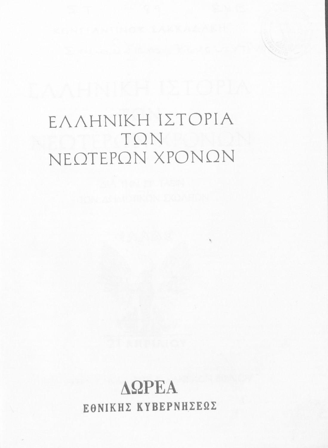 Σχολικό εγχειρίδιο Ιστορίας της ΣΤ΄ Δημοτικού που καλύπτει την περίοδο από την άλωση της Κωνσταντινούπολης μέχρι την δικτατορία των συνταγματαρχών. Υιοθετεί τον λόγο της χούντας και προβάλει τον εθνοσωτήριο χαρακτήρα και τα οικονομικά της επιτεύγματα. Φέρει το σύμβολο της δικτατορίας.