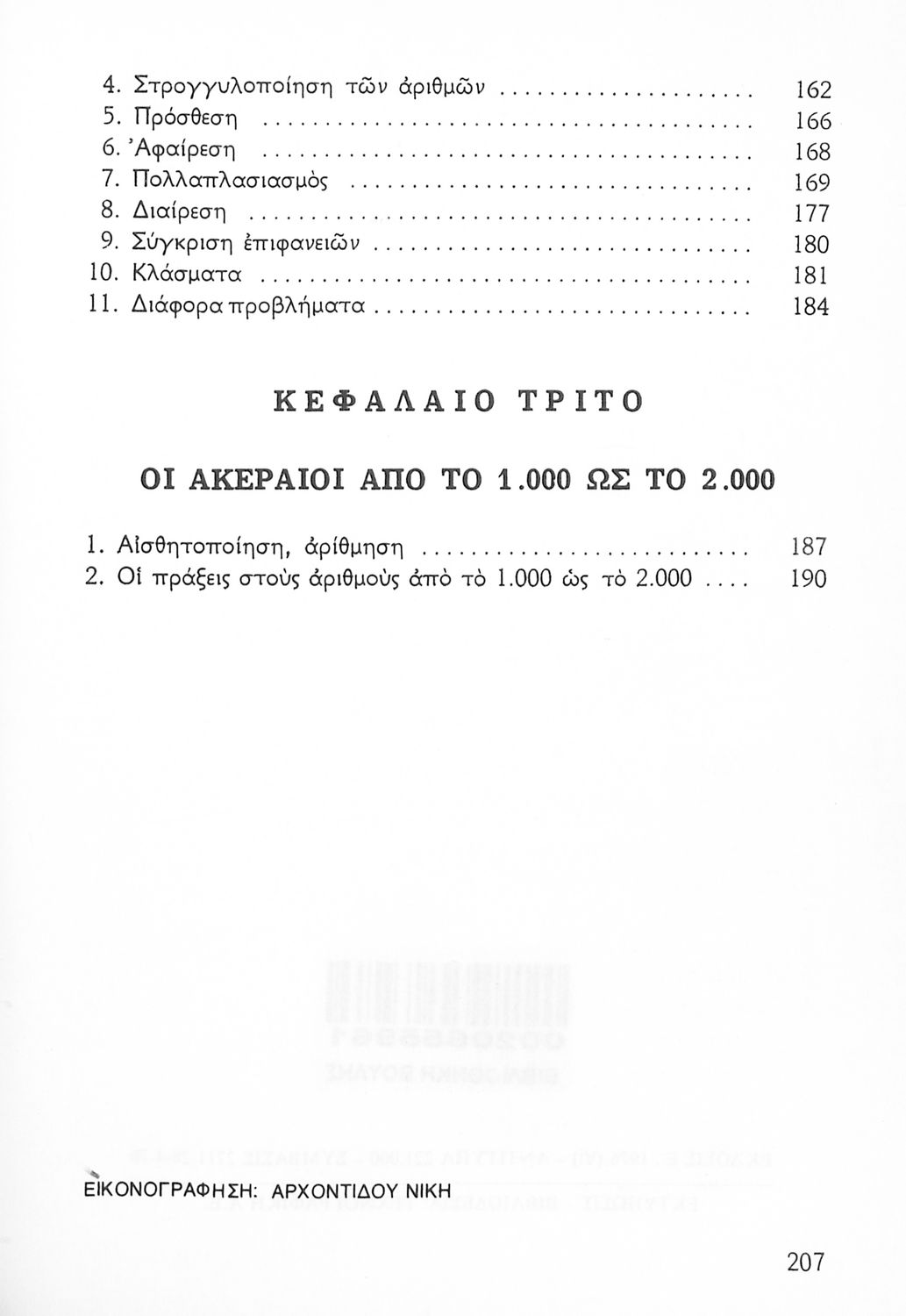 Σχολικό εγχειρίδιο Αριθμητικής για την Γ΄ Δημοτικού που περιλαμβάνει θεωρία, παραδείγματα και ασκήσεις και εστιάζει στις αριθμητικές πράξεις. Περιέχει και 11 σελίδες Γεωμετρίας. Φέρει το σύμβολο της ...