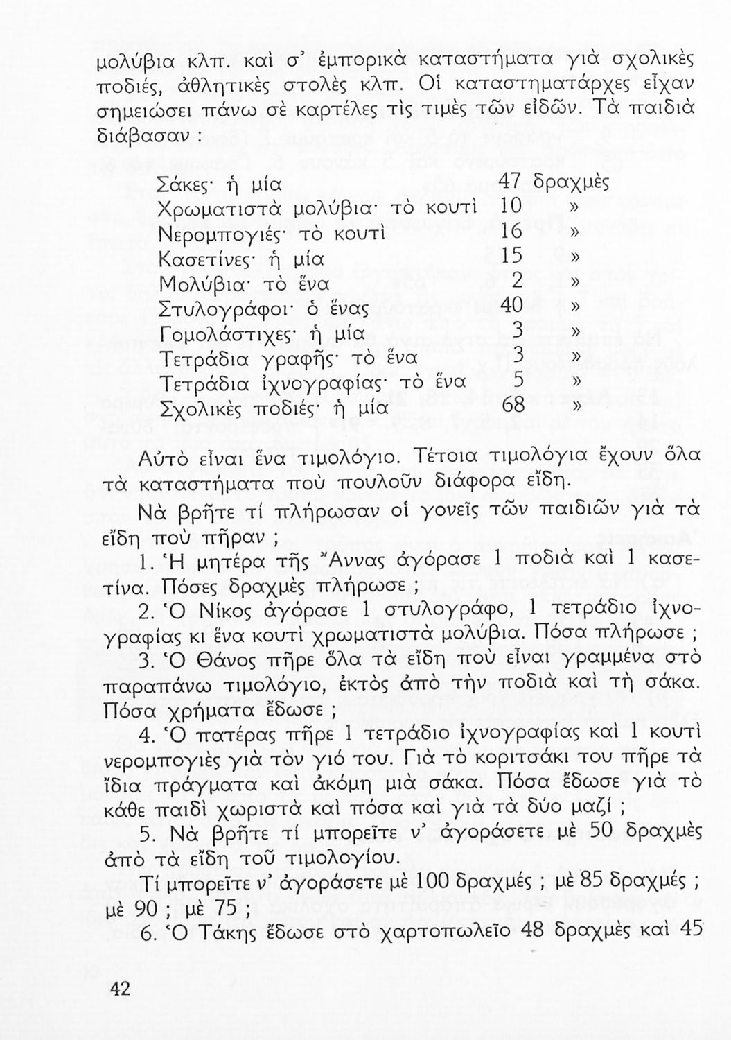 Σχολικό εγχειρίδιο Μαθηματικών ΣΤ΄ Δημοτικού που περιλαμβάνει ασκήσεις λογιστικού χαρακτήρα και ασκήσεις μέτρησης γεωμετρικών σχημάτων. Φέρει το σύμβολο της δικτατορίας.