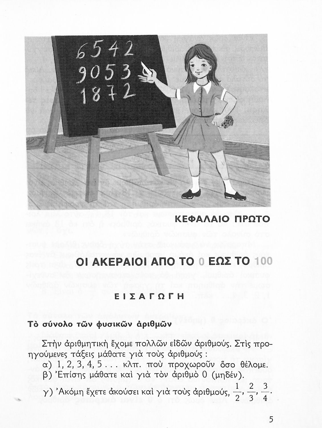 Σχολικό εγχειρίδιο Μαθηματικών Ε΄ Δημοτικού που συνδυάζει Αριθμητική και Γεωμετρία και εστιάζει στις πράξεις με ακέραιους και συμμιγείς αριθμούς και τη μέτρηση γεωμετρικών στερεών.