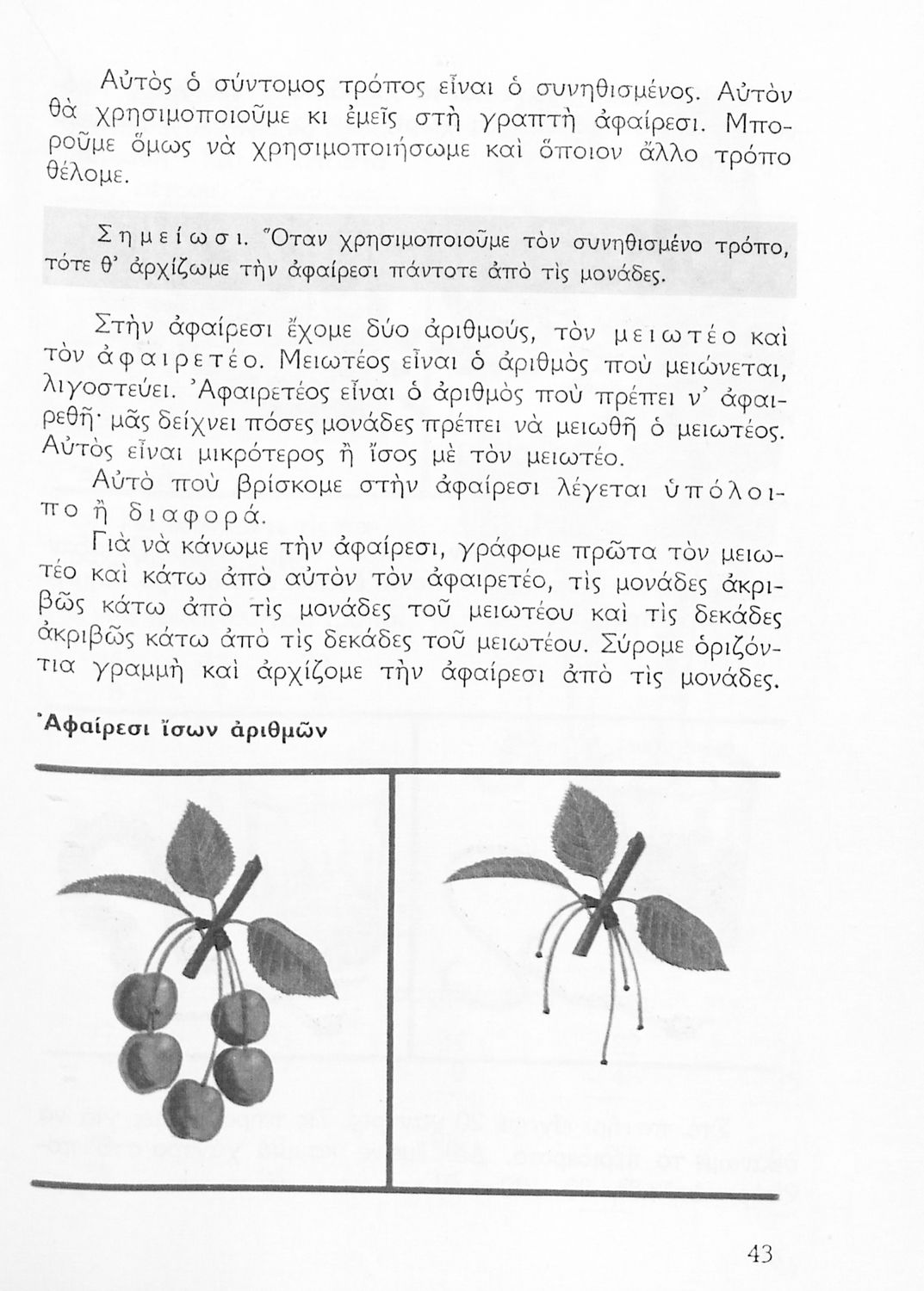Σχολικό εγχειρίδιο Αριθμητικής για την Γ΄ Δημοτικού που περιλαμβάνει θεωρία, παραδείγματα και ασκήσεις και εστιάζει στις αριθμητικές πράξεις. Περιέχει και 11 σελίδες Γεωμετρίας. Φέρει το σύμβολο της δικτατορίας.