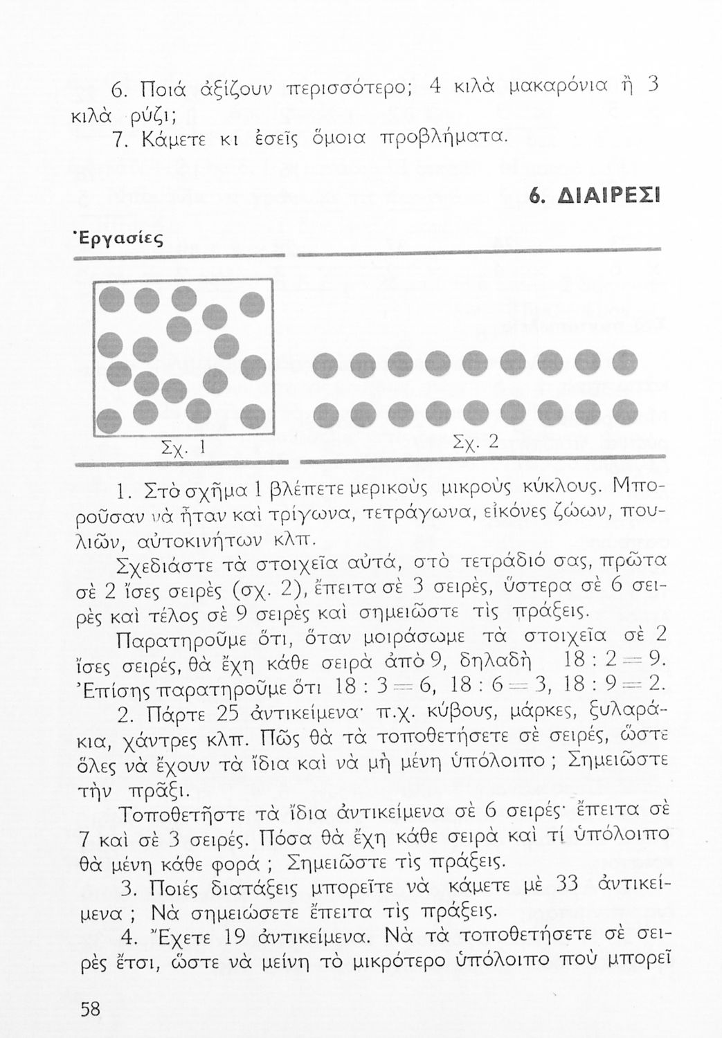 Σχολικό εγχειρίδιο Μαθηματικών ΣΤ΄ Δημοτικού που περιλαμβάνει ασκήσεις λογιστικού χαρακτήρα και ασκήσεις μέτρησης γεωμετρικών σχημάτων. Φέρει το σύμβολο της δικτατορίας.