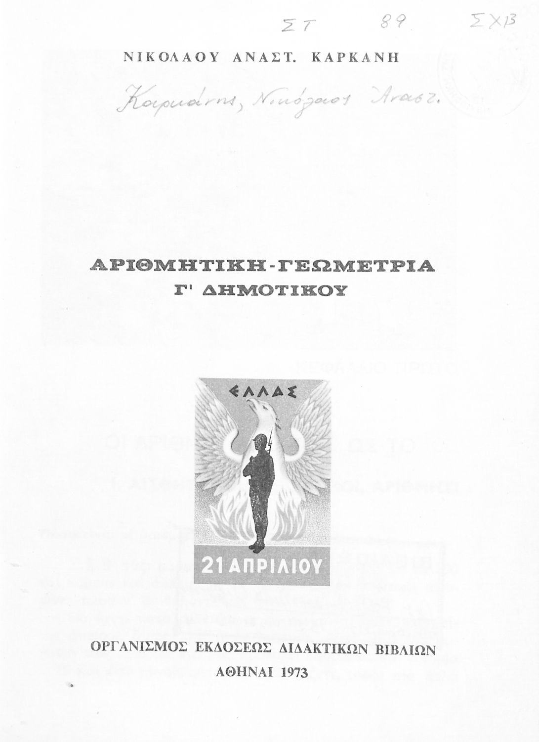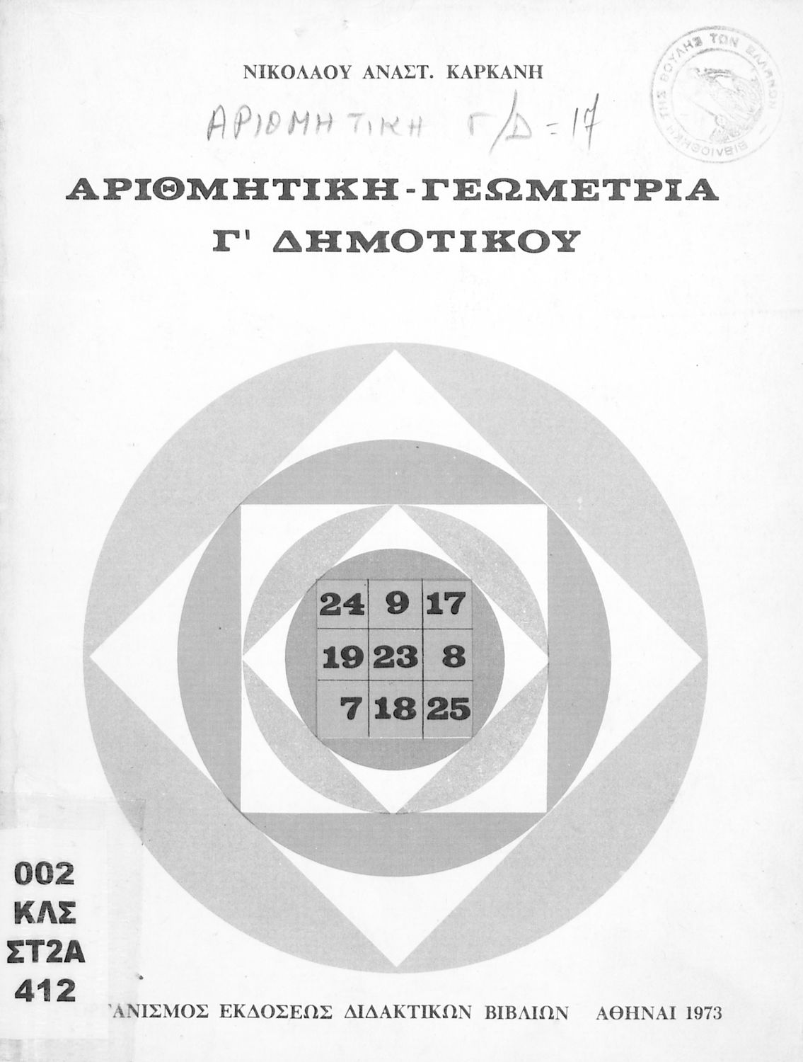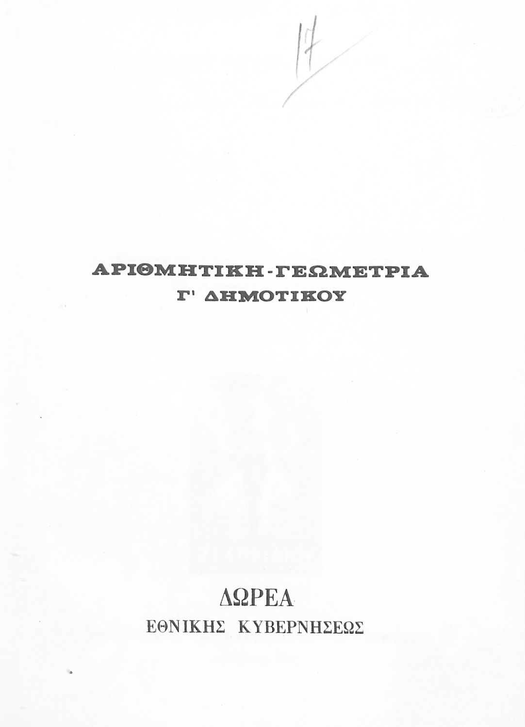 Παρουσίαση περιεχομένου: Σχολικό εγχειρίδιο Αριθμητικής για την Γ΄ Δημοτικού που περιλαμβάνει θεωρία, παραδείγματα και ασκήσεις και εστιάζει στις αριθμητικές πράξεις. Περιέχει και 11 σελίδες Γεωμετρίας. Φέρει το σύμβολο της δικτατορίας.