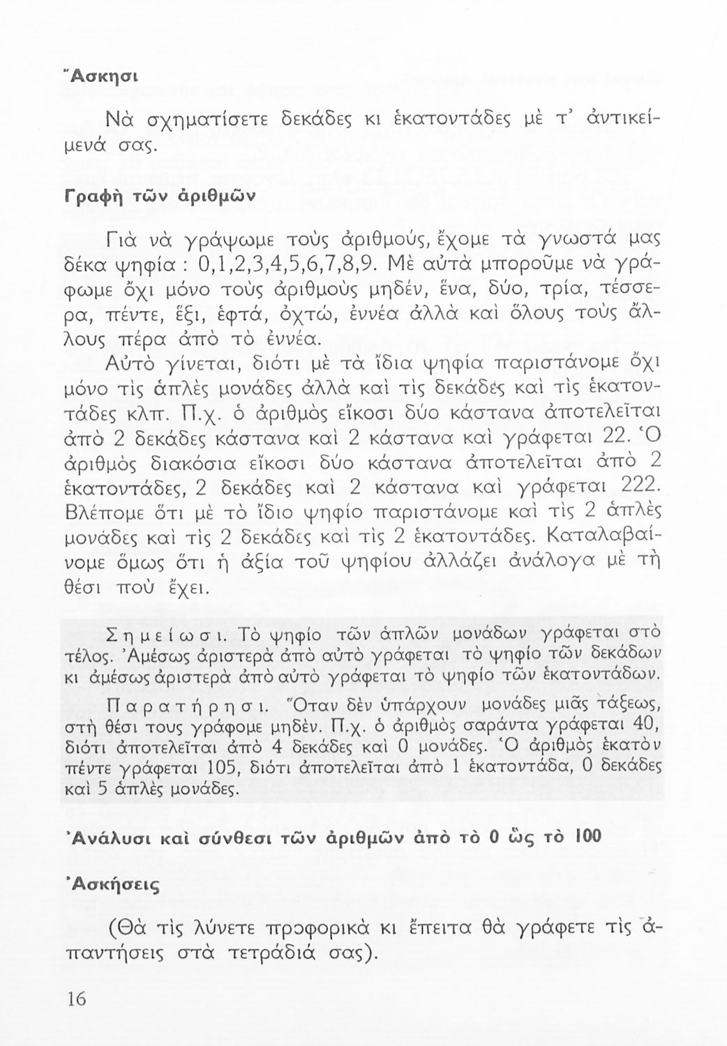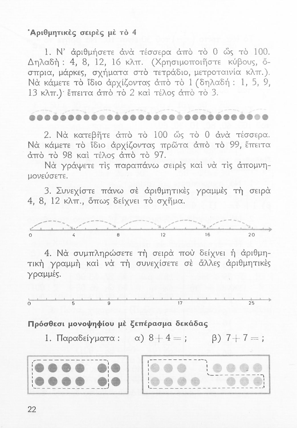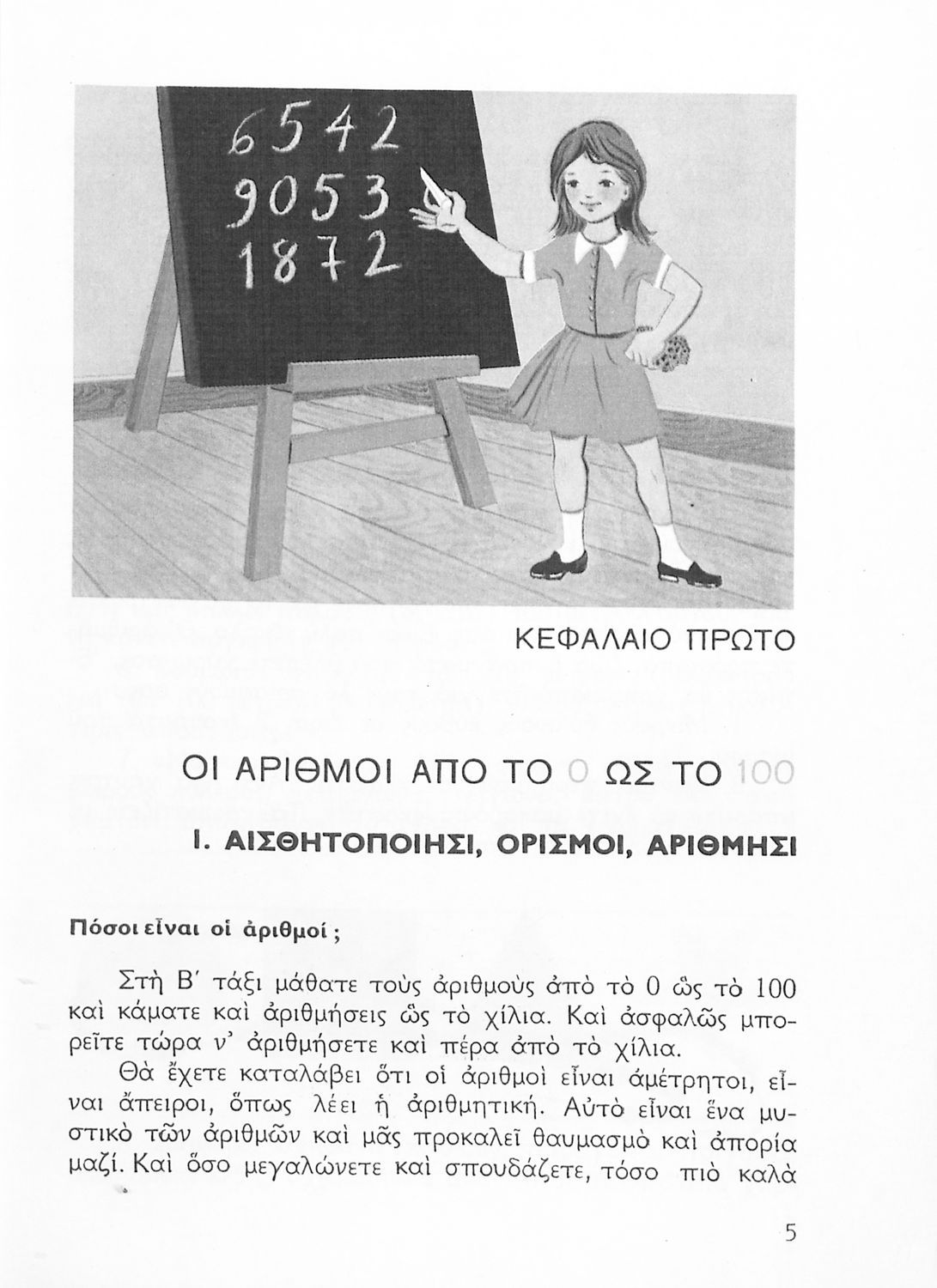 Σχολικό εγχειρίδιο Αριθμητικής για την Γ΄ Δημοτικού που περιλαμβάνει θεωρία, παραδείγματα και ασκήσεις και εστιάζει στις αριθμητικές πράξεις. Περιέχει και 11 σελίδες Γεωμετρίας. Φέρει το σύμβολο της δικτατορίας.