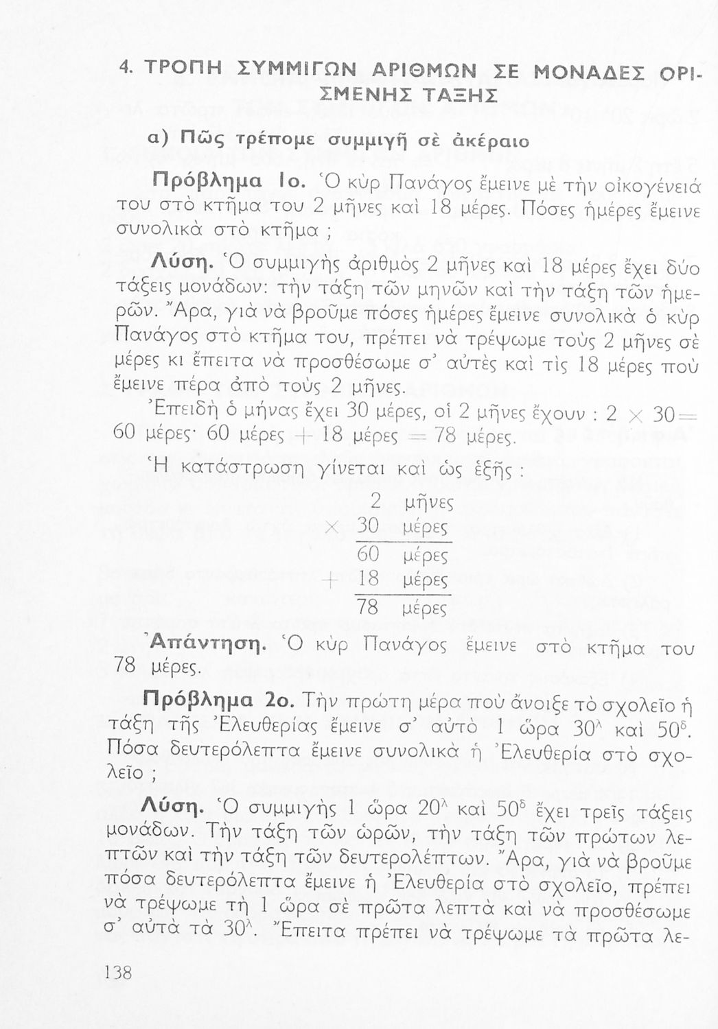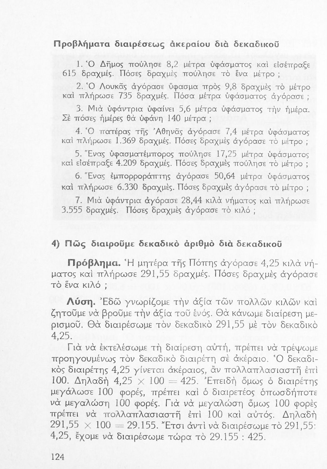 Σχολικό εγχειρίδιο Αριθμητικής Δ΄ Δημοτικού χωρισμένο σε πρακτικά προβλήματα και τις λύσεις τους που εστιάζει στις πράξεις με ακέραιους και συμμιγείς αριθμούς και περιλαμβάνει στοιχεία Γεωμετρίας.
