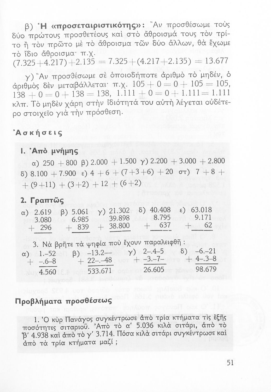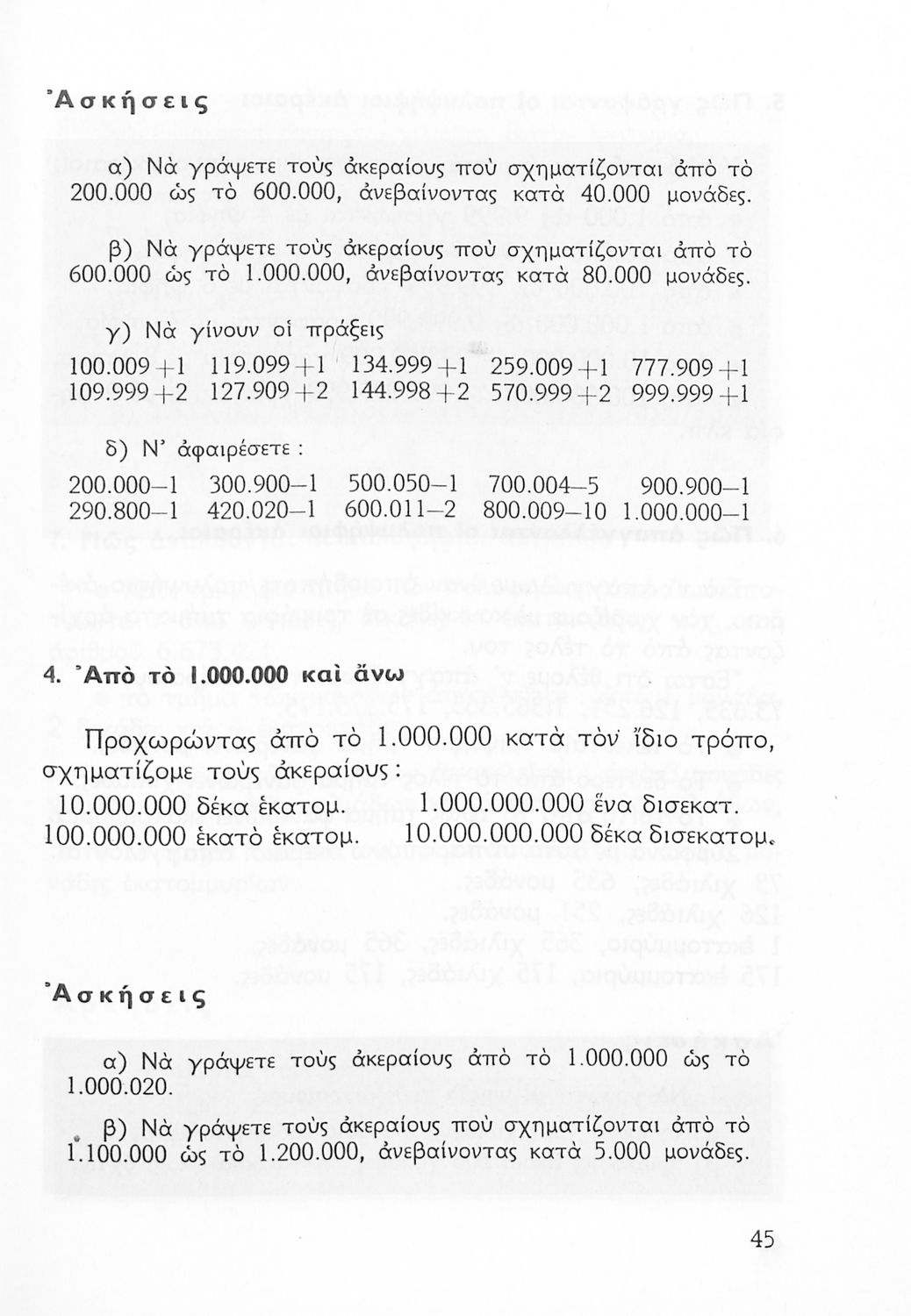 Σχολικό εγχειρίδιο Αριθμητικής Δ΄ Δημοτικού χωρισμένο σε πρακτικά προβλήματα και τις λύσεις τους που εστιάζει στις πράξεις με ακέραιους και συμμιγείς αριθμούς και περιλαμβάνει στοιχεία Γεωμετρίας.