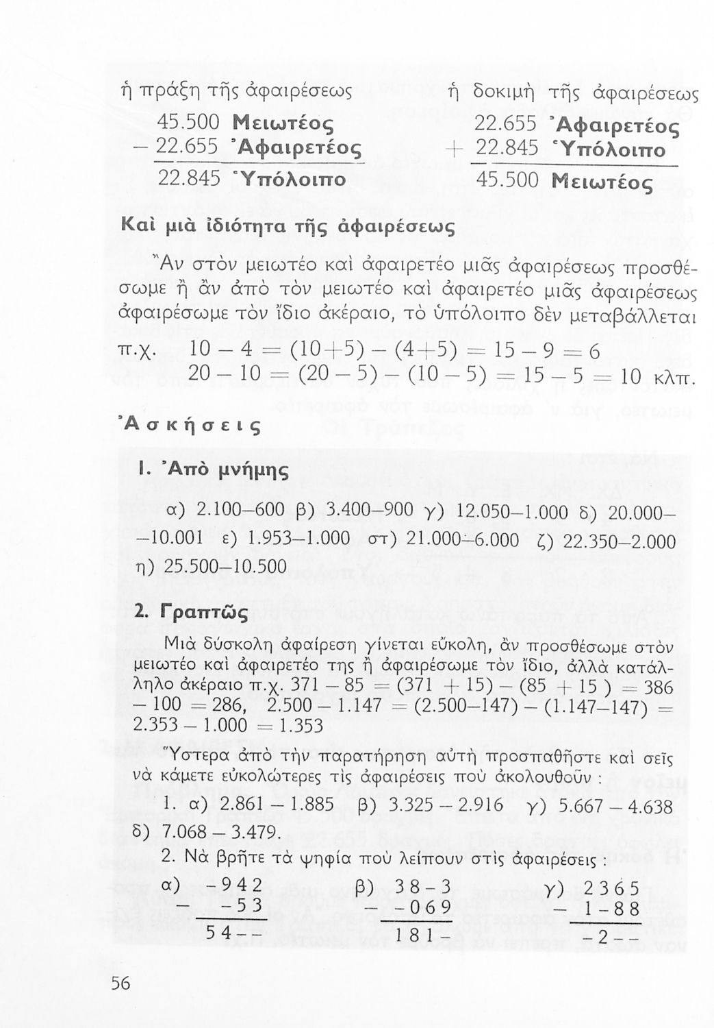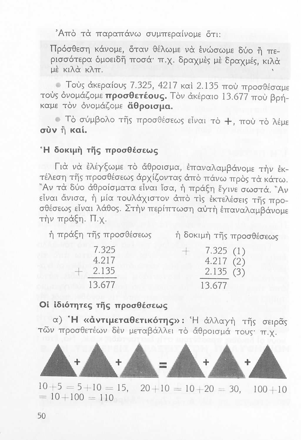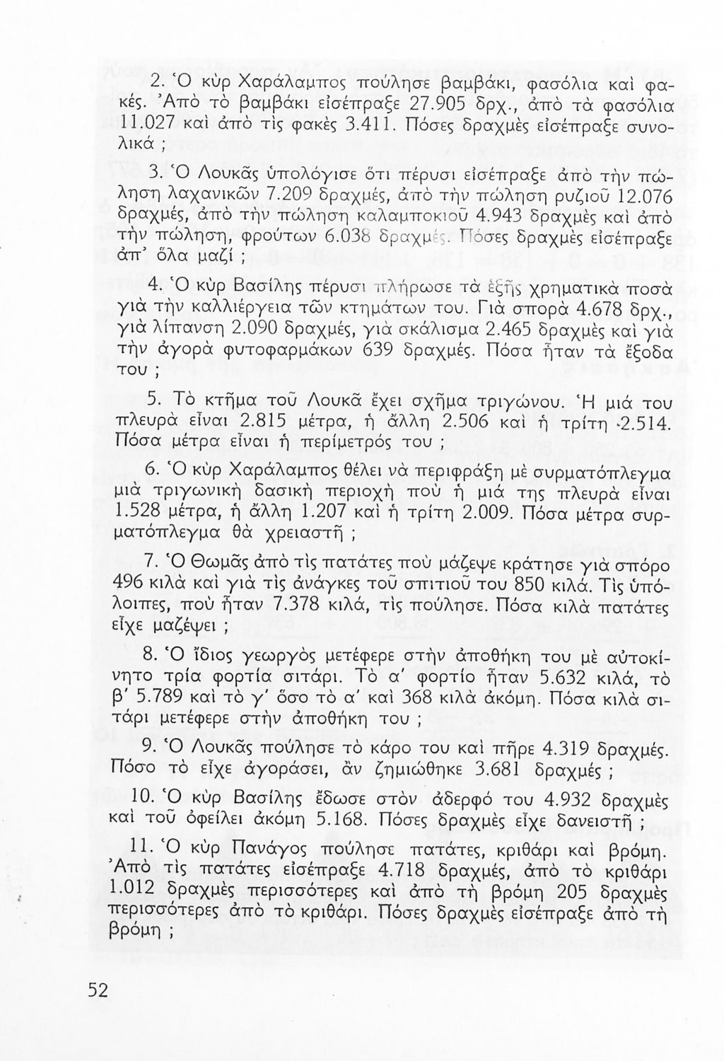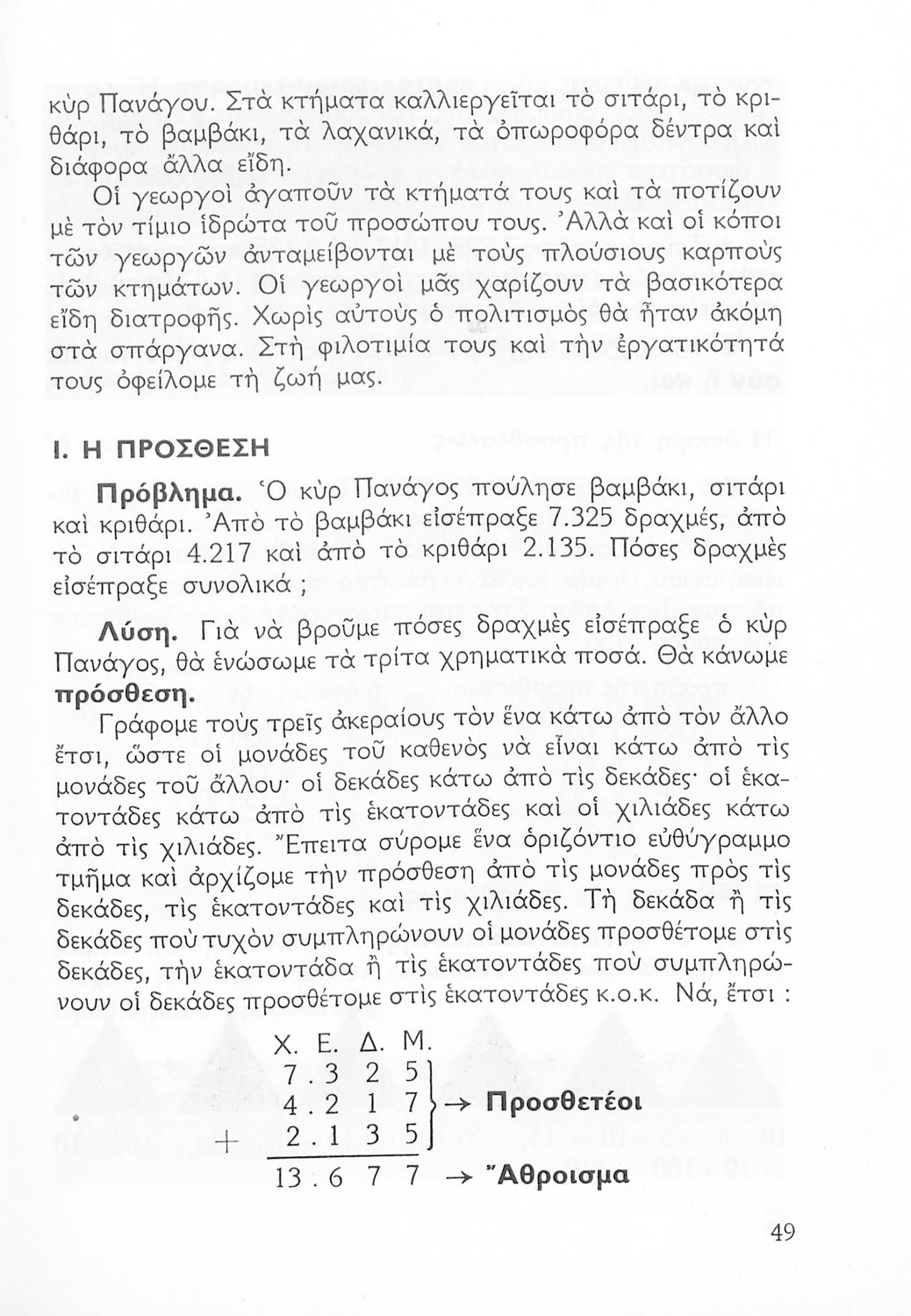 Σχολικό εγχειρίδιο Αριθμητικής Δ΄ Δημοτικού χωρισμένο σε πρακτικά προβλήματα και τις λύσεις τους που περιλαμβάνει και κάποια στοιχεία Γεωμετρίας.