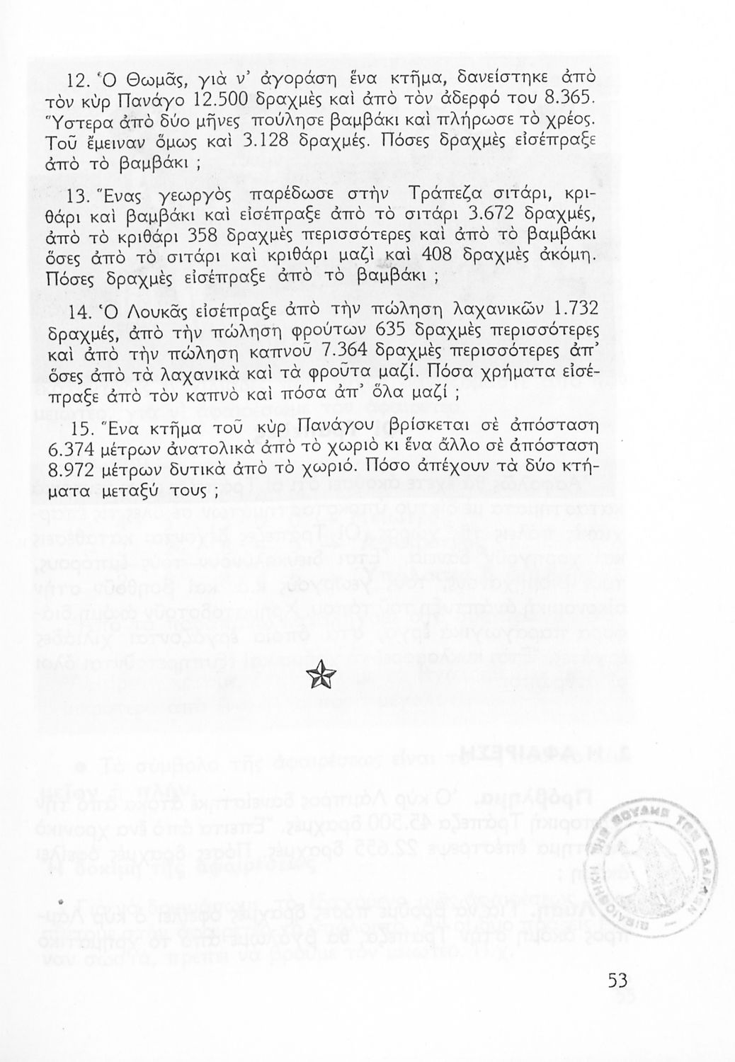 Σχολικό εγχειρίδιο Μαθηματικών ΣΤ΄ Δημοτικού που περιλαμβάνει ασκήσεις λογιστικού χαρακτήρα και ασκήσεις μέτρησης γεωμετρικών σχημάτων. Φέρει το σύμβολο της δικτατορίας.