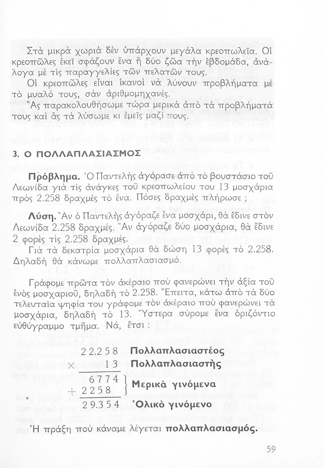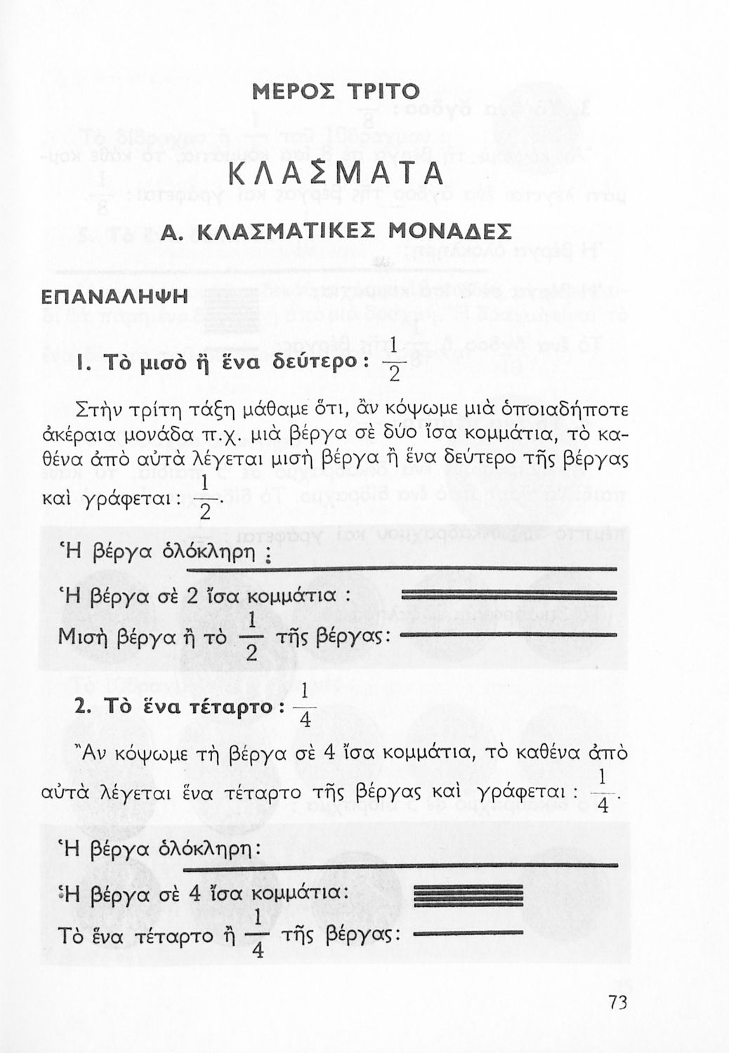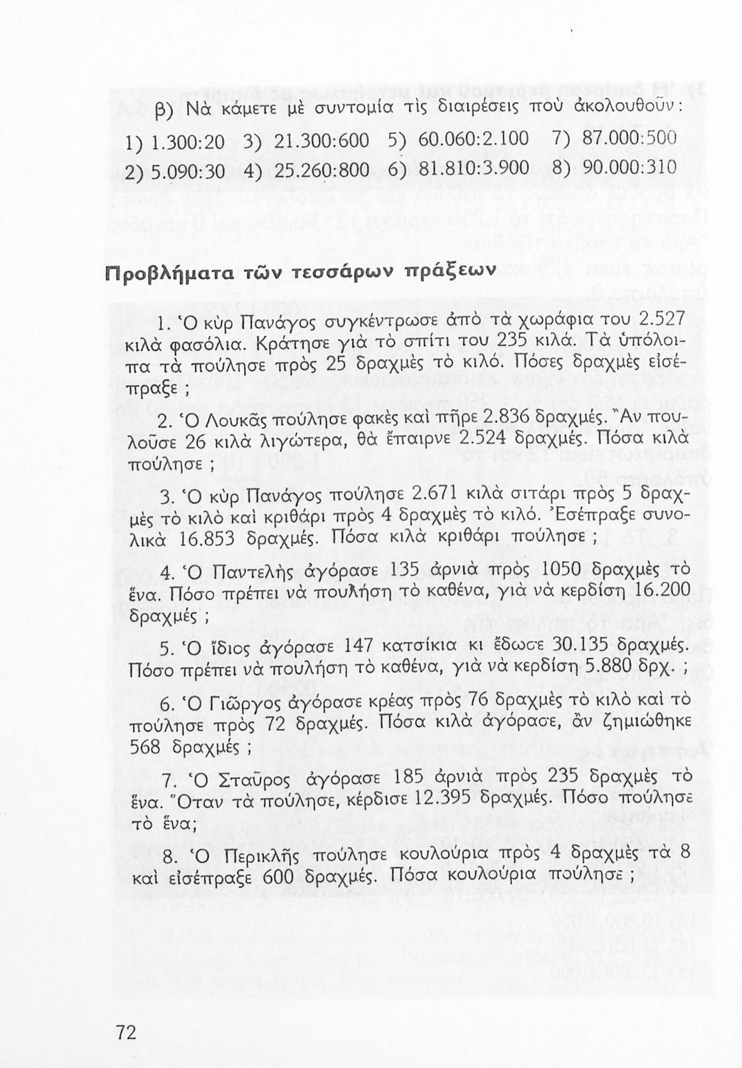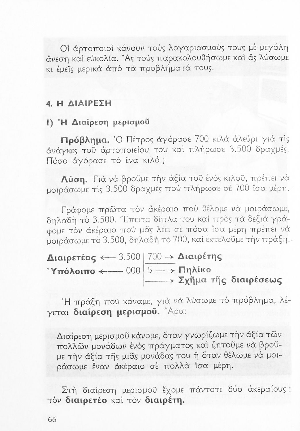 Σχολικό εγχειρίδιο Αριθμητικής Δ΄ Δημοτικού χωρισμένο σε πρακτικά προβλήματα και τις λύσεις τους που περιλαμβάνει και κάποια στοιχεία Γεωμετρίας.