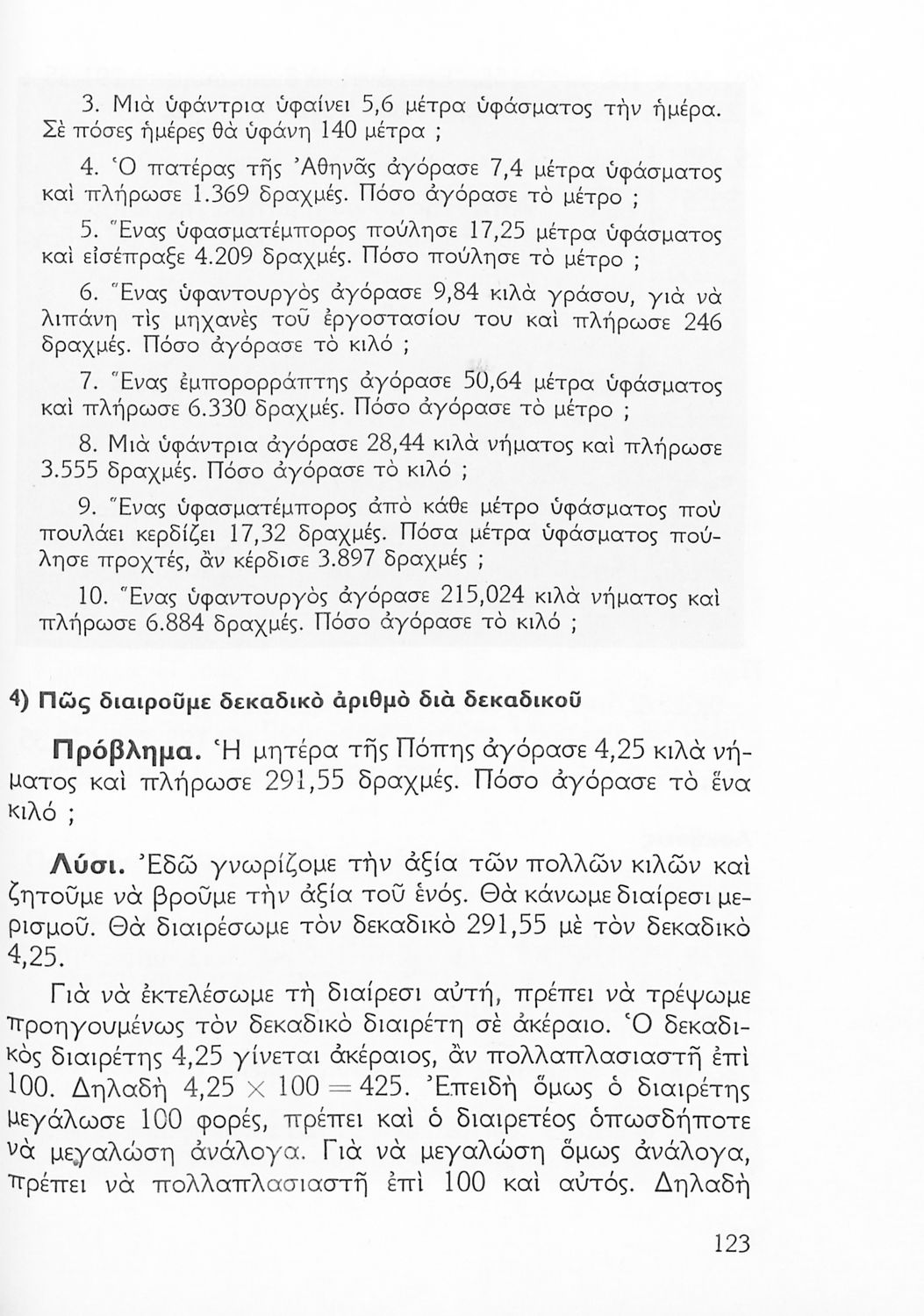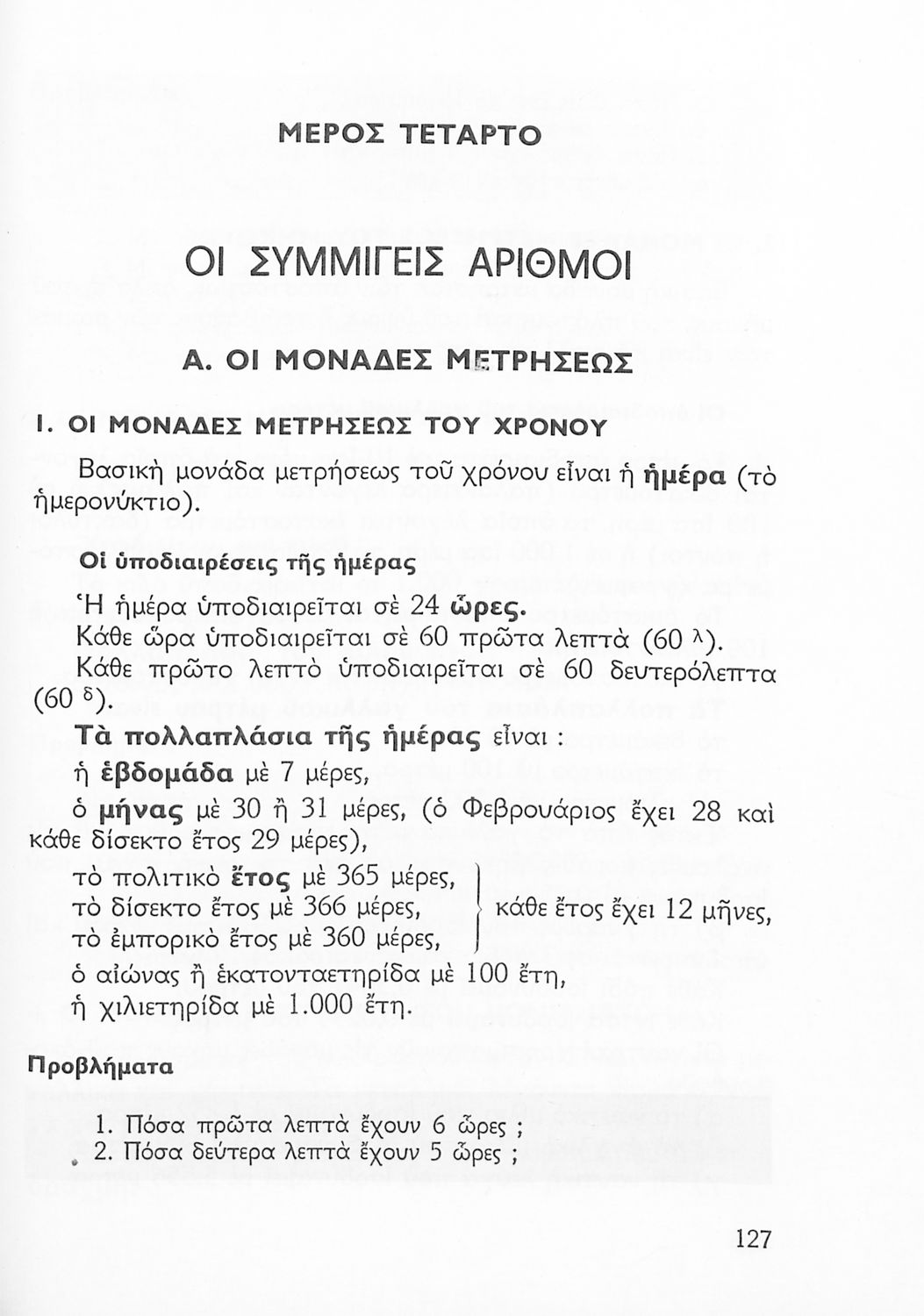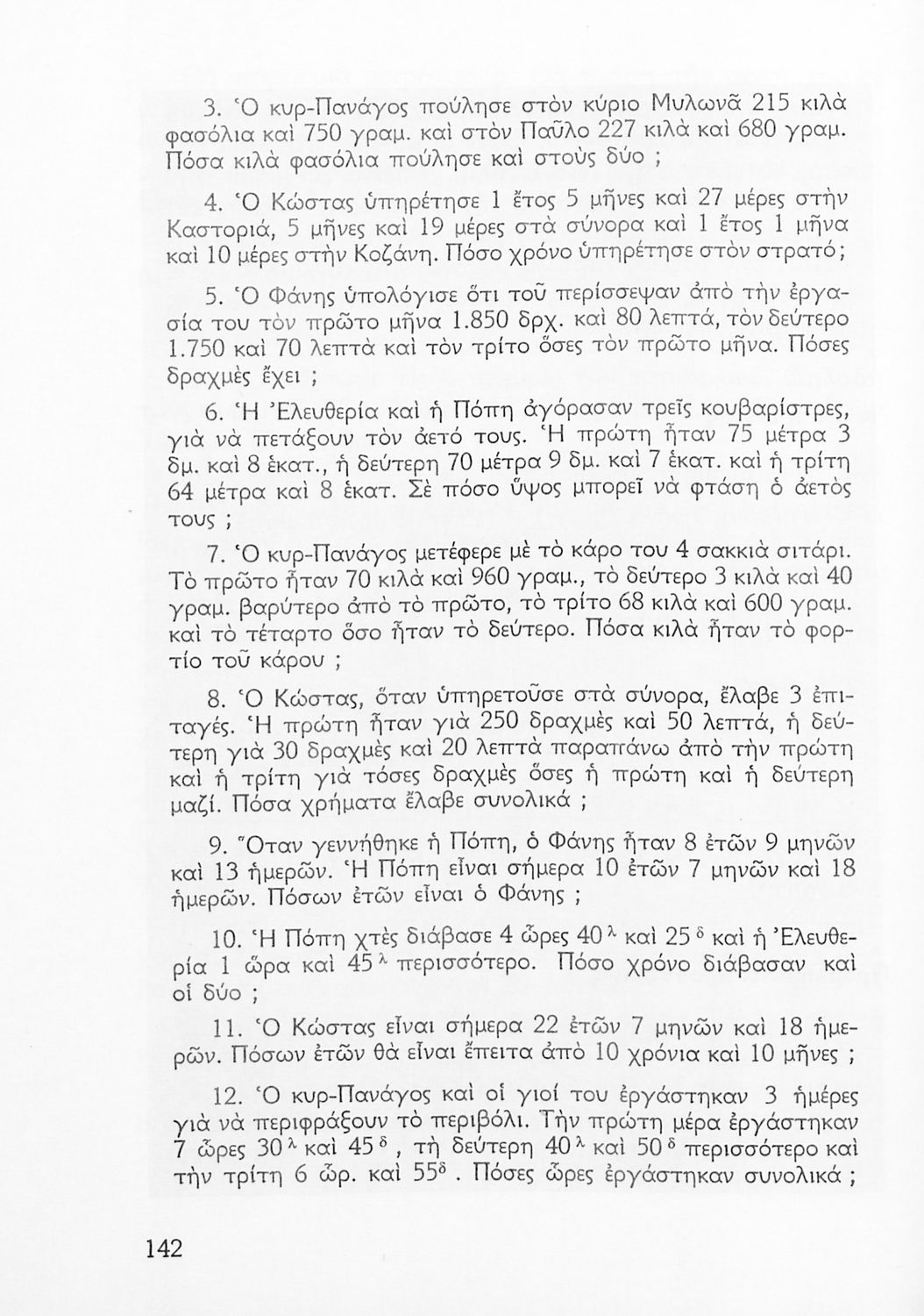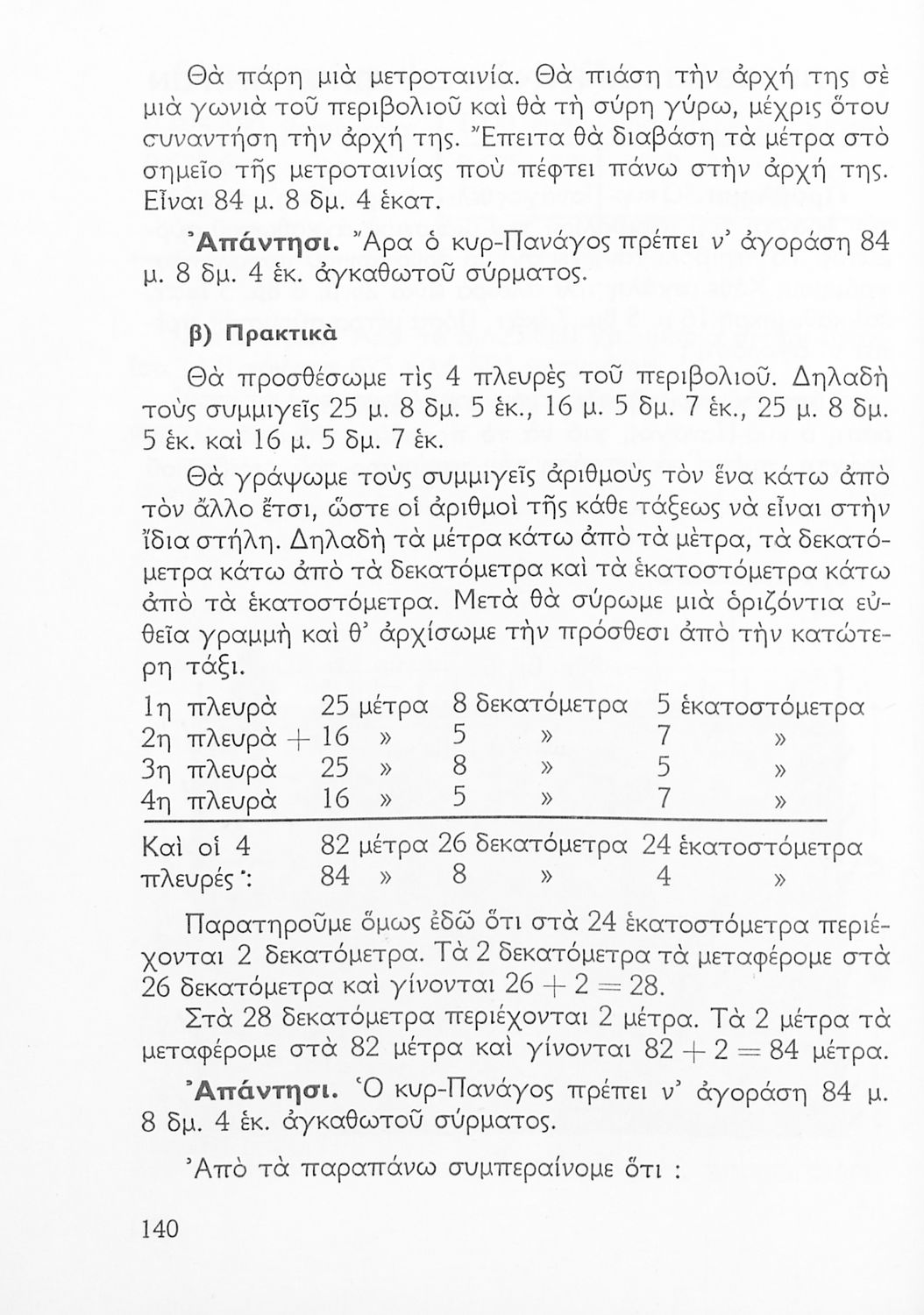 Σχολικό εγχειρίδιο Αριθμητικής Δ΄ Δημοτικού χωρισμένο σε πρακτικά προβλήματα και τις λύσεις τους που περιλαμβάνει και κάποια στοιχεία Γεωμετρίας.