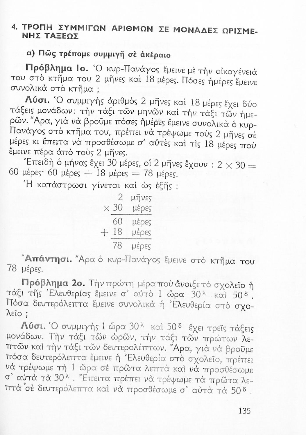 Σχολικό εγχειρίδιο Αριθμητικής Δ΄ Δημοτικού χωρισμένο σε πρακτικά προβλήματα και τις λύσεις τους που εστιάζει στις πράξεις με ακέραιους και συμμιγείς αριθμούς και περιλαμβάνει στοιχεία Γεωμετρίας.