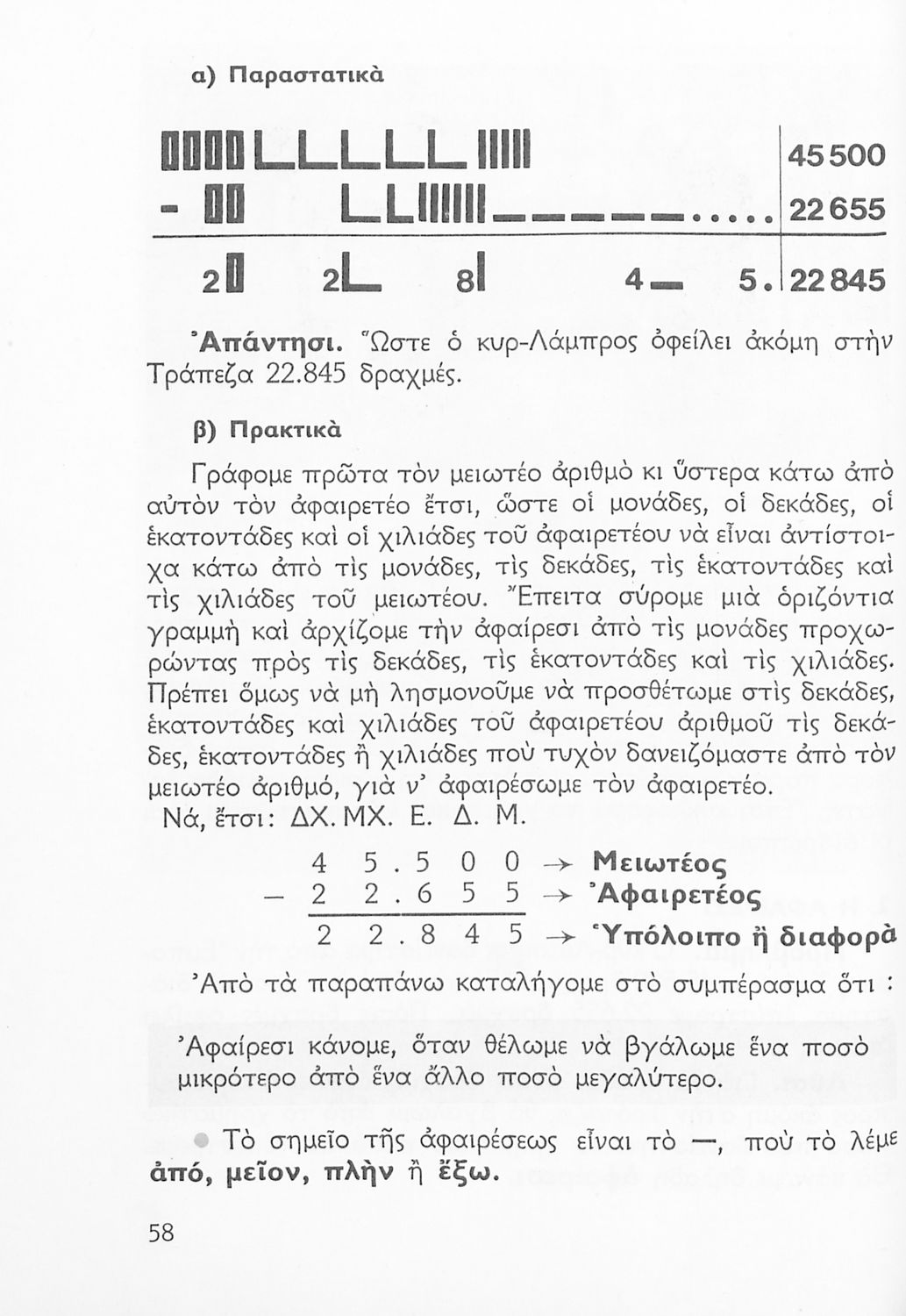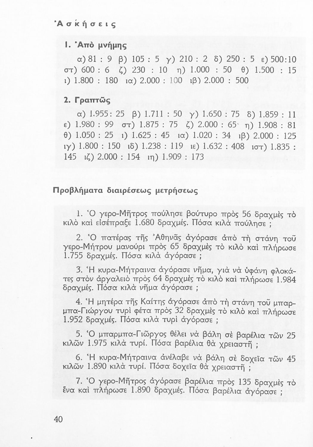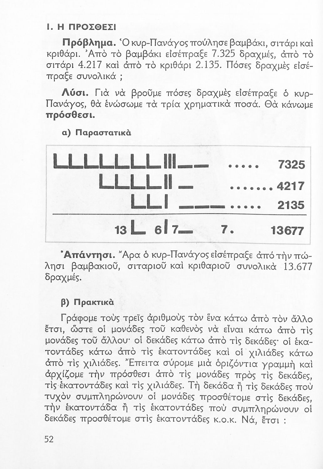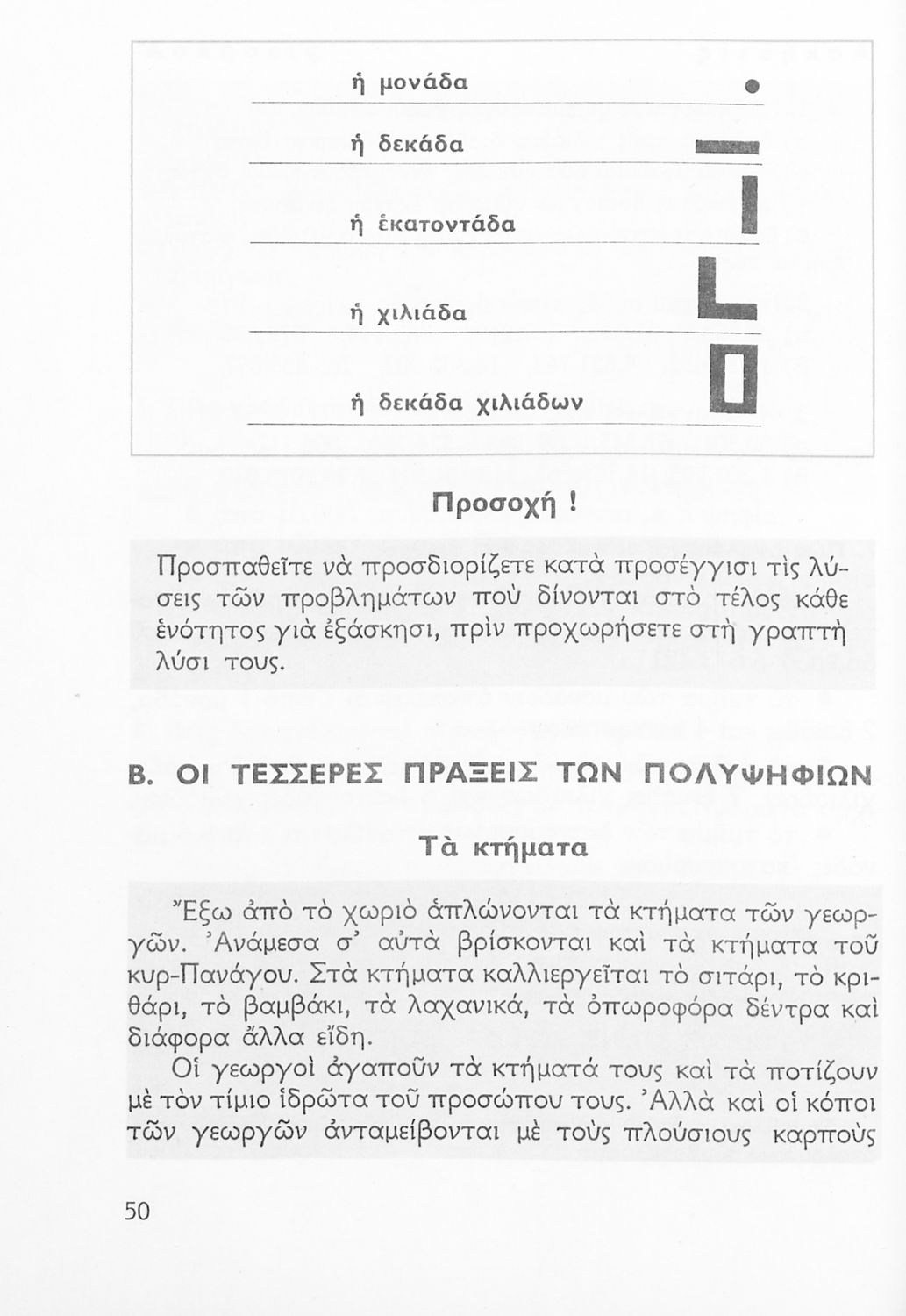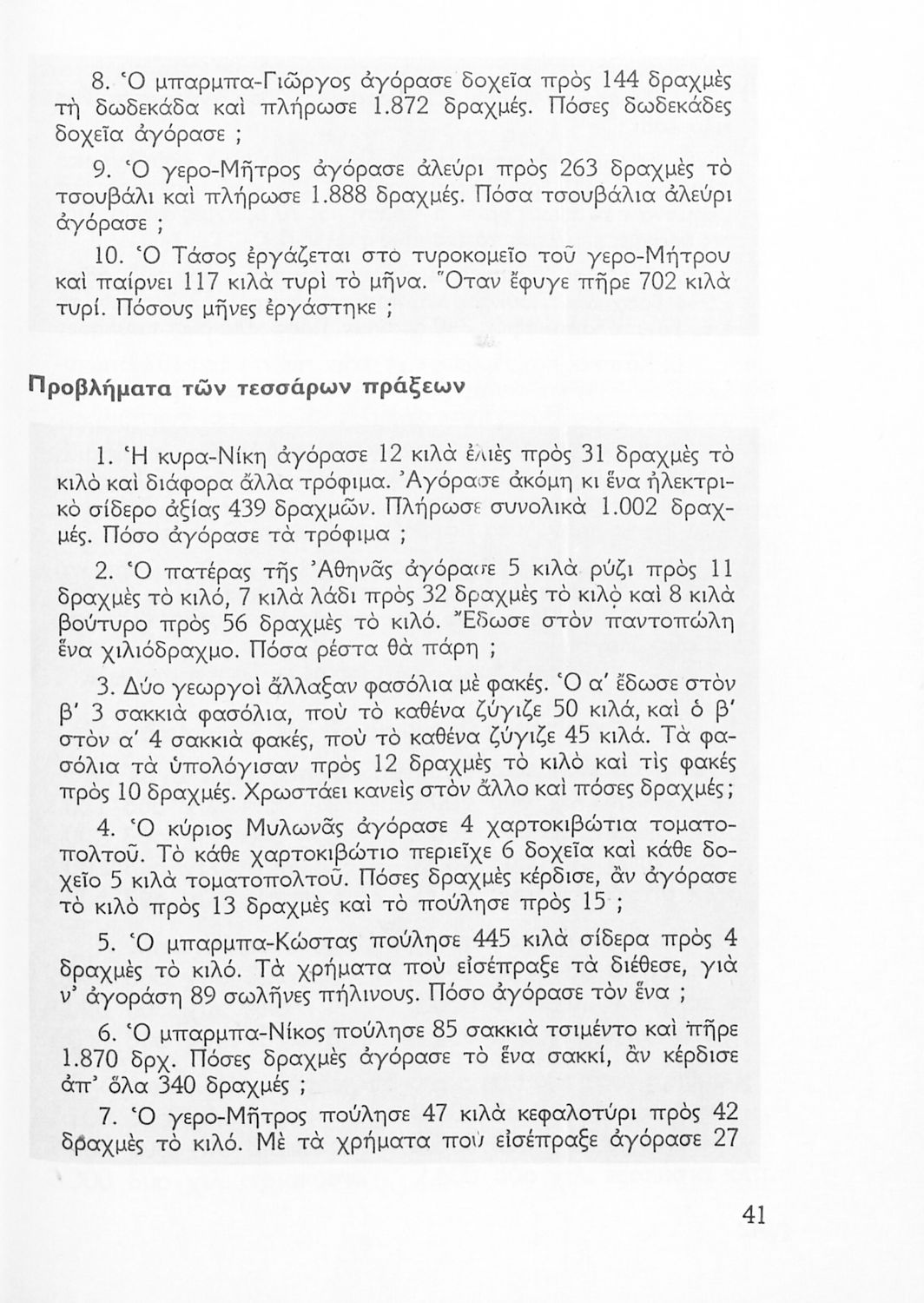 Σχολικό εγχειρίδιο Αριθμητικής Δ΄ Δημοτικού χωρισμένο σε πρακτικά προβλήματα και τις λύσεις τους που περιλαμβάνει και κάποια στοιχεία Γεωμετρίας.