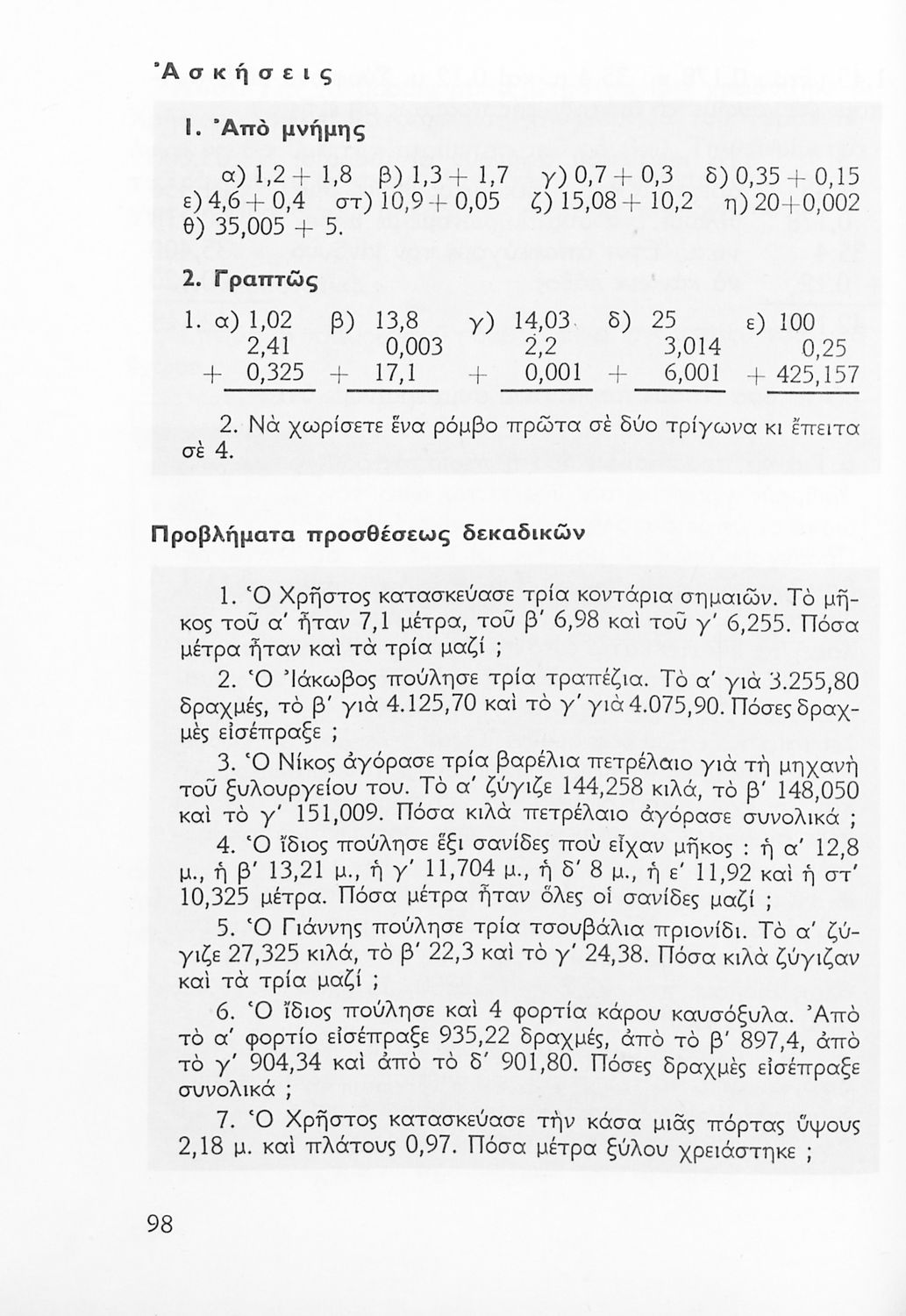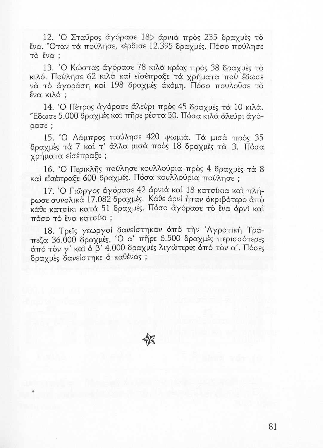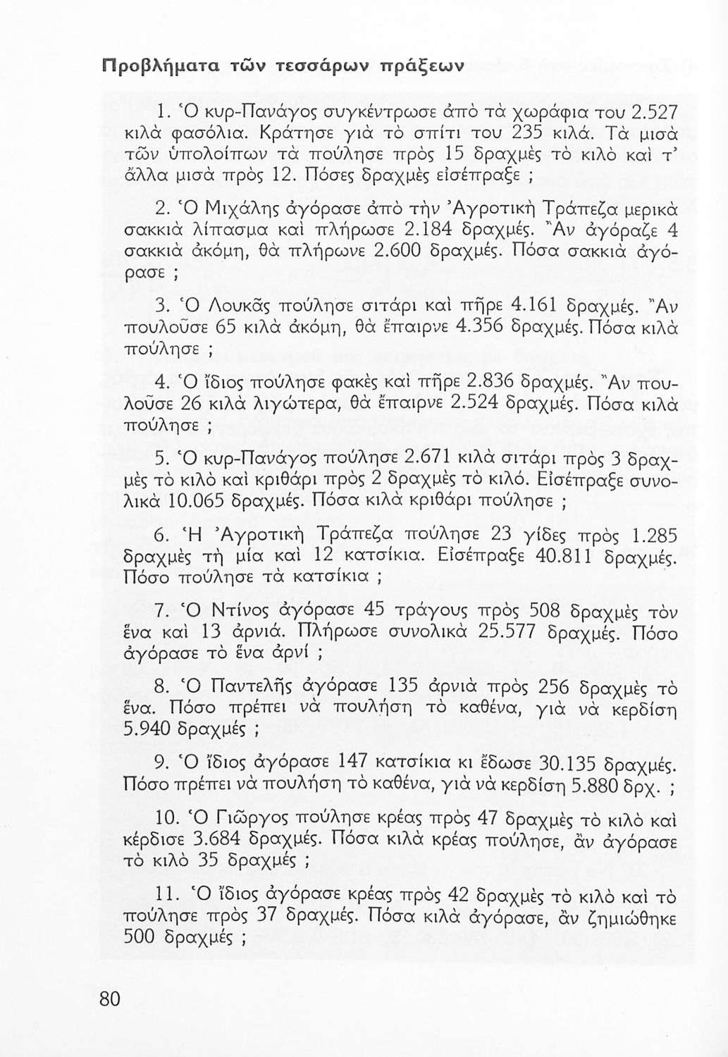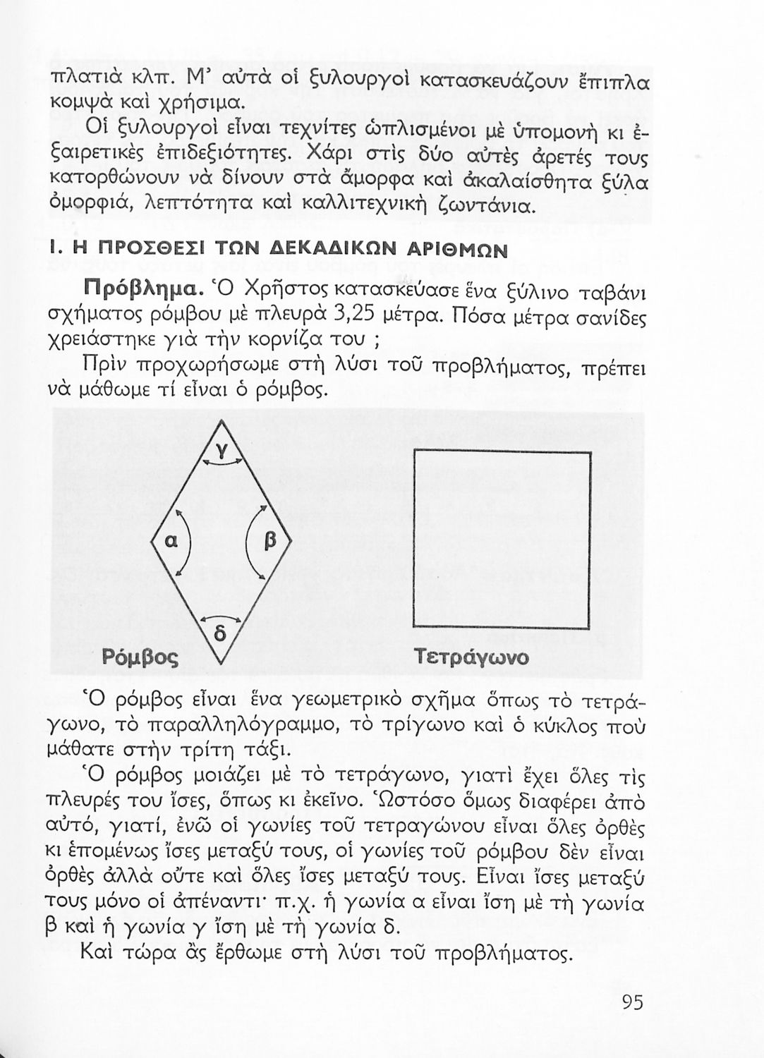 Σχολικό εγχειρίδιο Αριθμητικής Δ΄ Δημοτικού χωρισμένο σε πρακτικά προβλήματα και τις λύσεις τους που περιλαμβάνει και κάποια στοιχεία Γεωμετρίας.