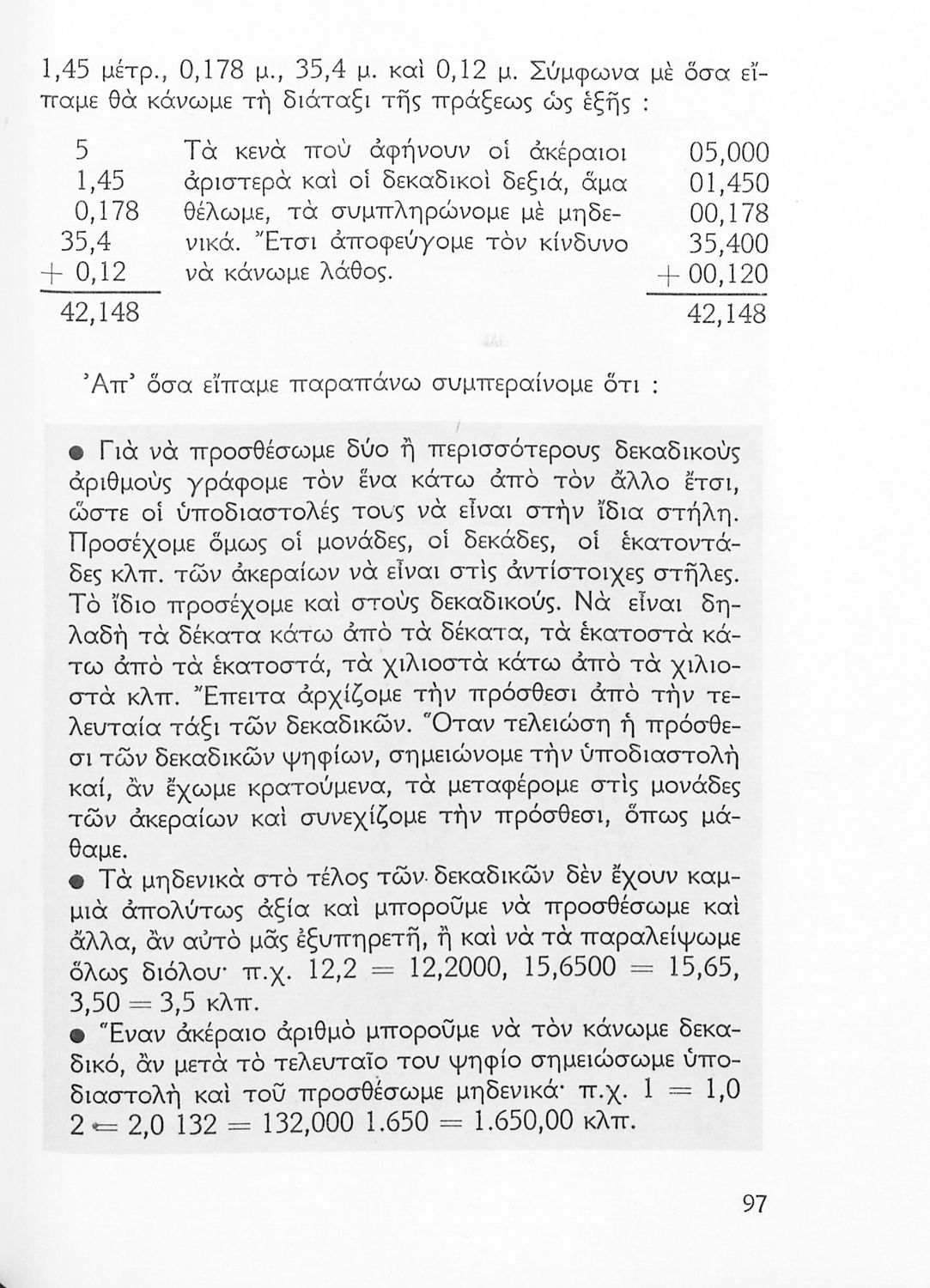 Σχολικό εγχειρίδιο Αριθμητικής Δ΄ Δημοτικού χωρισμένο σε πρακτικά προβλήματα και τις λύσεις τους που εστιάζει στις πράξεις με ακέραιους και συμμιγείς αριθμούς και περιλαμβάνει στοιχεία Γεωμετρίας.