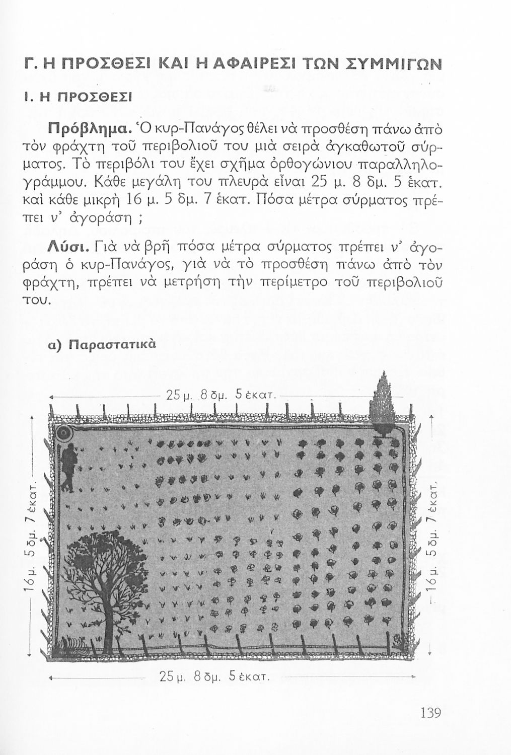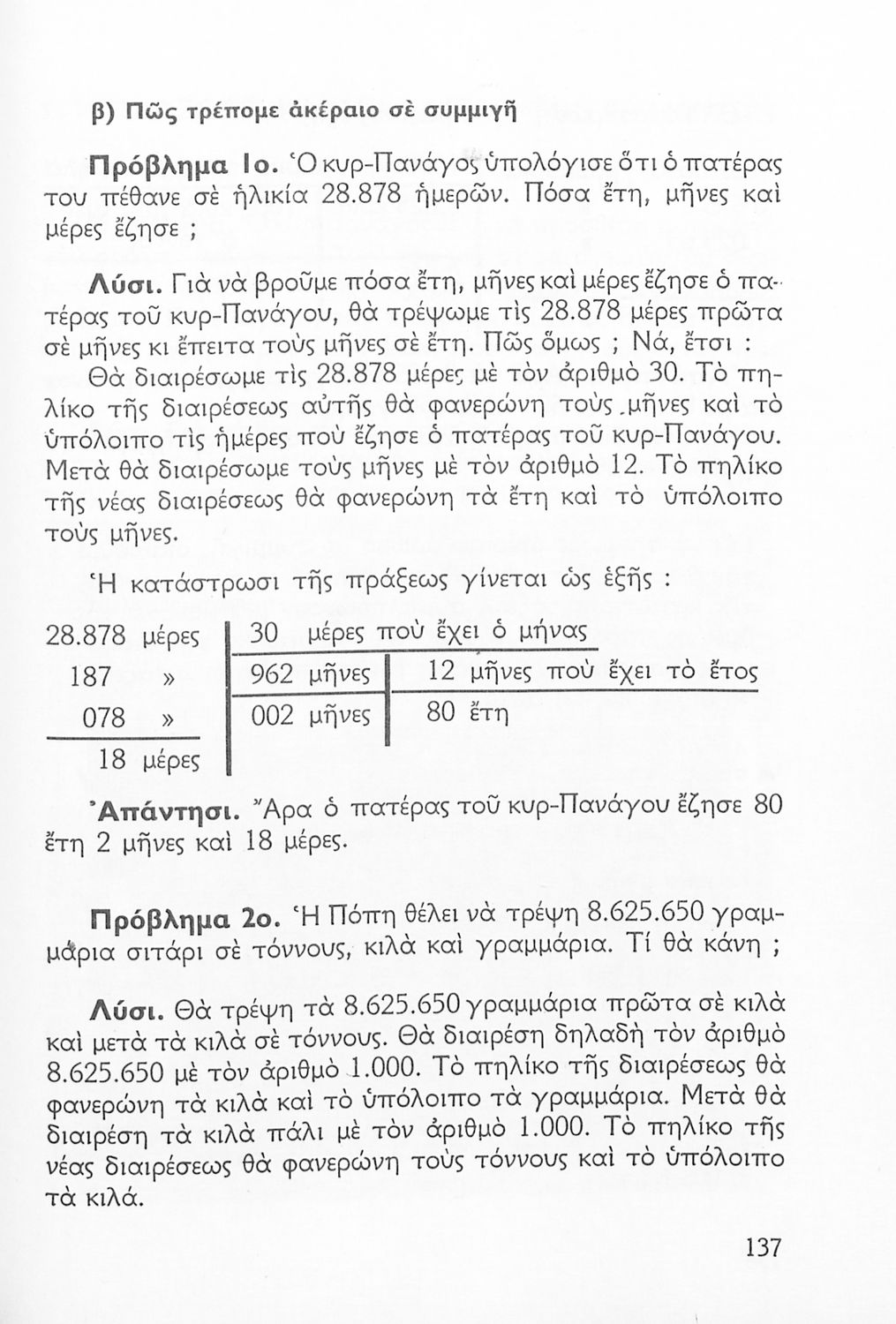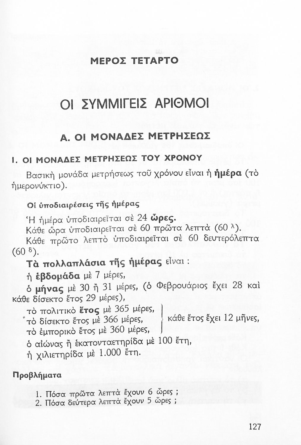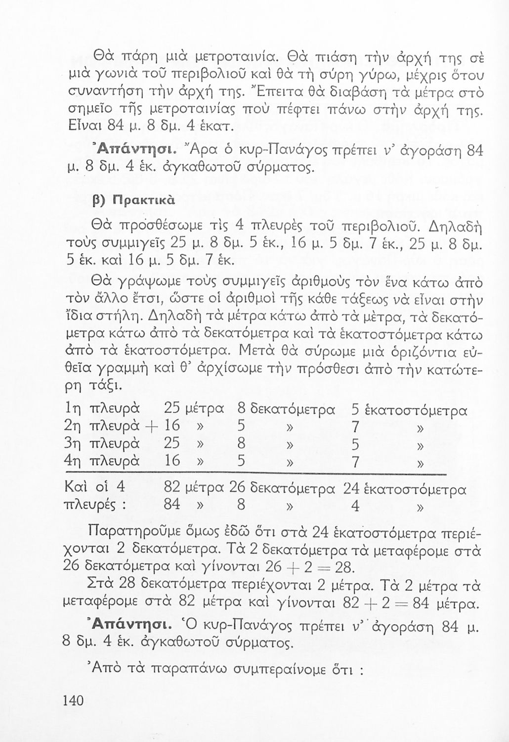 Σχολικό εγχειρίδιο Αριθμητικής Δ΄ Δημοτικού χωρισμένο σε πρακτικά προβλήματα και τις λύσεις τους που περιλαμβάνει και κάποια στοιχεία Γεωμετρίας.