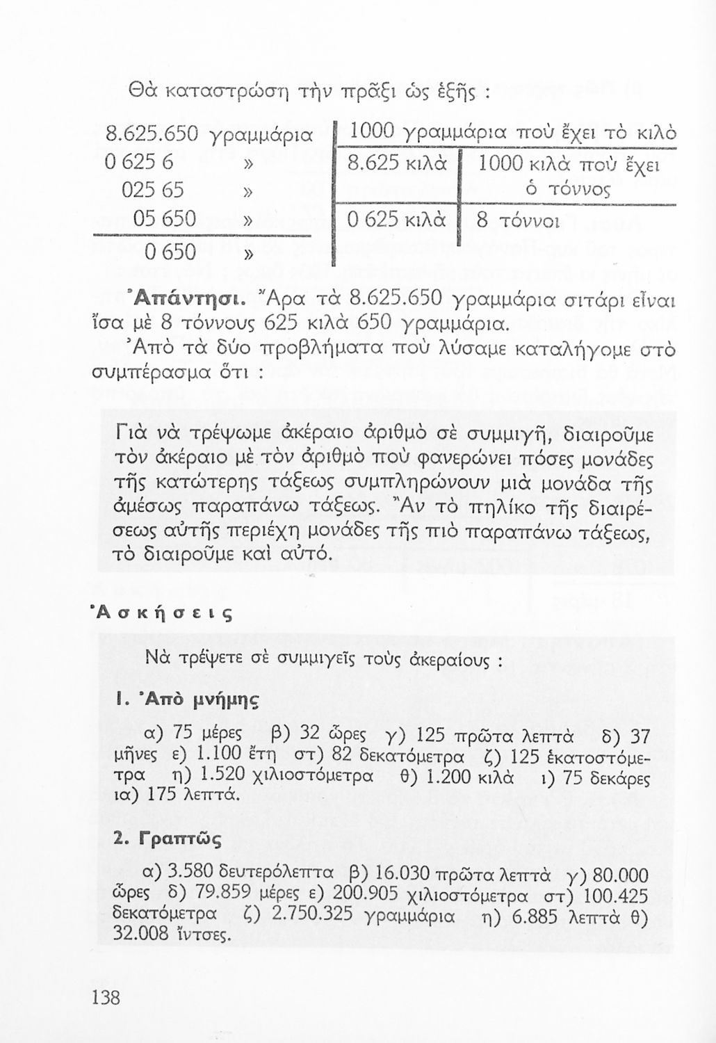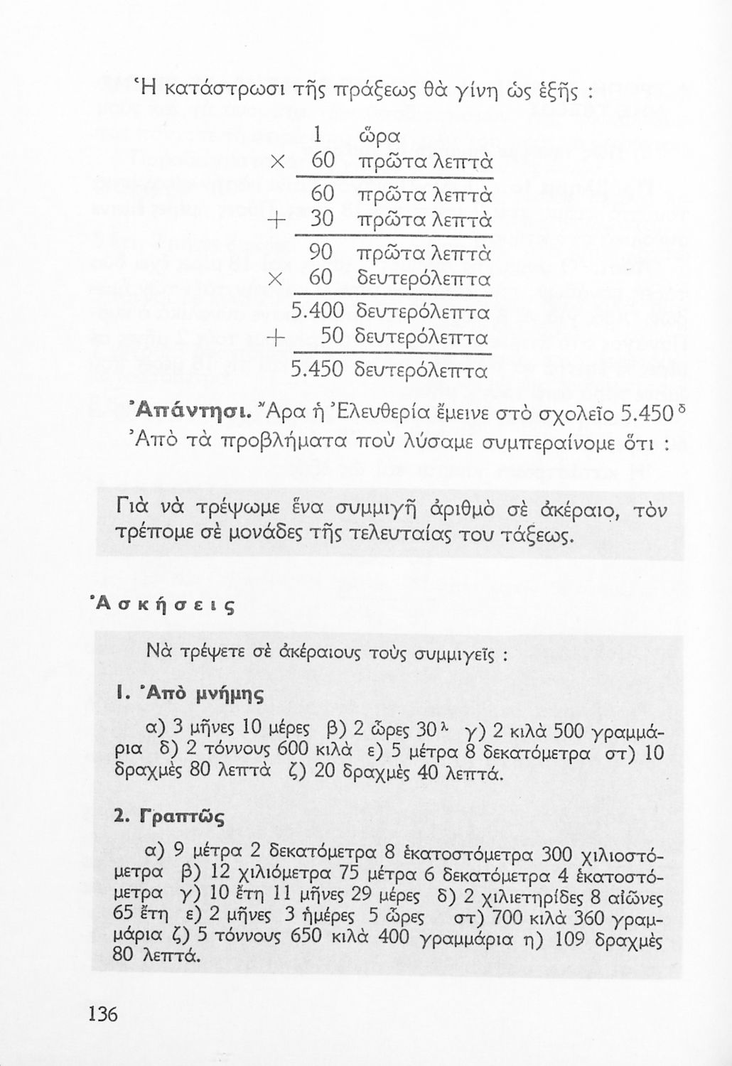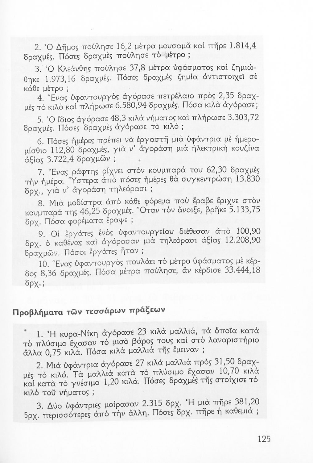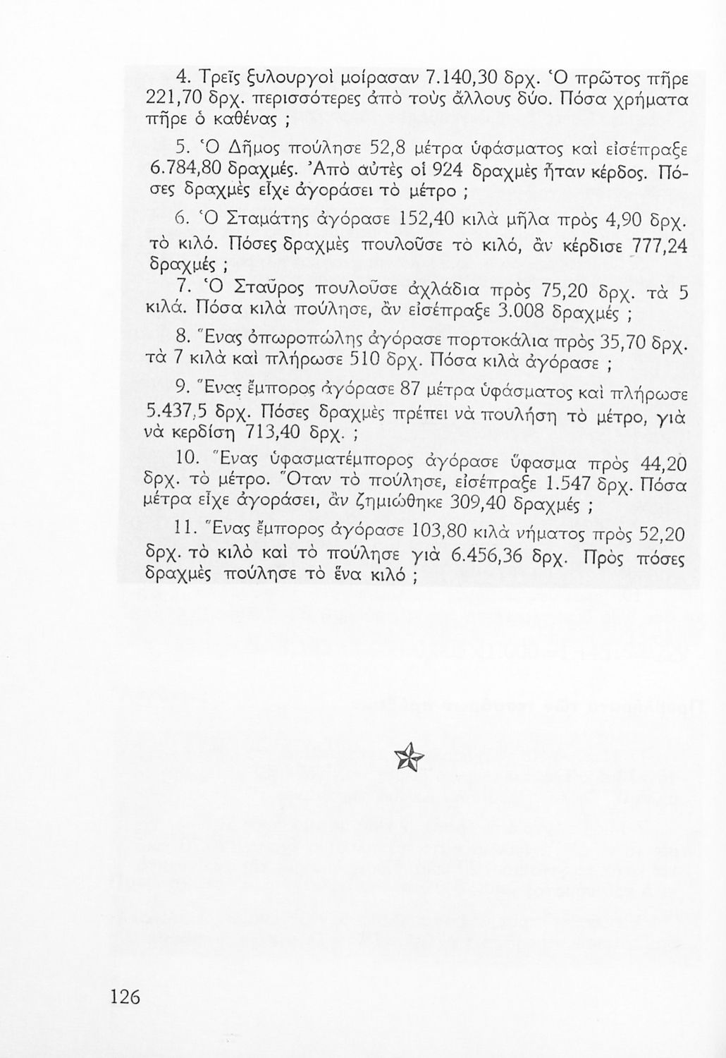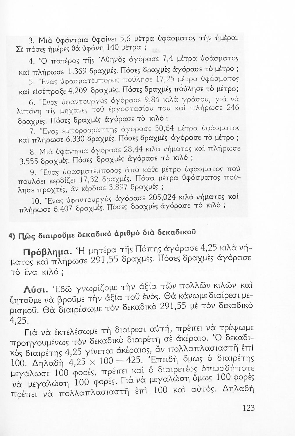 Σχολικό εγχειρίδιο Αριθμητικής Δ΄ Δημοτικού χωρισμένο σε πρακτικά προβλήματα και τις λύσεις τους που περιλαμβάνει και κάποια στοιχεία Γεωμετρίας.