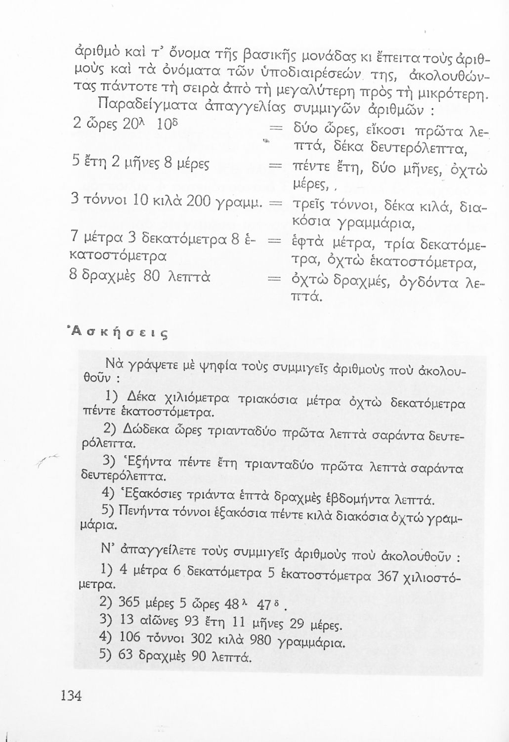 Σχολικό εγχειρίδιο Μαθηματικών ΣΤ΄ Δημοτικού που περιλαμβάνει ασκήσεις λογιστικού χαρακτήρα και ασκήσεις μέτρησης γεωμετρικών σχημάτων. Φέρει το σύμβολο της δικτατορίας.