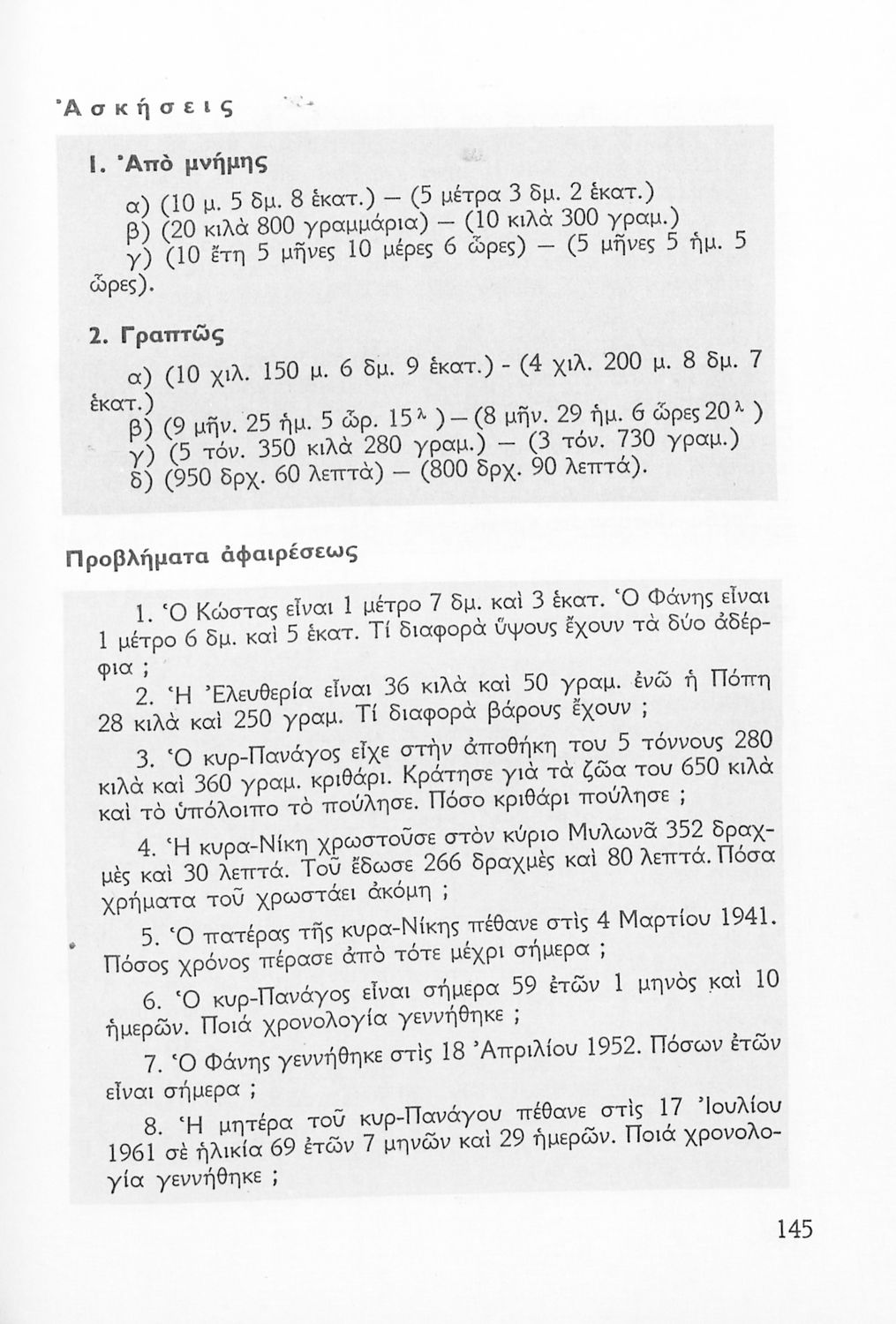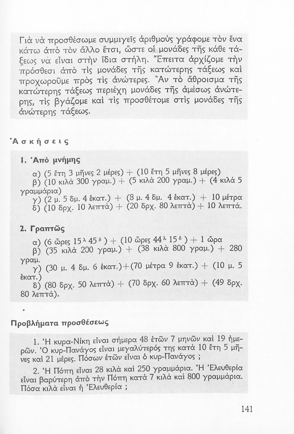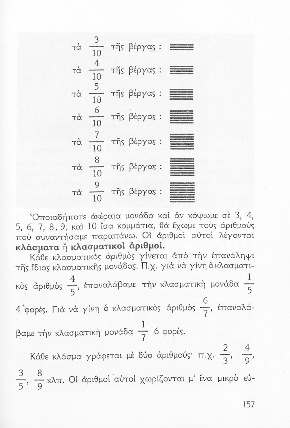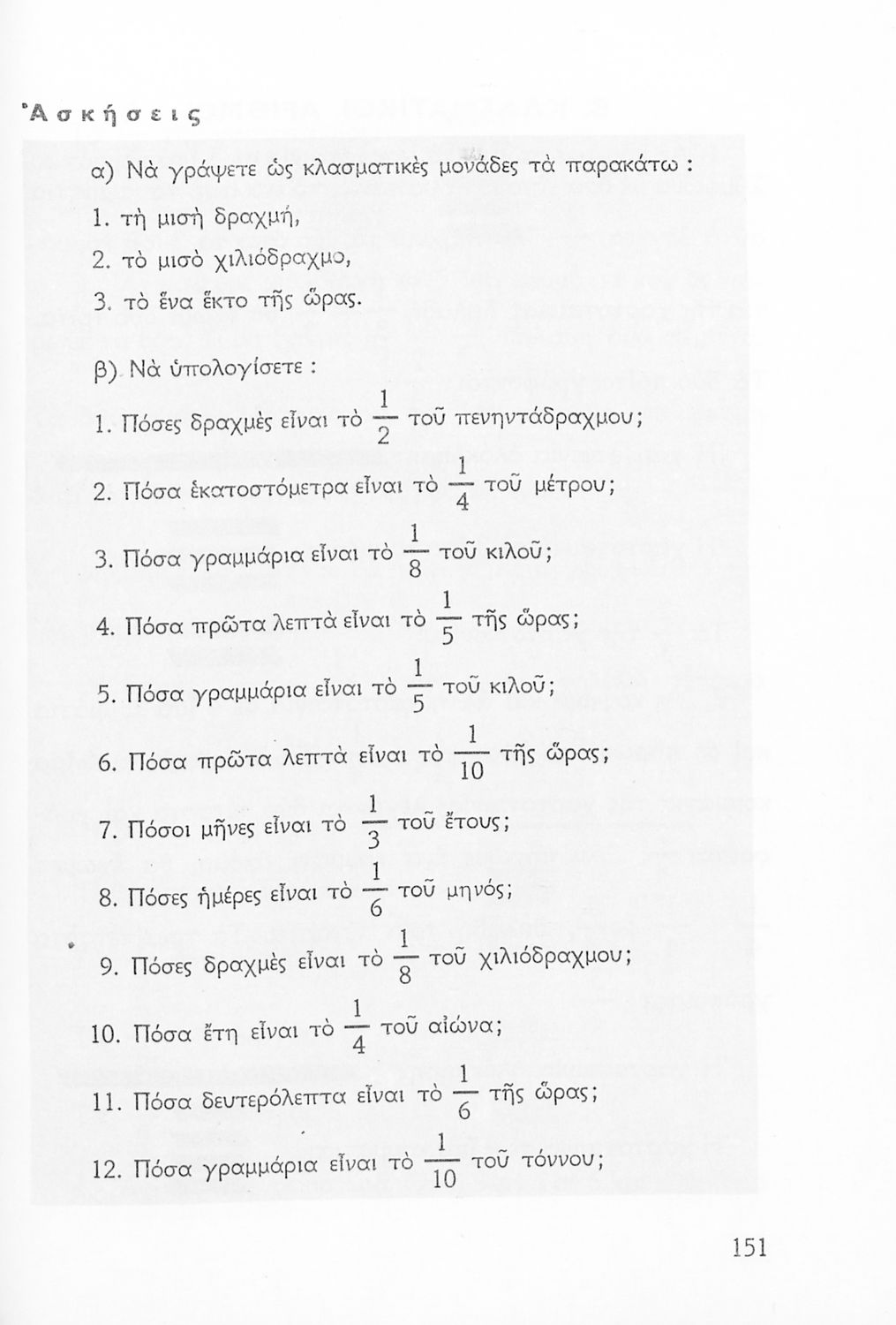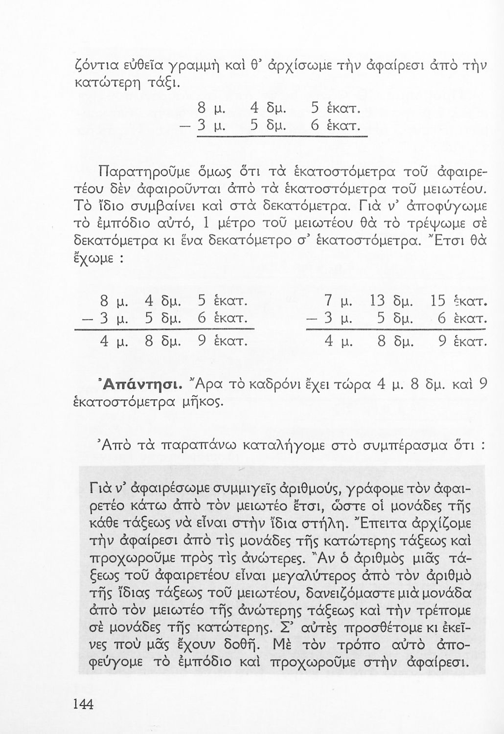 Σχολικό εγχειρίδιο Αριθμητικής Δ΄ Δημοτικού χωρισμένο σε πρακτικά προβλήματα και τις λύσεις τους που περιλαμβάνει και κάποια στοιχεία Γεωμετρίας.