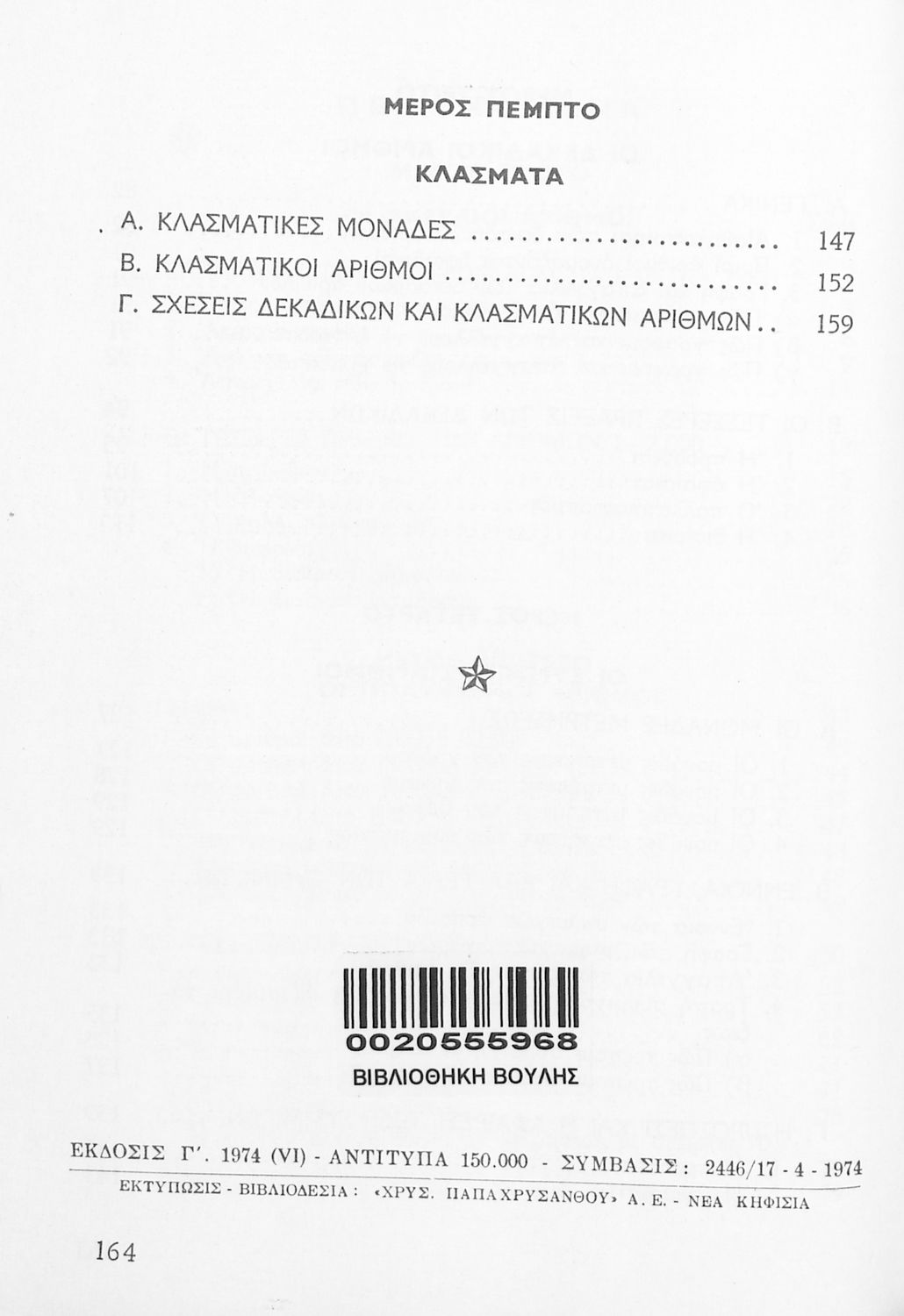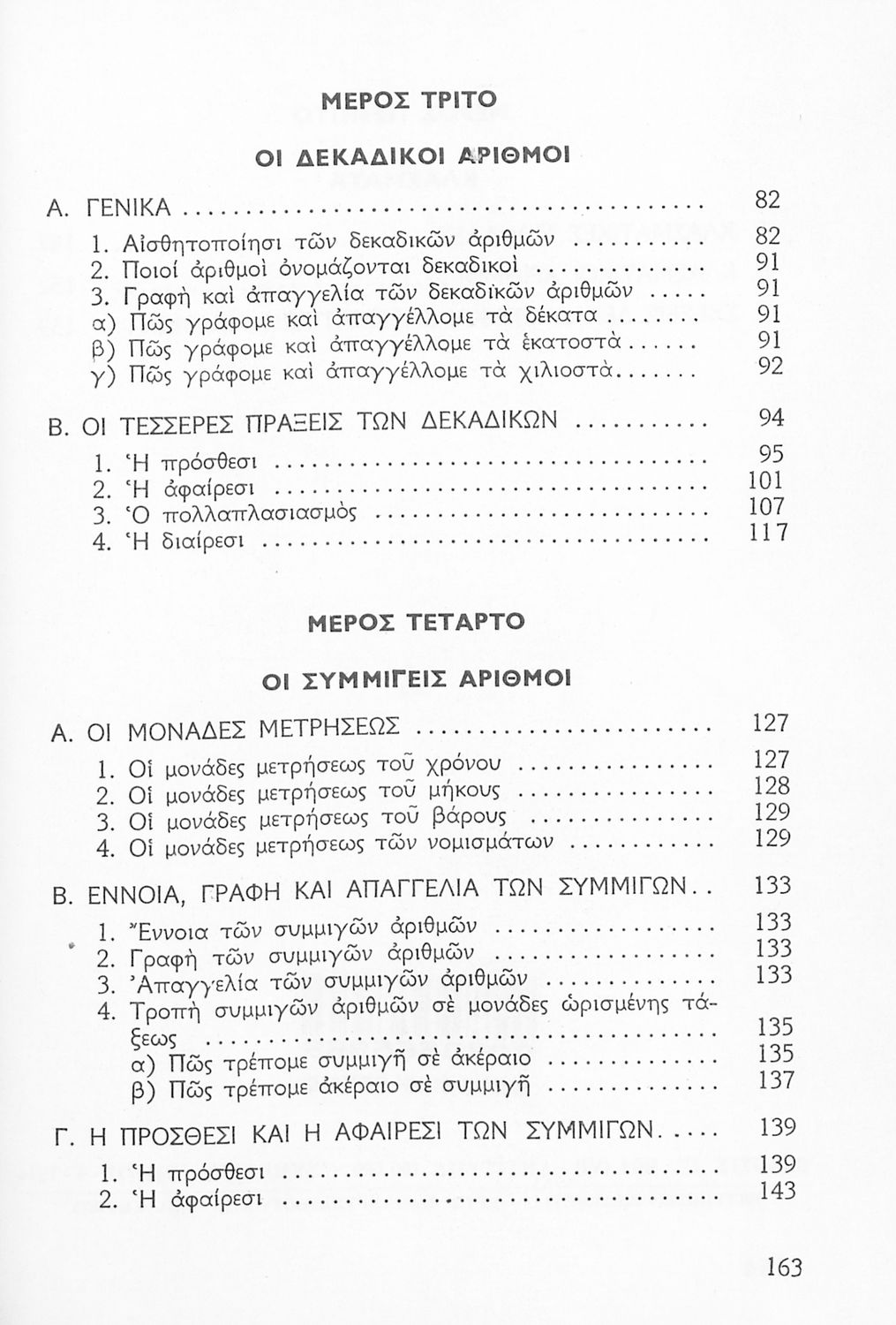 Σχολικό εγχειρίδιο Αριθμητικής Δ΄ Δημοτικού χωρισμένο σε πρακτικά προβλήματα και τις λύσεις τους που περιλαμβάνει και κάποια στοιχεία Γεωμετρίας.