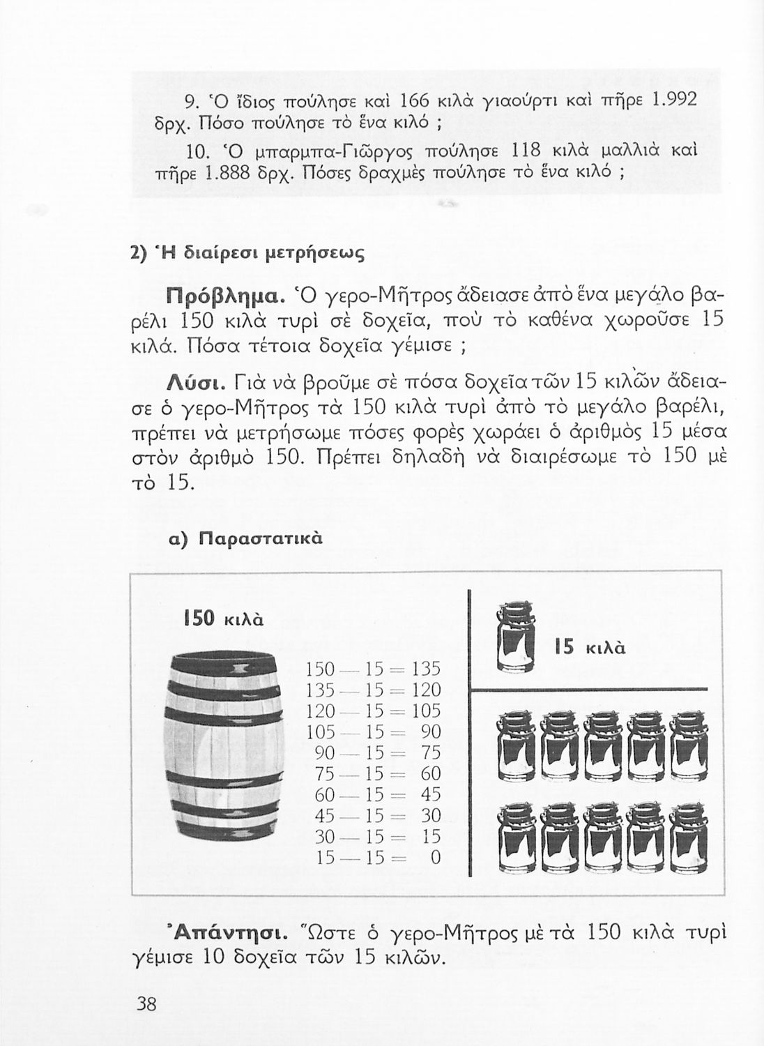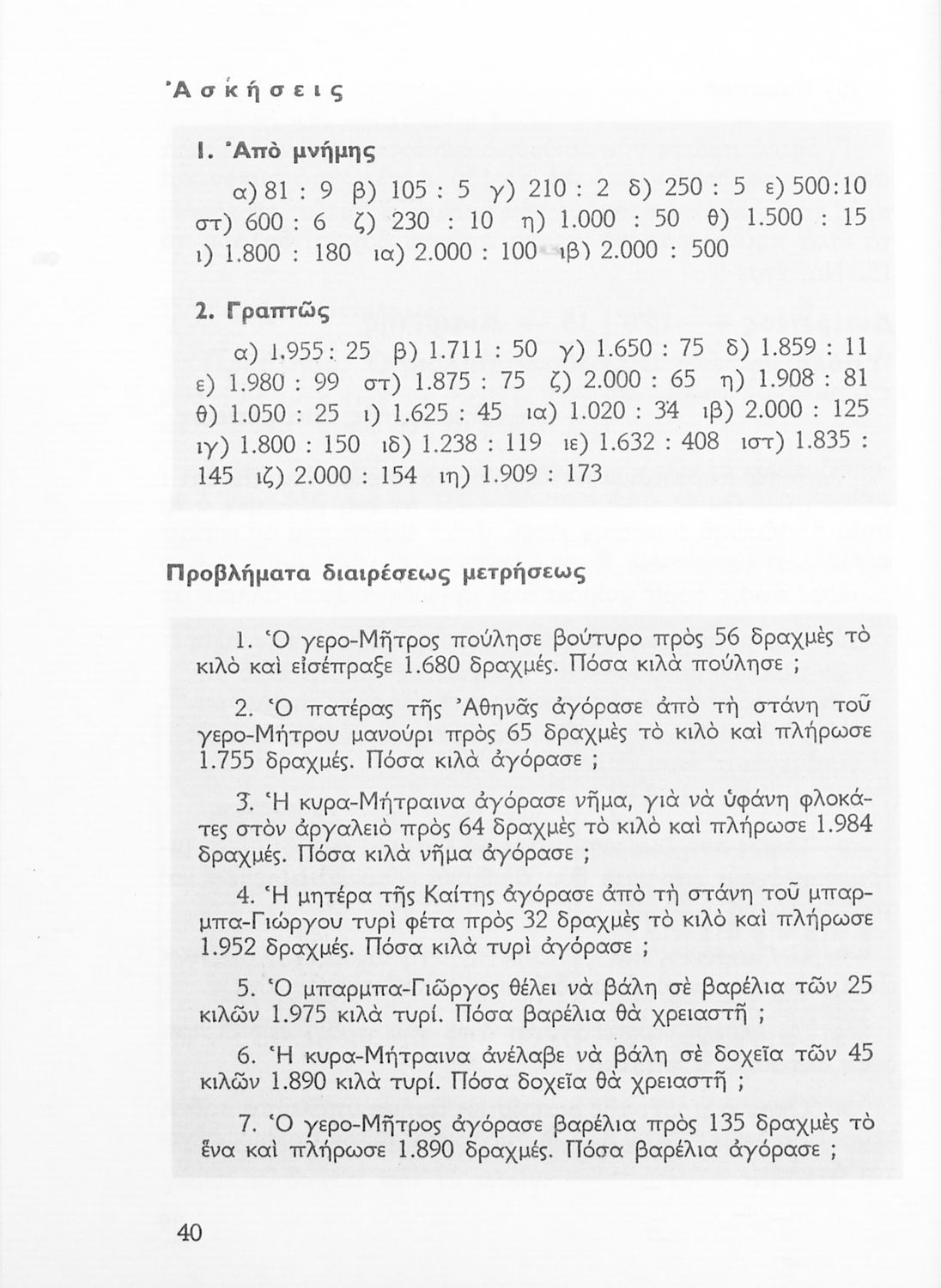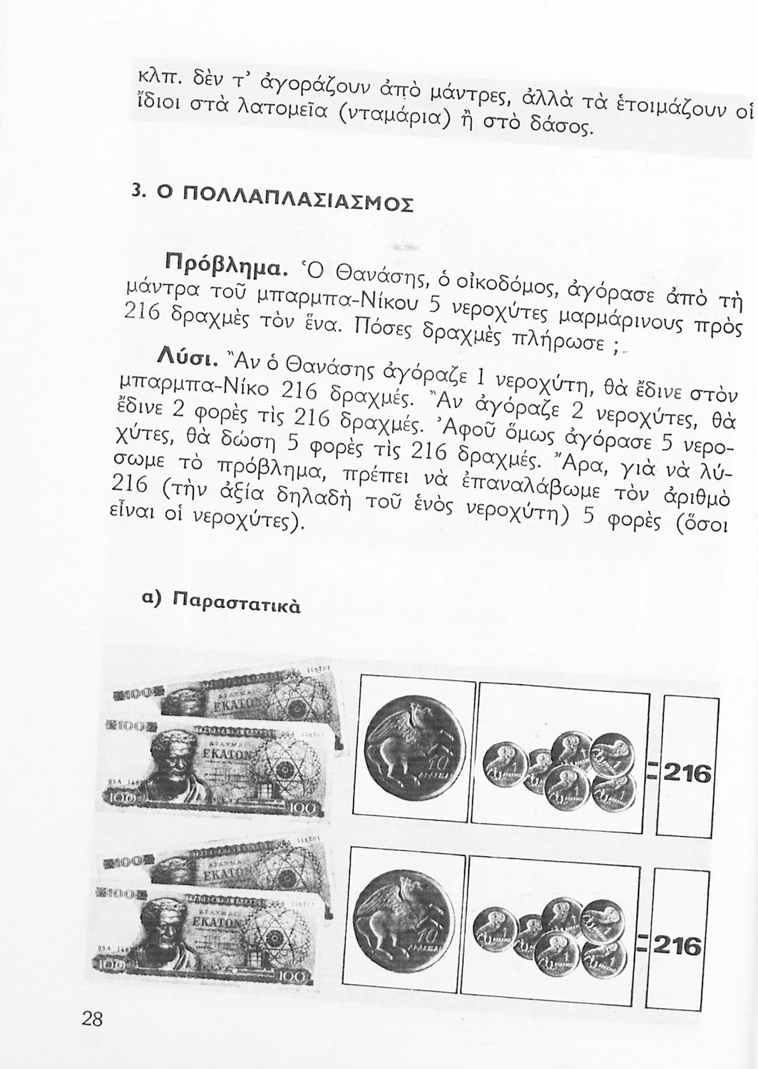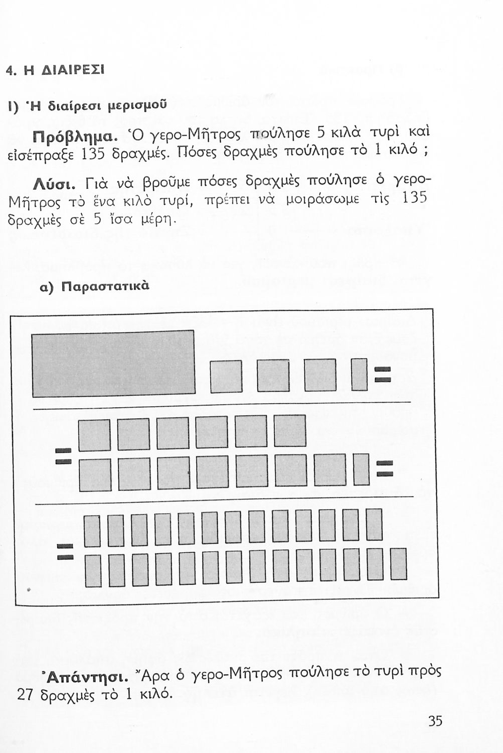 Σχολικό εγχειρίδιο Αριθμητικής Δ΄ Δημοτικού χωρισμένο σε πρακτικά προβλήματα και τις λύσεις τους που περιλαμβάνει και κάποια στοιχεία Γεωμετρίας.
