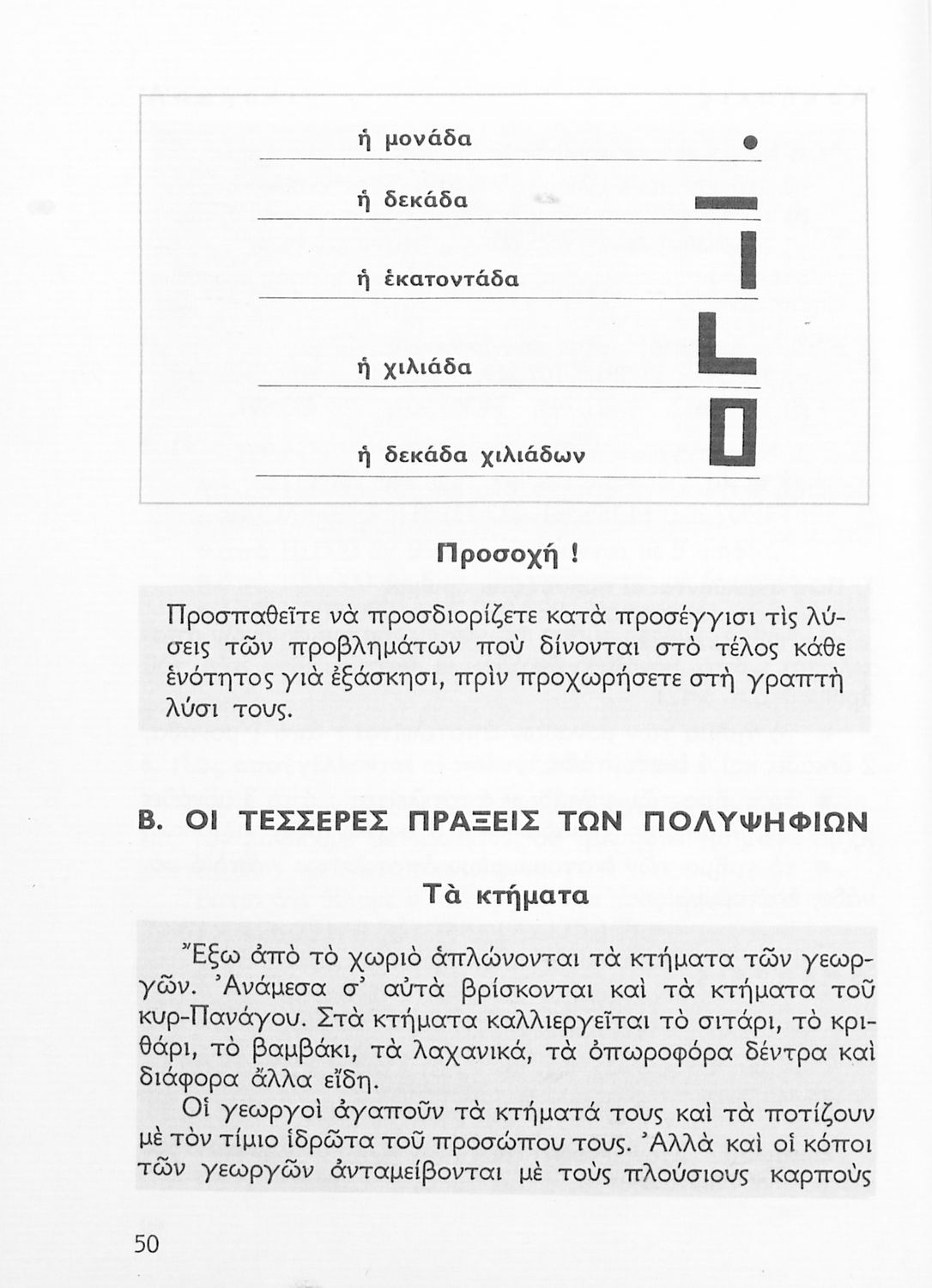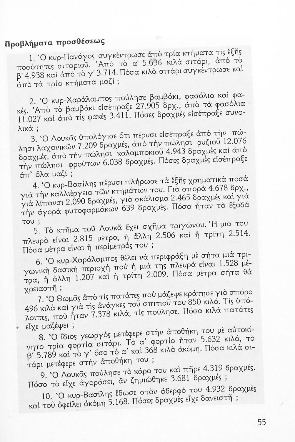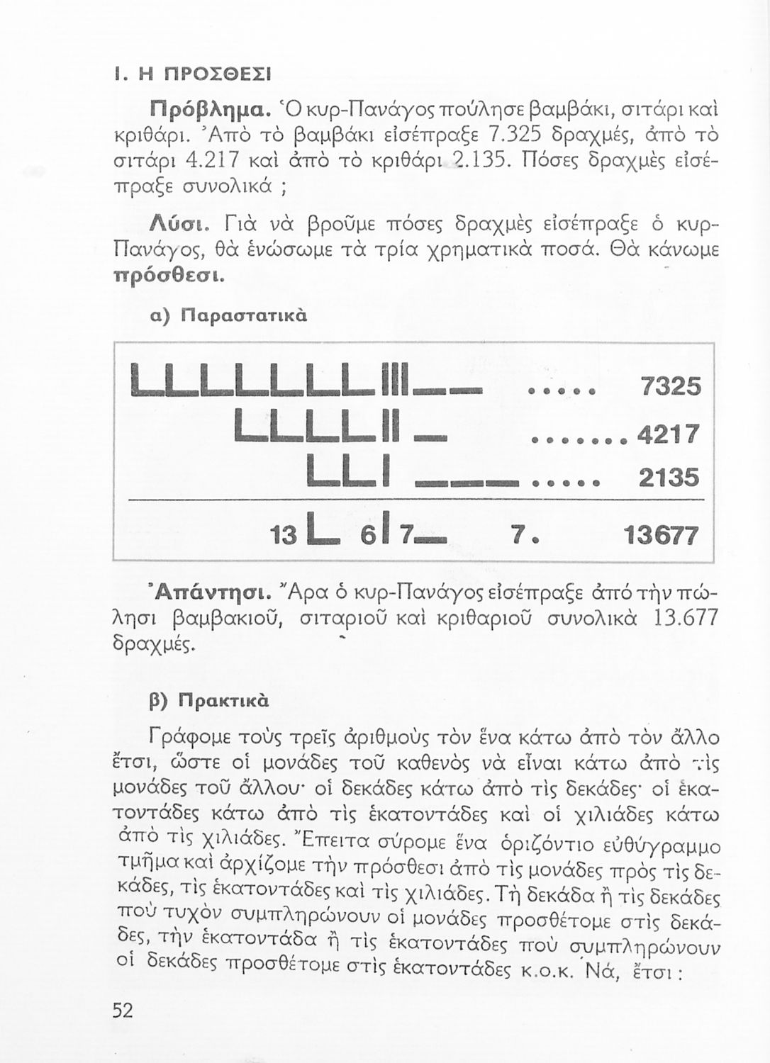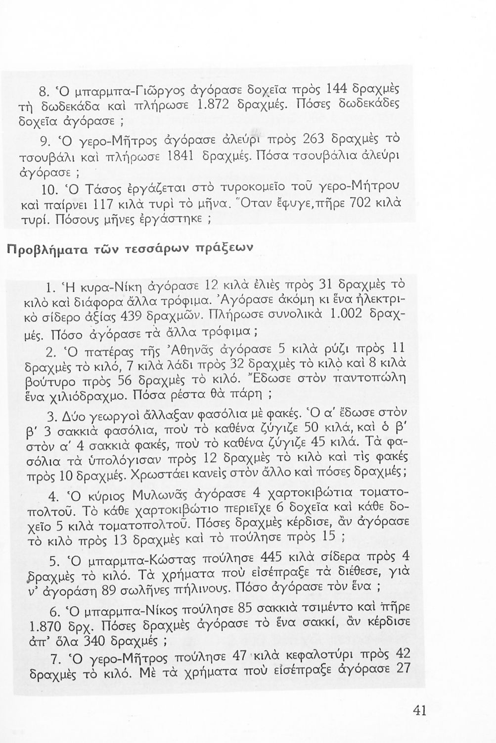 Σχολικό εγχειρίδιο Αριθμητικής Δ΄ Δημοτικού χωρισμένο σε πρακτικά προβλήματα και τις λύσεις τους που περιλαμβάνει και κάποια στοιχεία Γεωμετρίας.