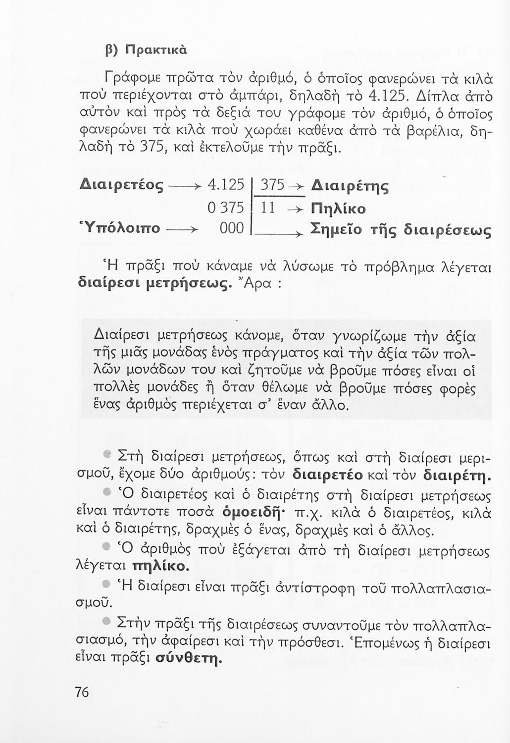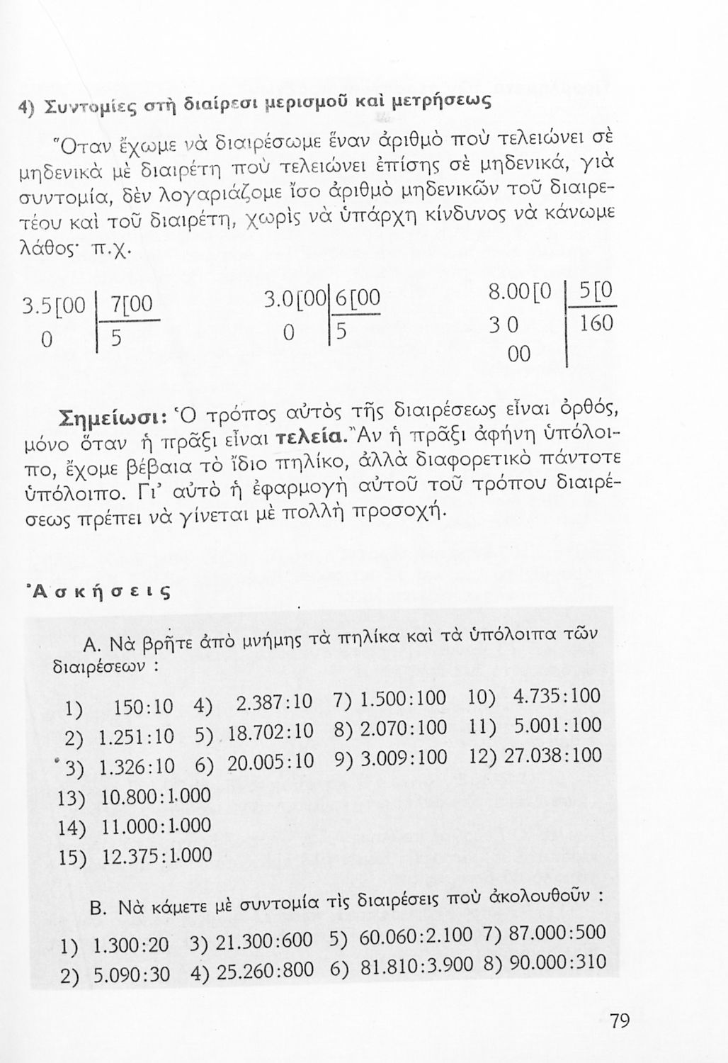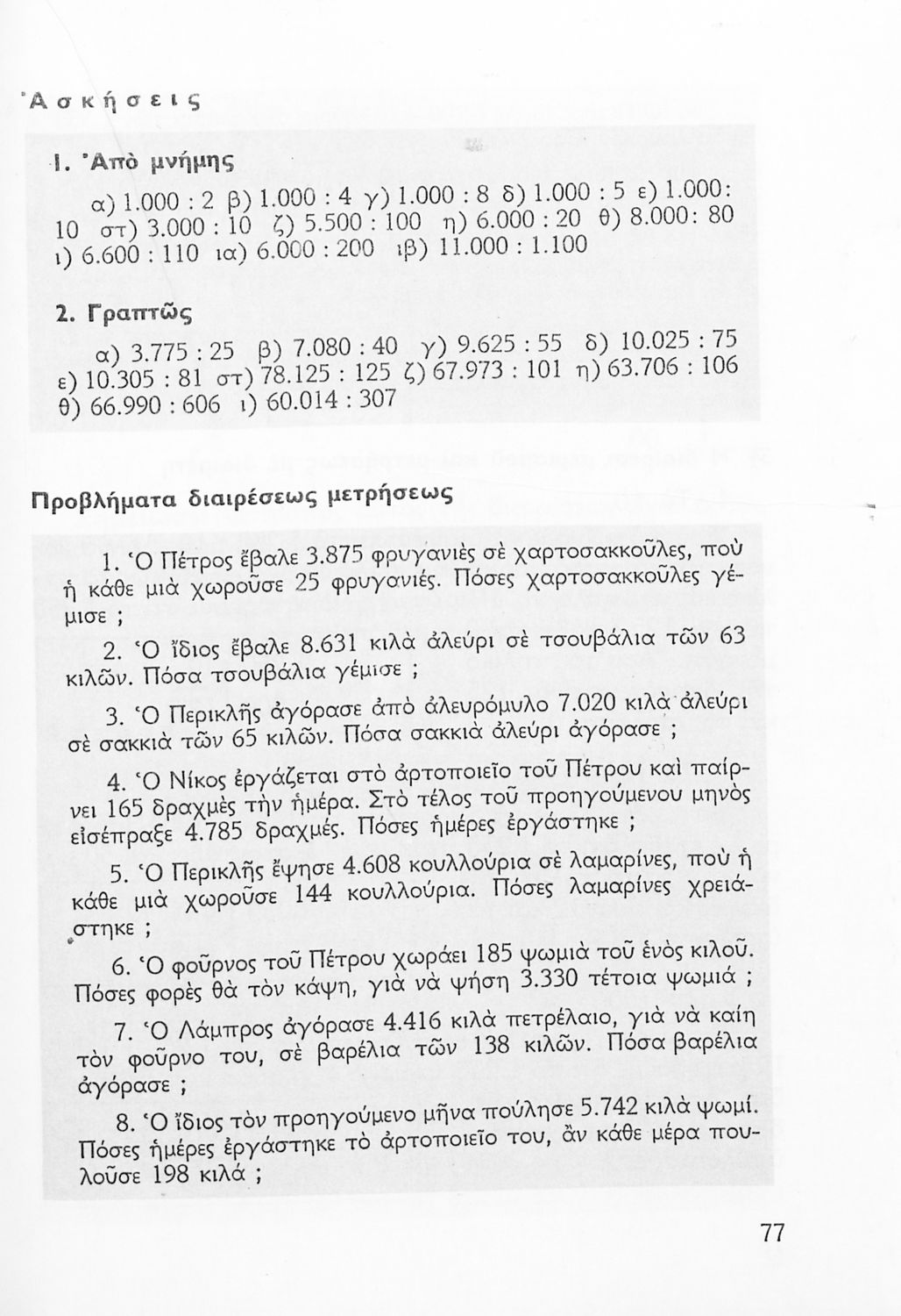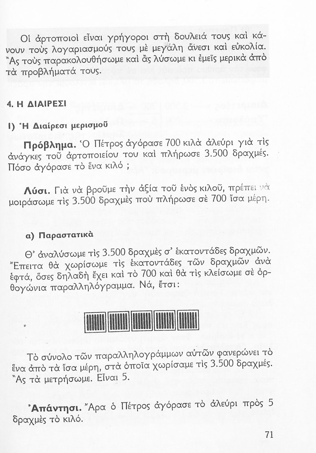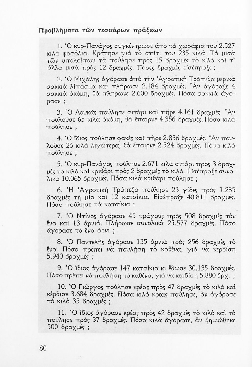 Σχολικό εγχειρίδιο Αριθμητικής Δ΄ Δημοτικού χωρισμένο σε πρακτικά προβλήματα και τις λύσεις τους που περιλαμβάνει και κάποια στοιχεία Γεωμετρίας.