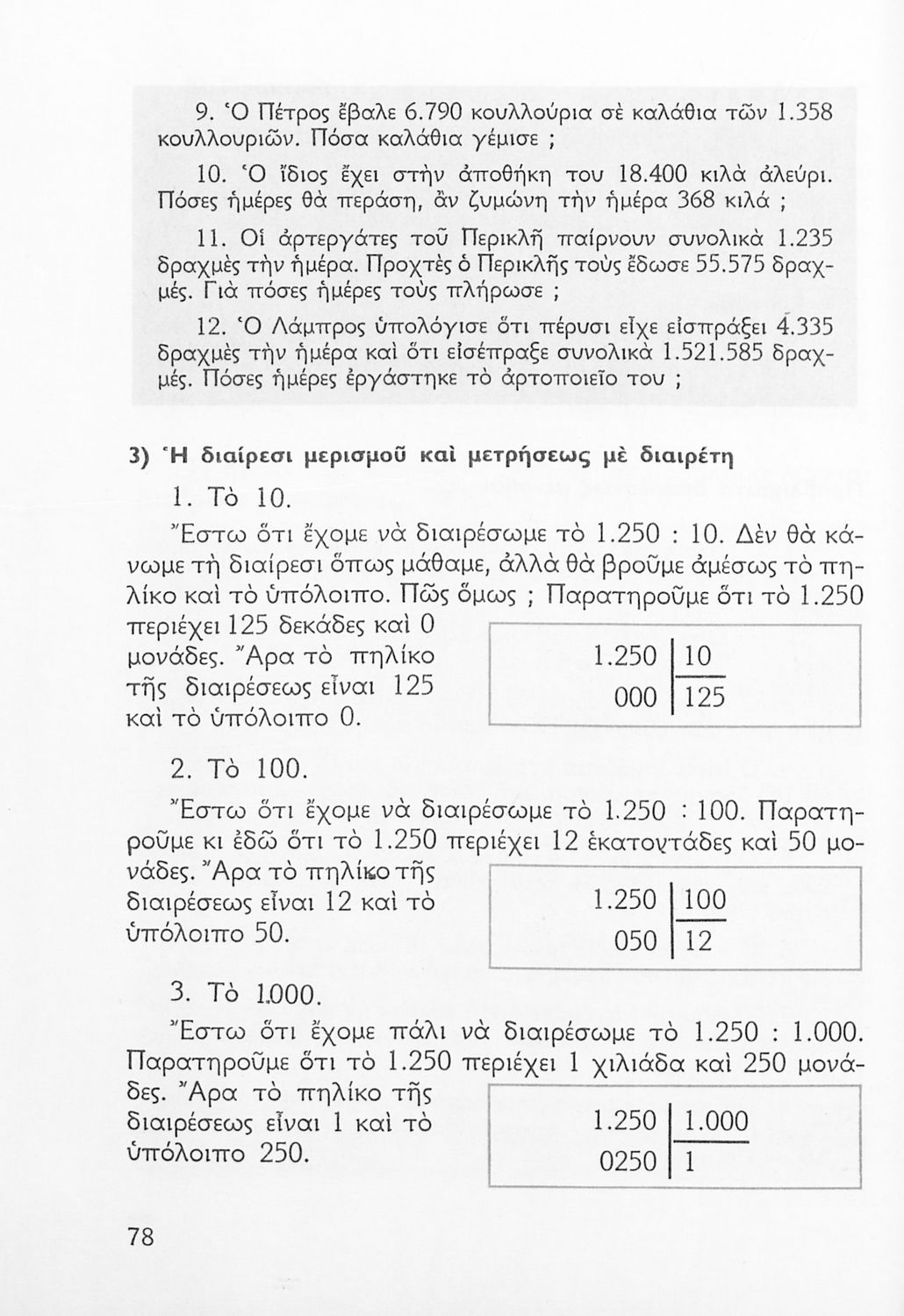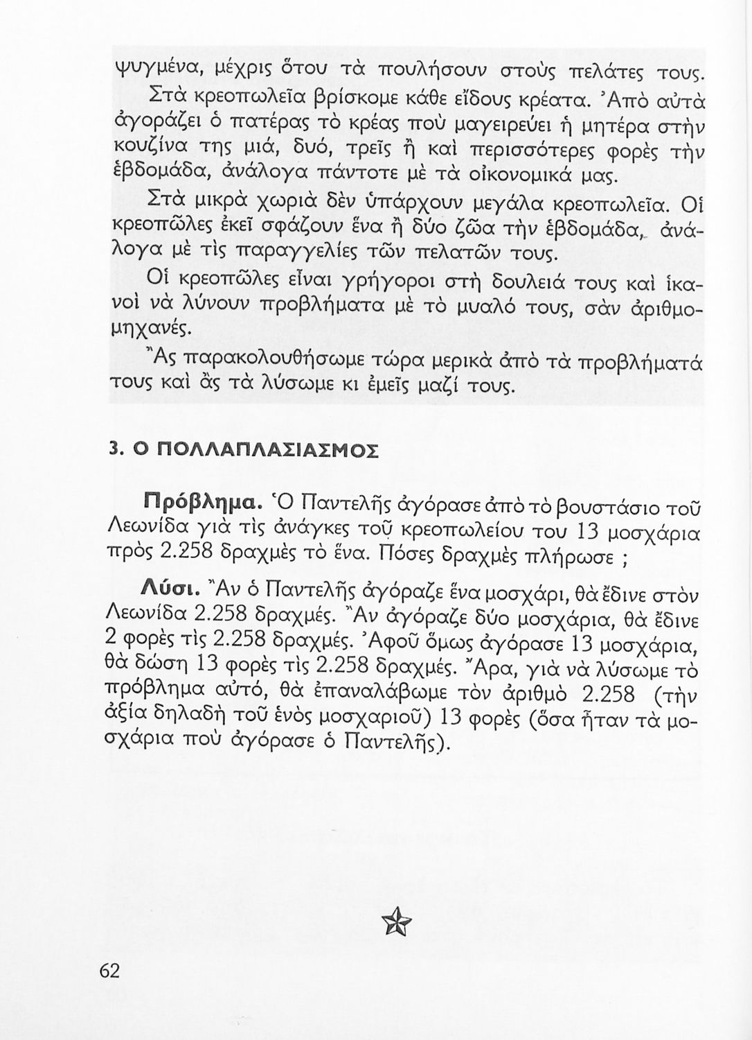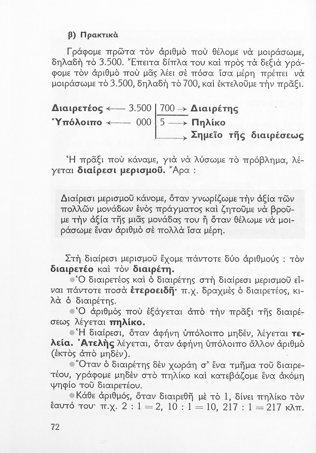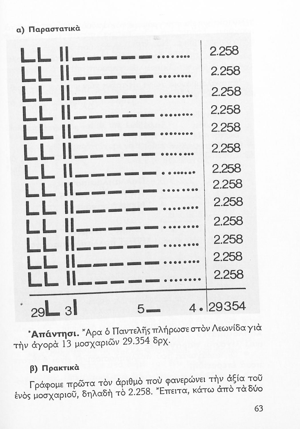 Σχολικό εγχειρίδιο Αριθμητικής Δ΄ Δημοτικού χωρισμένο σε πρακτικά προβλήματα και τις λύσεις τους που περιλαμβάνει και κάποια στοιχεία Γεωμετρίας.