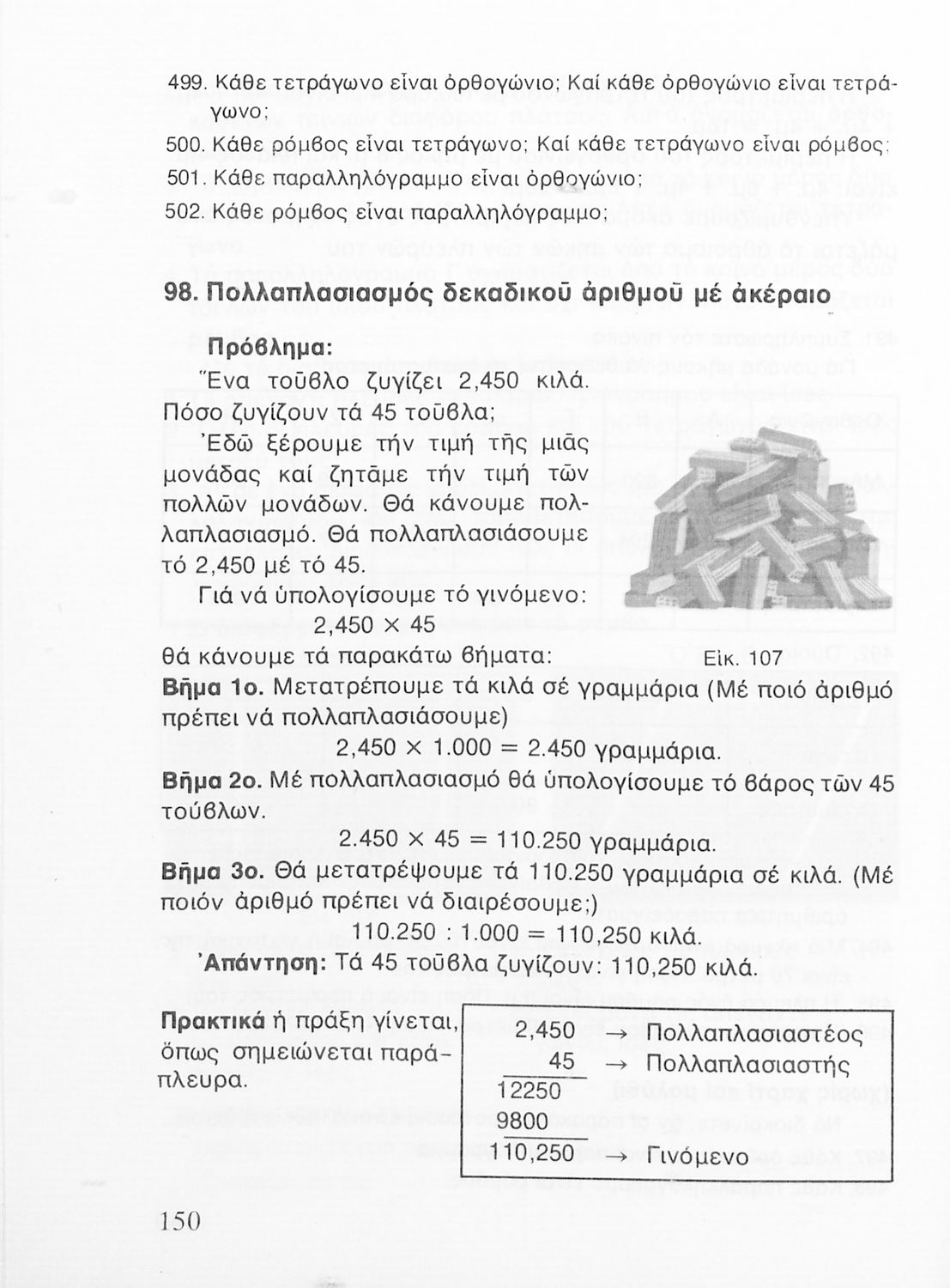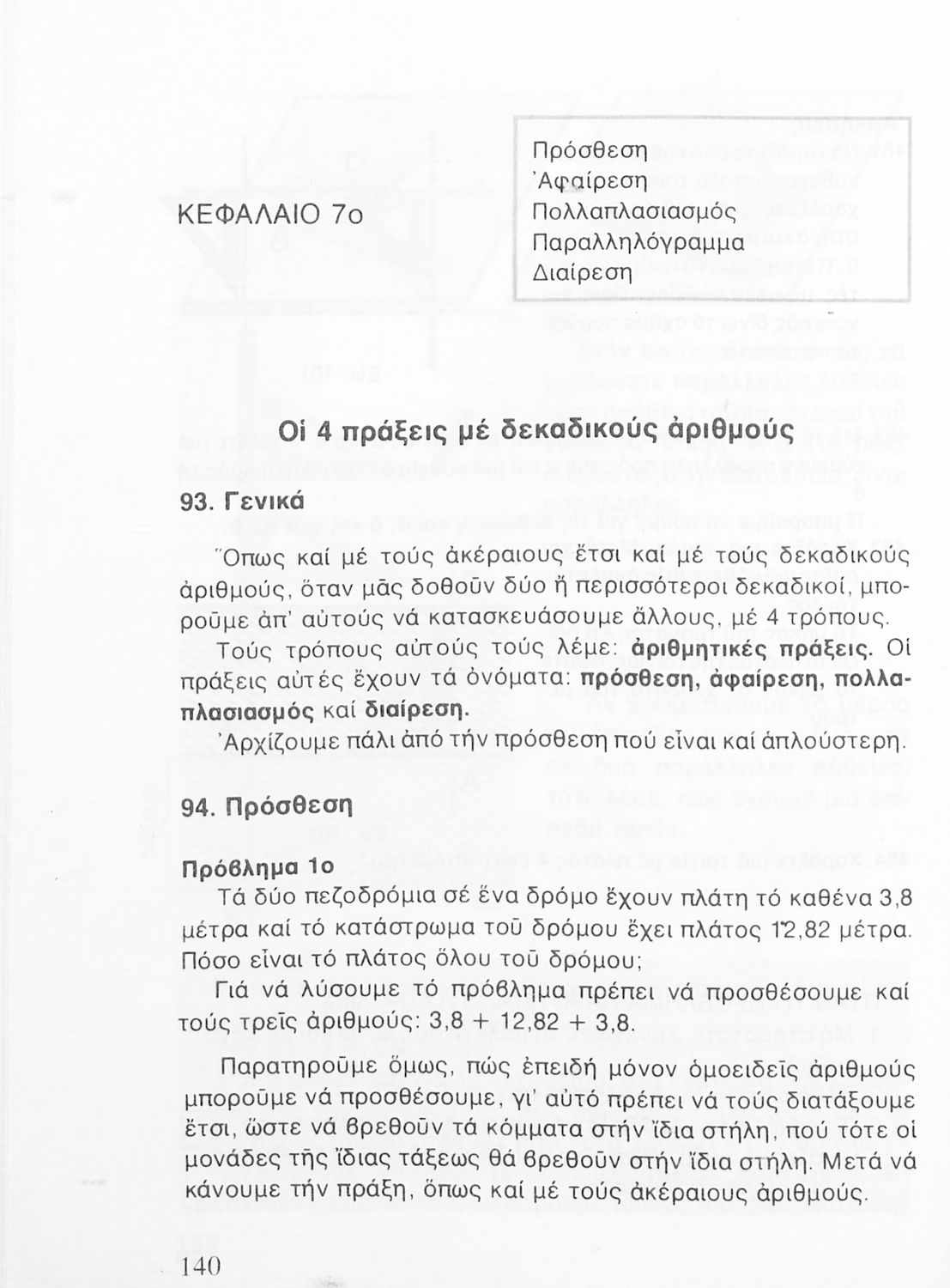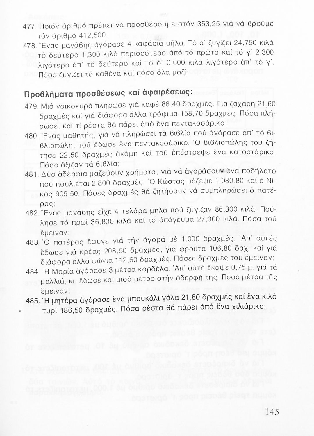 Σχολικό εγχειρίδιο Αριθμητικής Δ΄ Δημοτικού χωρισμένο σε πρακτικά προβλήματα και τις λύσεις τους που περιλαμβάνει και κάποια στοιχεία Γεωμετρίας.