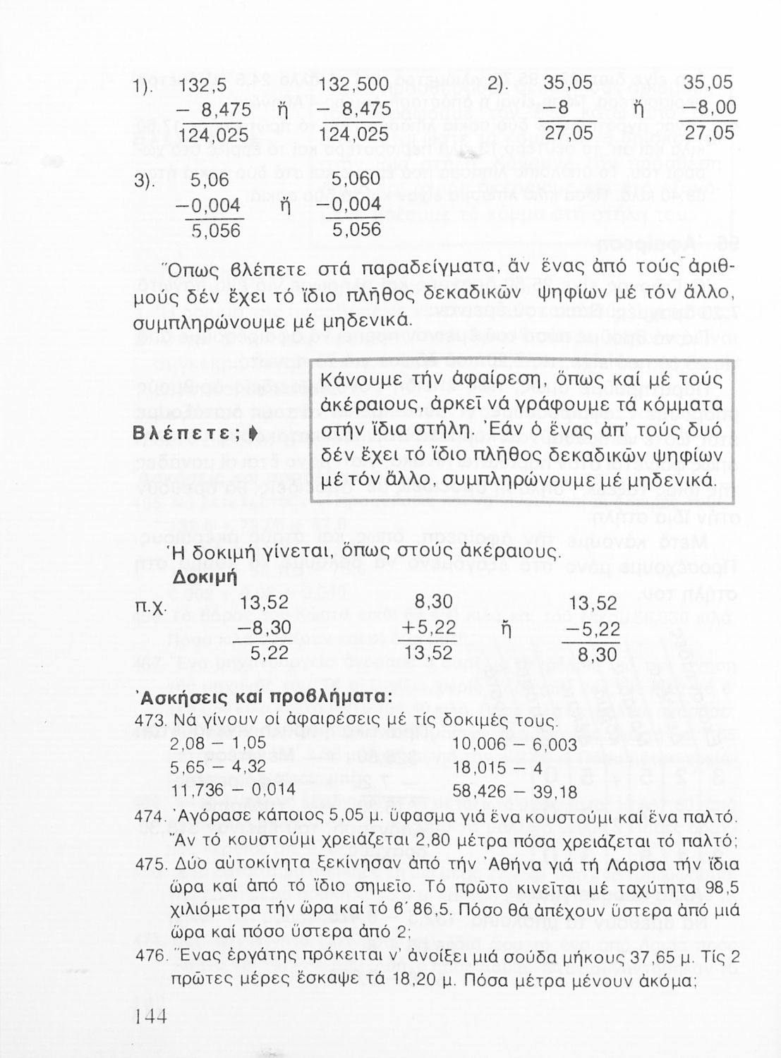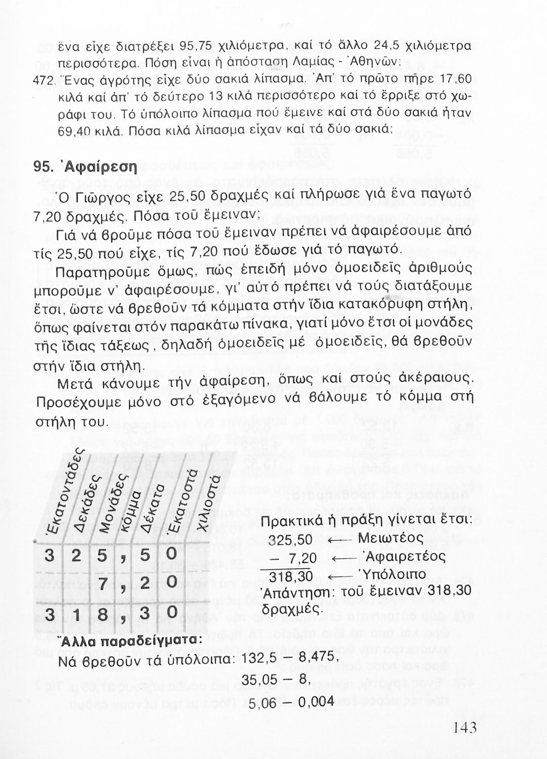 Σχολικό εγχειρίδιο Αριθμητικής Δ΄ Δημοτικού χωρισμένο σε πρακτικά προβλήματα και τις λύσεις τους που εστιάζει στις πράξεις με ακέραιους και συμμιγείς αριθμούς και περιλαμβάνει στοιχεία Γεωμετρίας.
