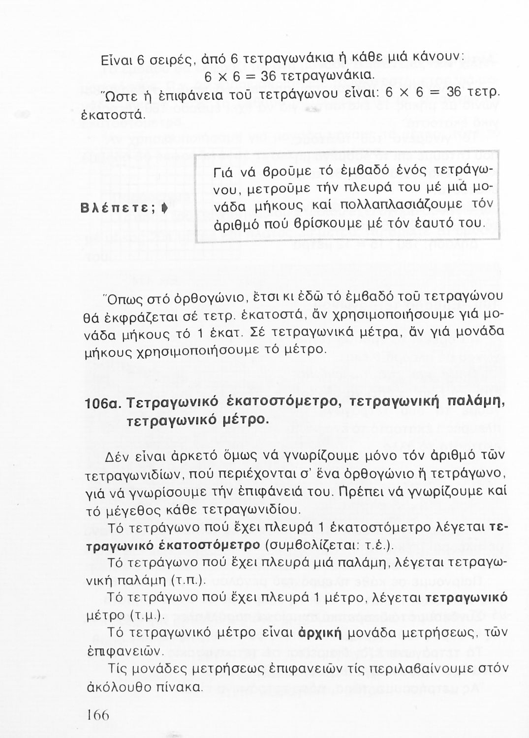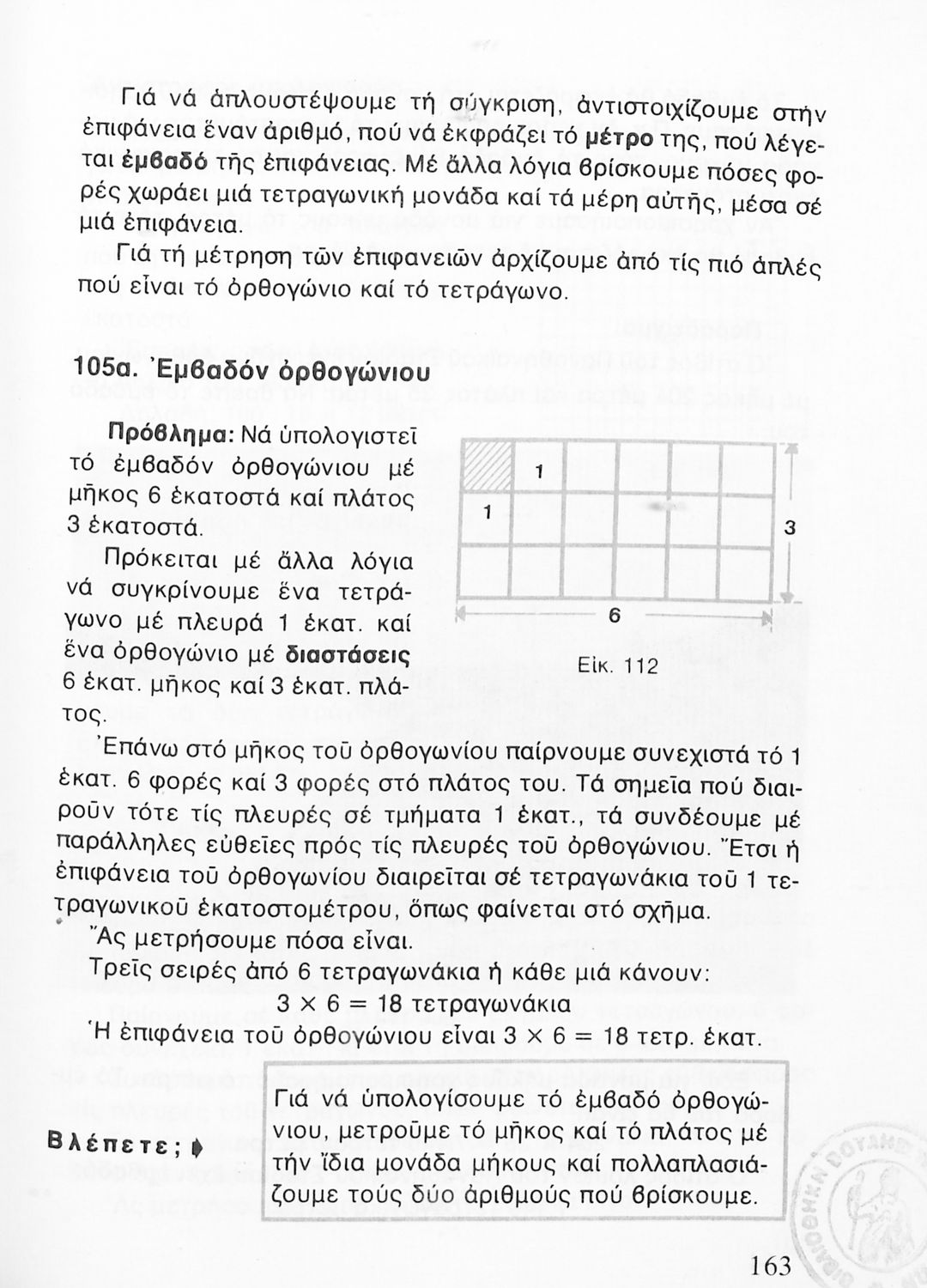 Σχολικό εγχειρίδιο Μαθηματικών ΣΤ΄ Δημοτικού που περιλαμβάνει ασκήσεις λογιστικού χαρακτήρα και ασκήσεις μέτρησης γεωμετρικών σχημάτων. Φέρει το σύμβολο της δικτατορίας.