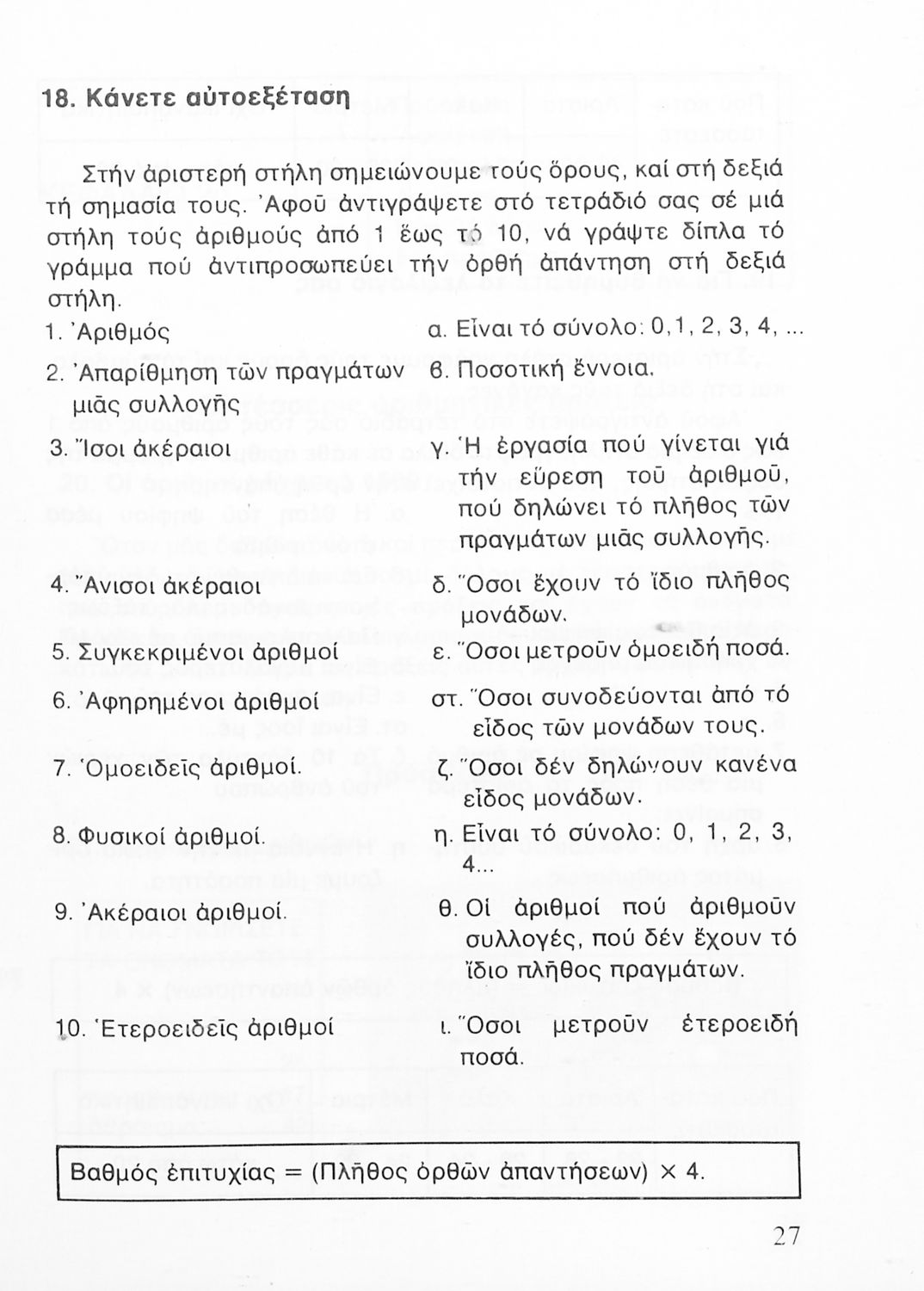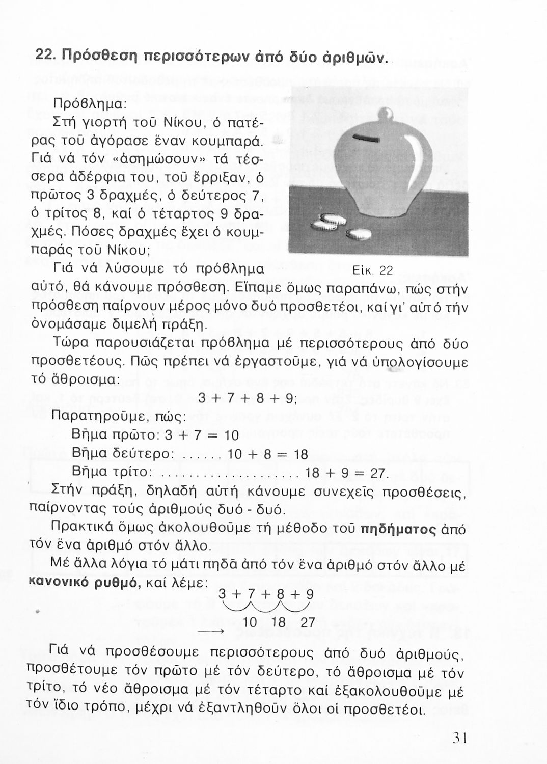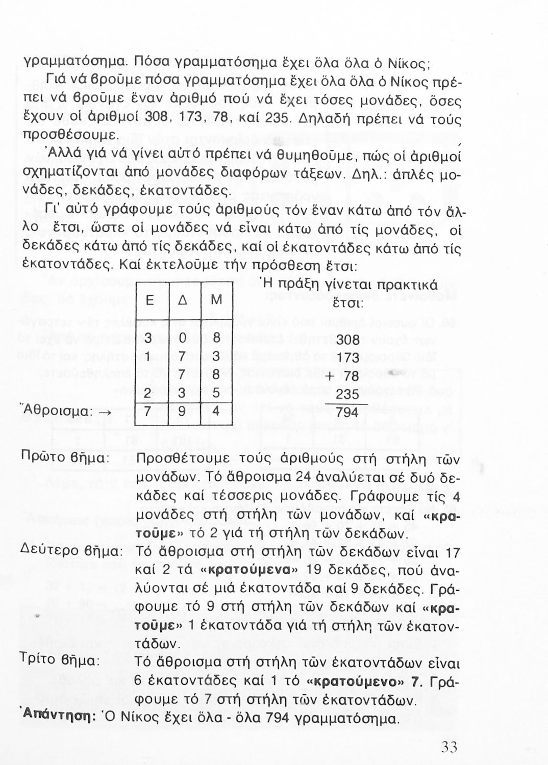 Σχολικό εγχειρίδιο Αριθμητικής Δ΄ Δημοτικού χωρισμένο σε πρακτικά προβλήματα και τις λύσεις τους που περιλαμβάνει και κάποια στοιχεία Γεωμετρίας.