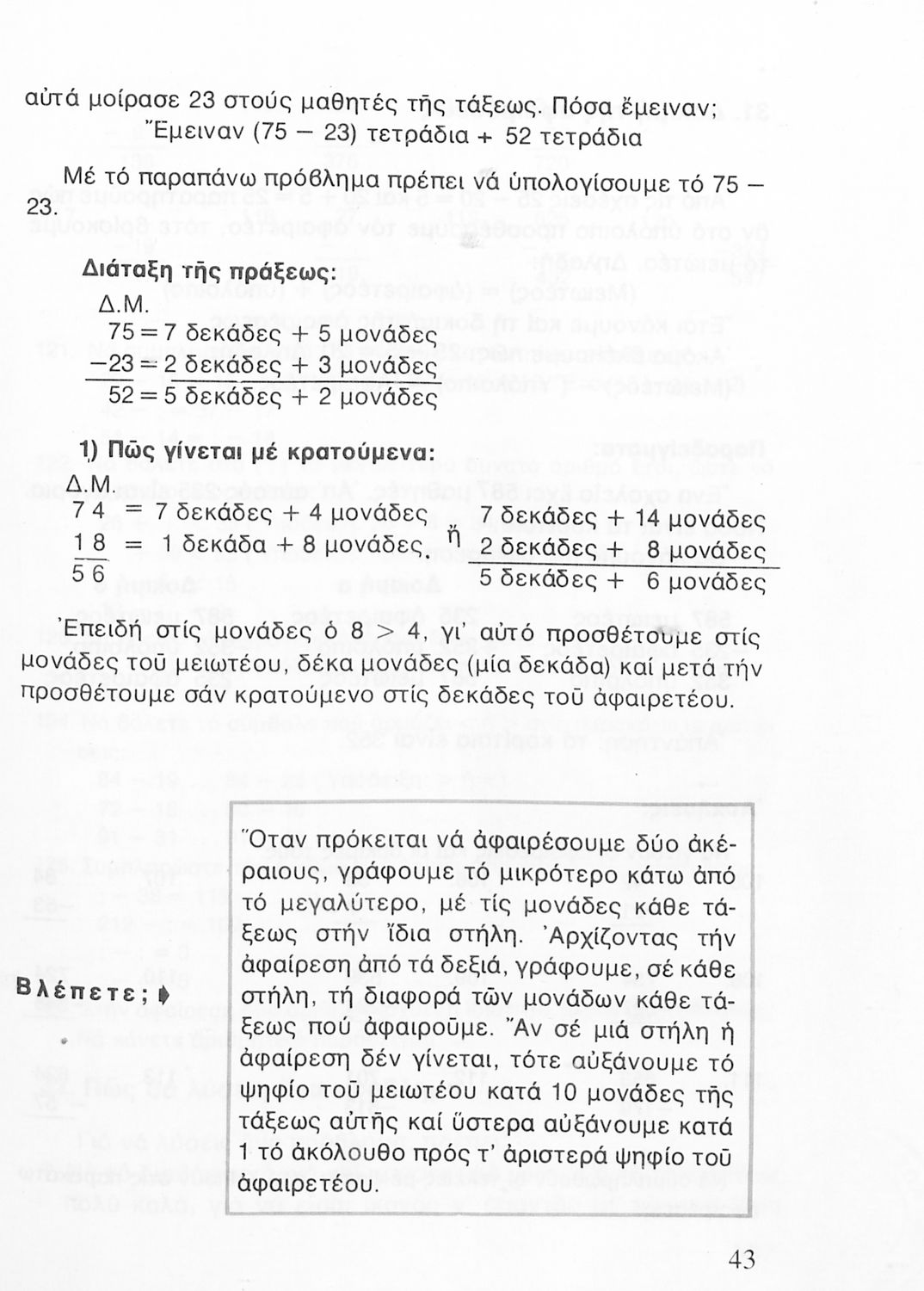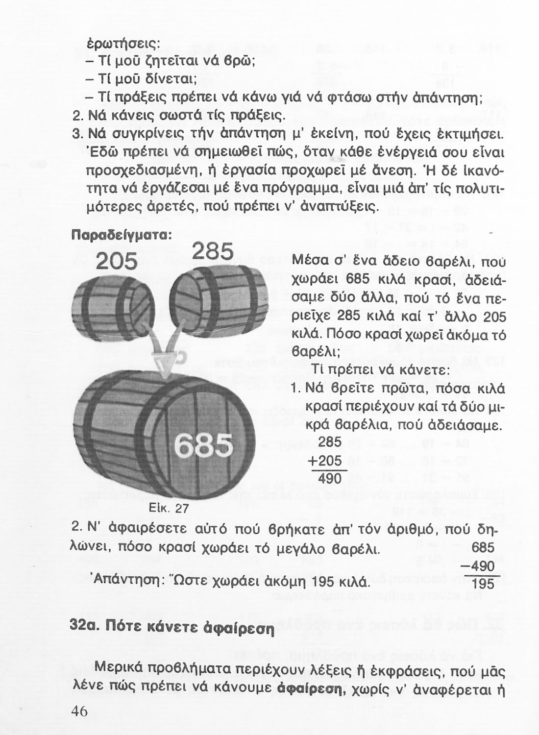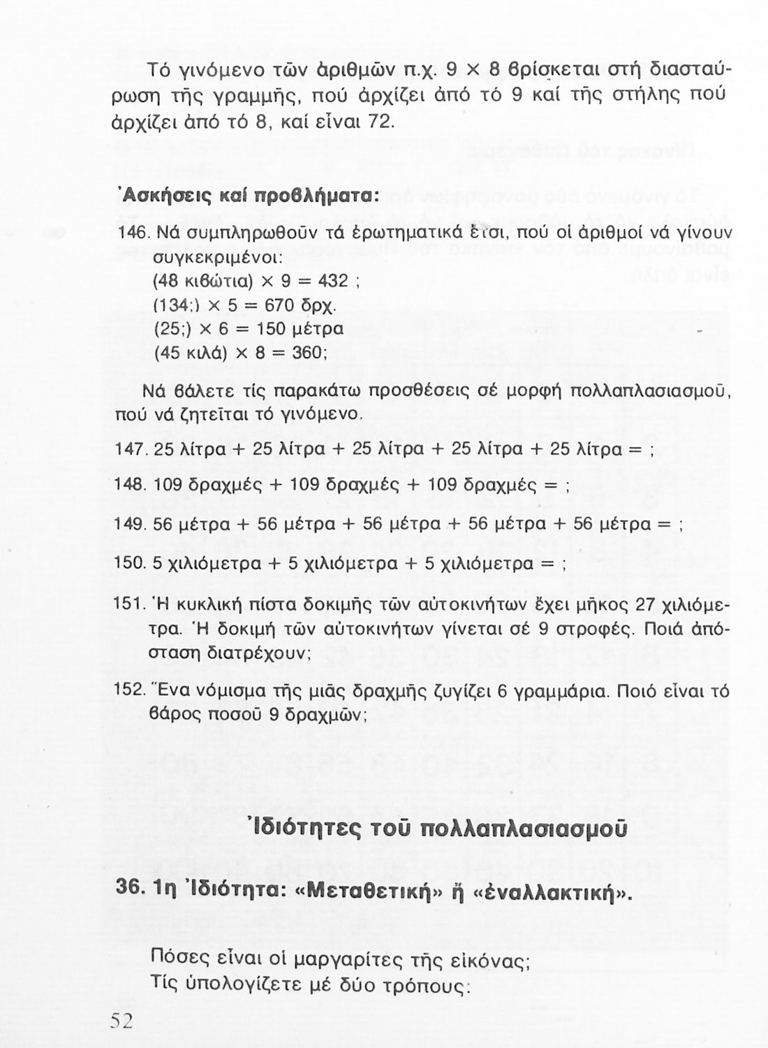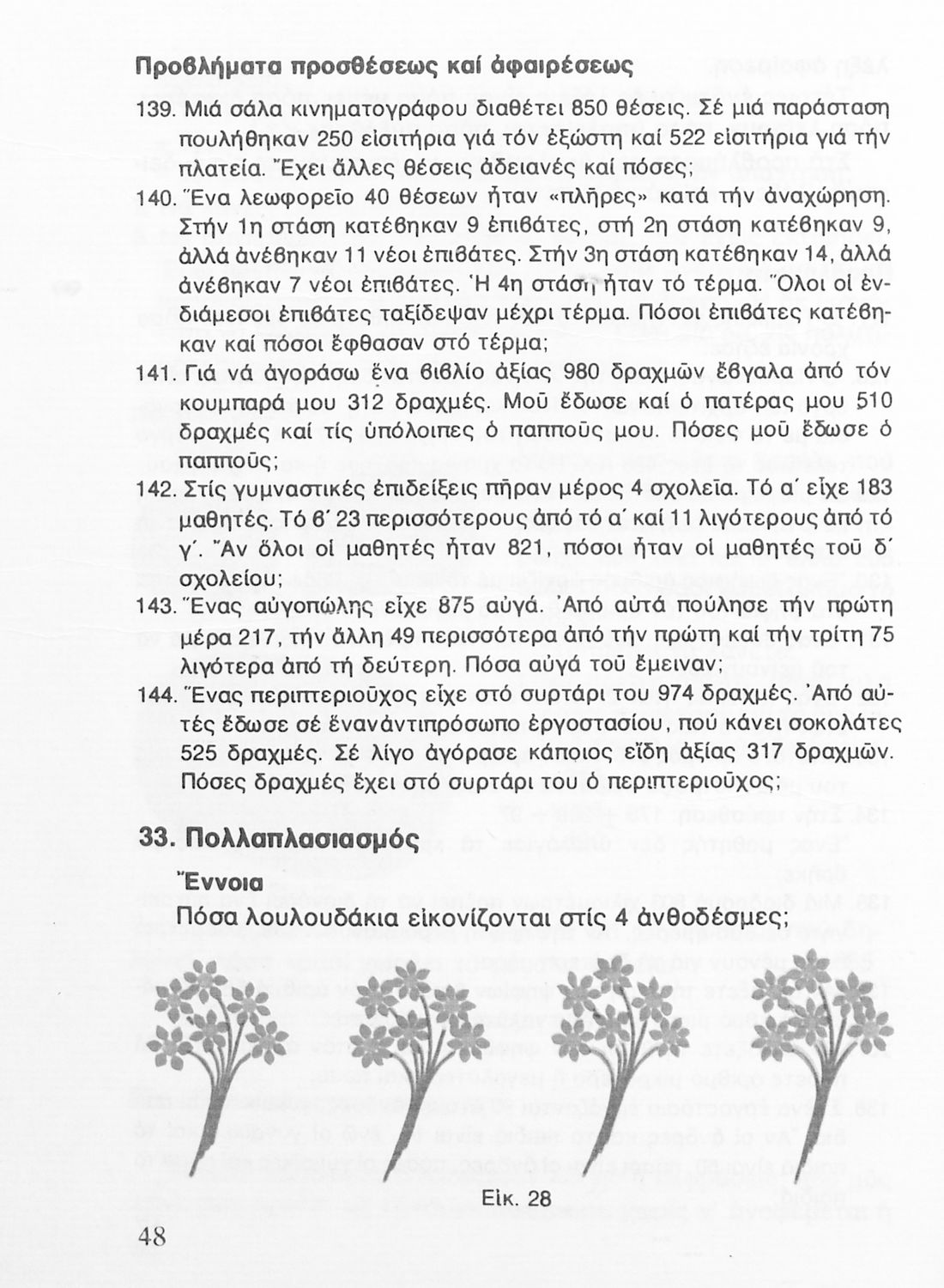 Σχολικό εγχειρίδιο Αριθμητικής Δ΄ Δημοτικού χωρισμένο σε πρακτικά προβλήματα και τις λύσεις τους που περιλαμβάνει και κάποια στοιχεία Γεωμετρίας.