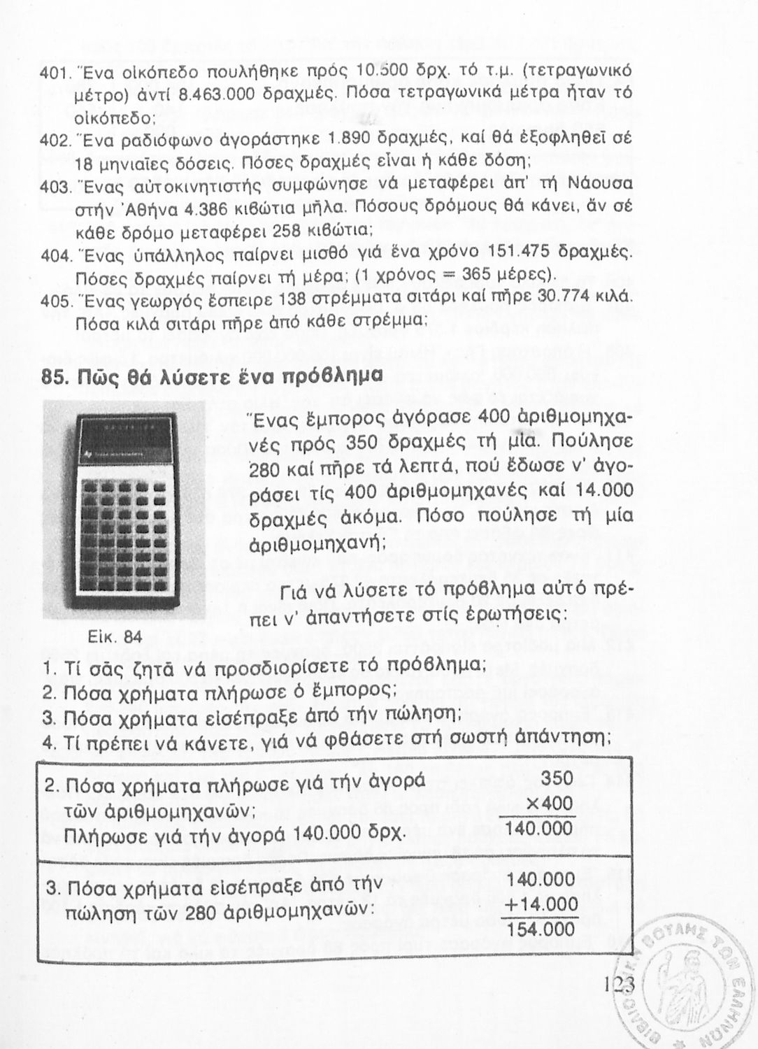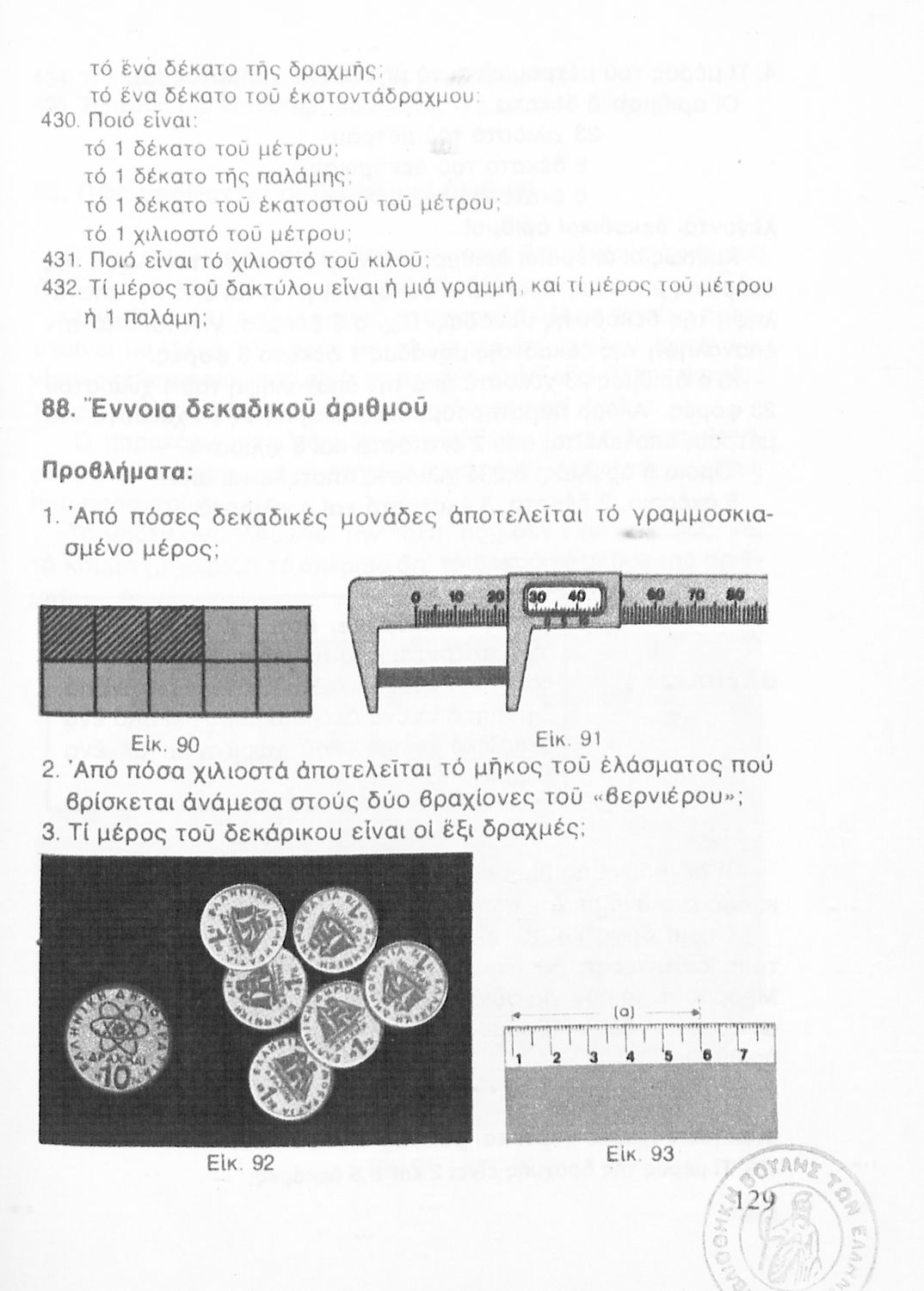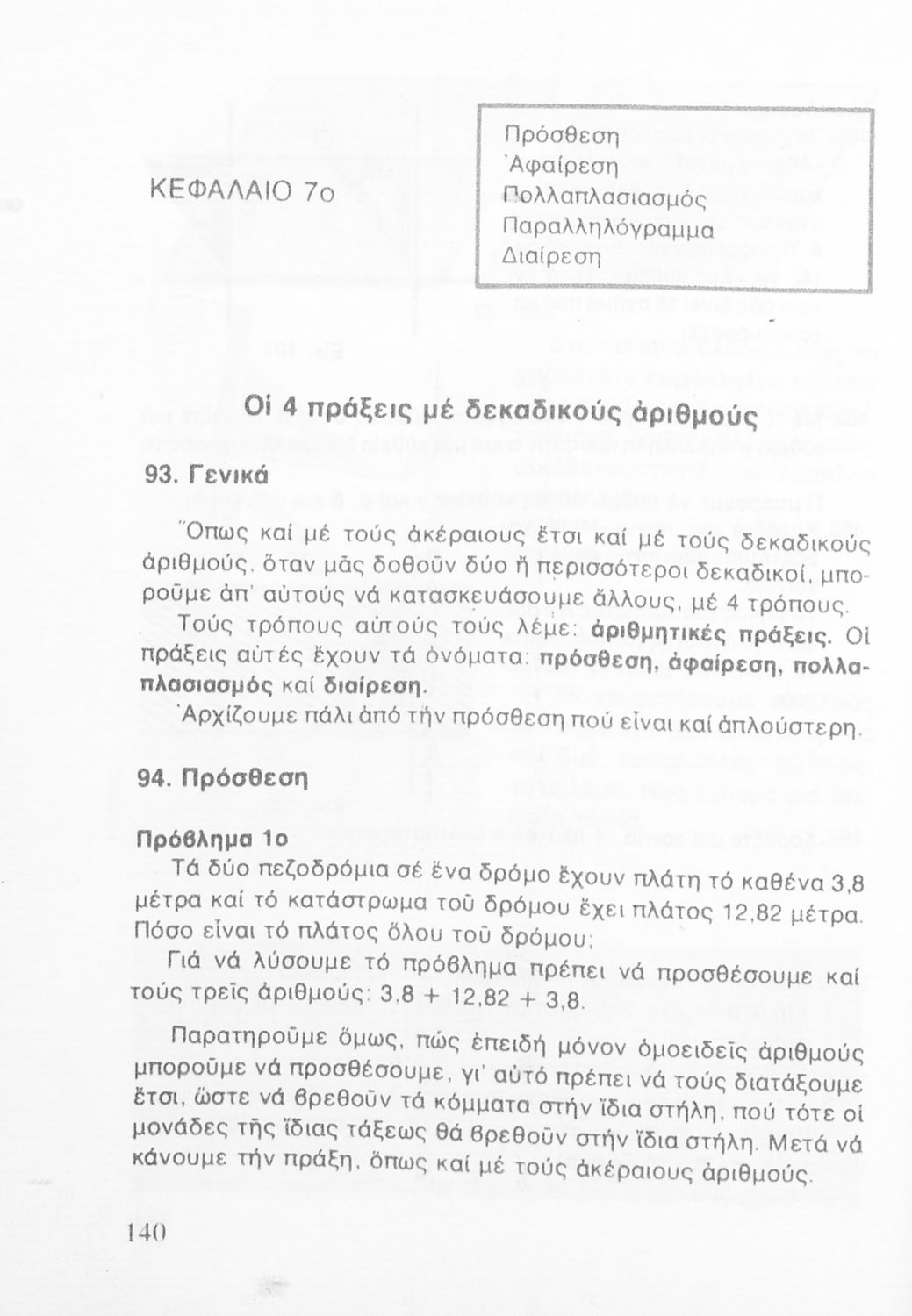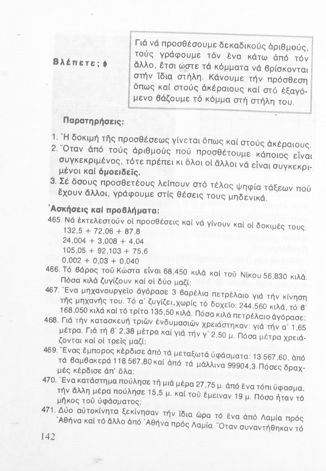 Σχολικό εγχειρίδιο Αριθμητικής Δ΄ Δημοτικού χωρισμένο σε πρακτικά προβλήματα και τις λύσεις τους που περιλαμβάνει και κάποια στοιχεία Γεωμετρίας.