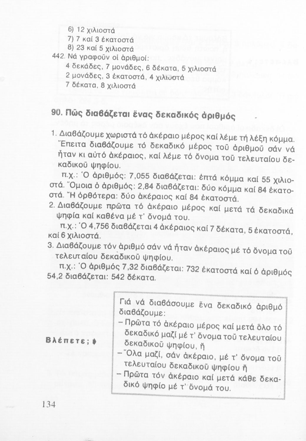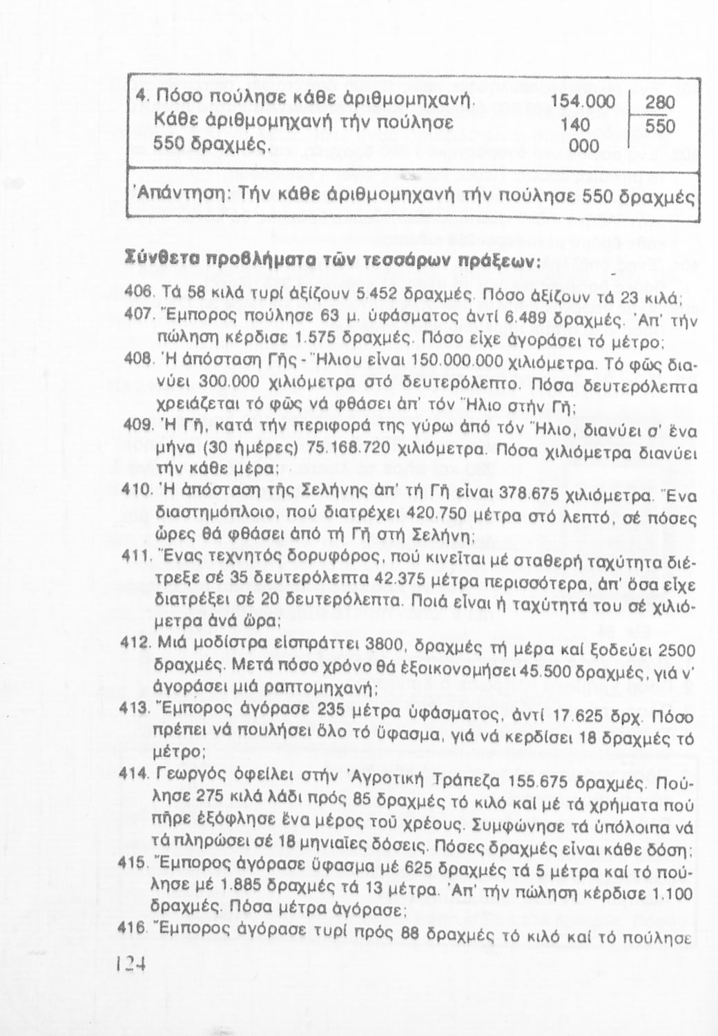 Σχολικό εγχειρίδιο Αριθμητικής Δ΄ Δημοτικού χωρισμένο σε πρακτικά προβλήματα και τις λύσεις τους που εστιάζει στις πράξεις με ακέραιους και συμμιγείς αριθμούς και περιλαμβάνει στοιχεία Γεωμετρίας.