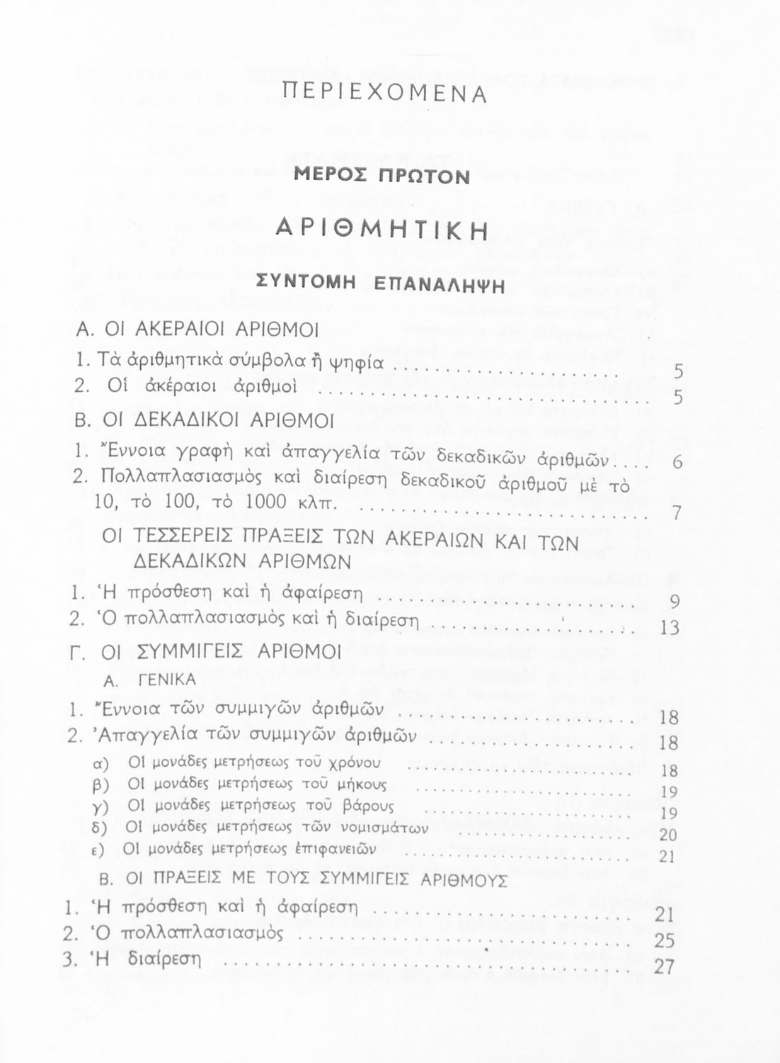 Σχολικό εγχειρίδιο Μαθηματικών Ε' Δημοτικού που περιέχει τις βασικές πράξεις αριθμητικής και παρουσιάζει τα κυριότερα γεωμετρικά σχήματα και τους τρόπους μέτρησής τους.