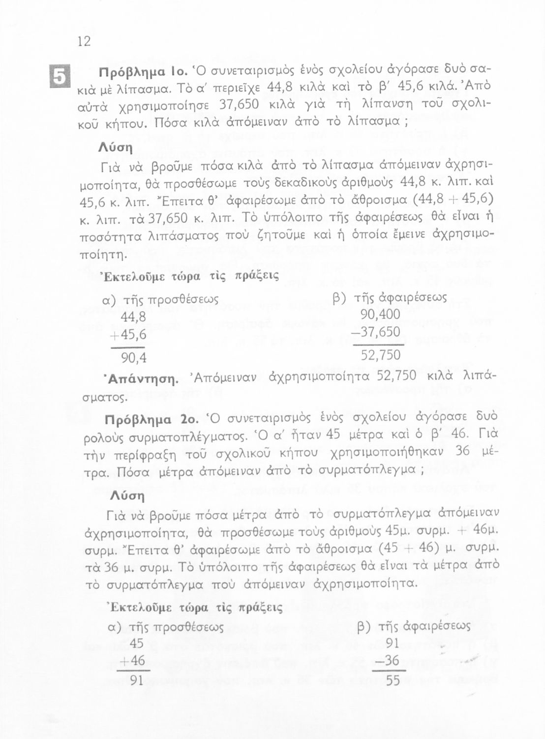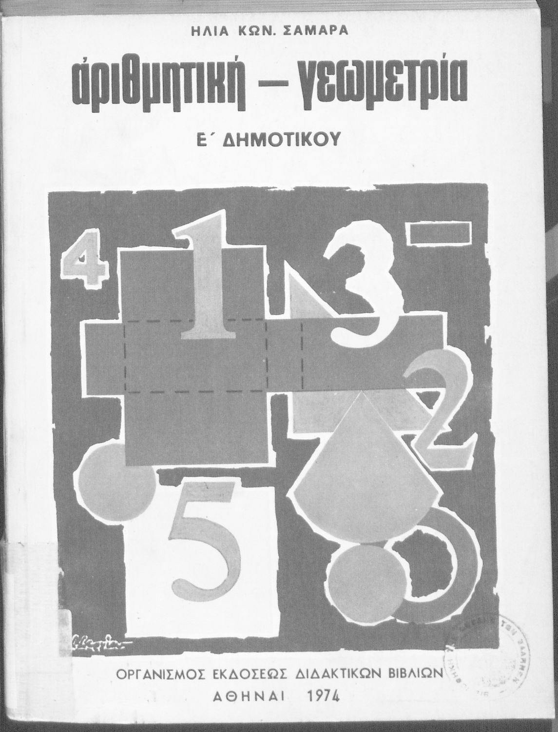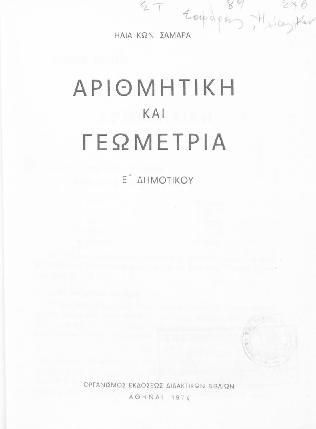 Σχολικό εγχειρίδιο Μαθηματικών Ε' Δημοτικού που περιέχει τις βασικές πράξεις αριθμητικής και παρουσιάζει τα κυριότερα γεωμετρικά σχήματα και τους τρόπους μέτρησής τους.