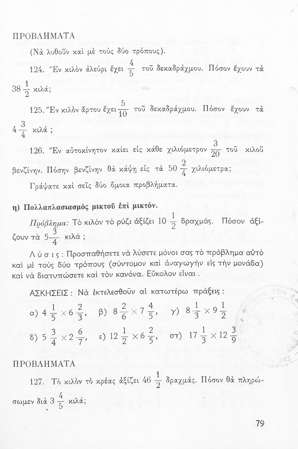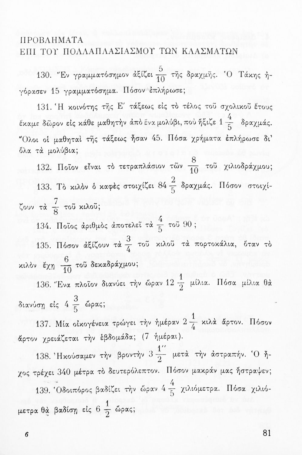 Σχολικό εγχειρίδιο Μαθηματικών ΣΤ΄ Δημοτικού που περιλαμβάνει ασκήσεις λογιστικού χαρακτήρα και ασκήσεις μέτρησης γεωμετρικών σχημάτων. Φέρει το σύμβολο της δικτατορίας.
