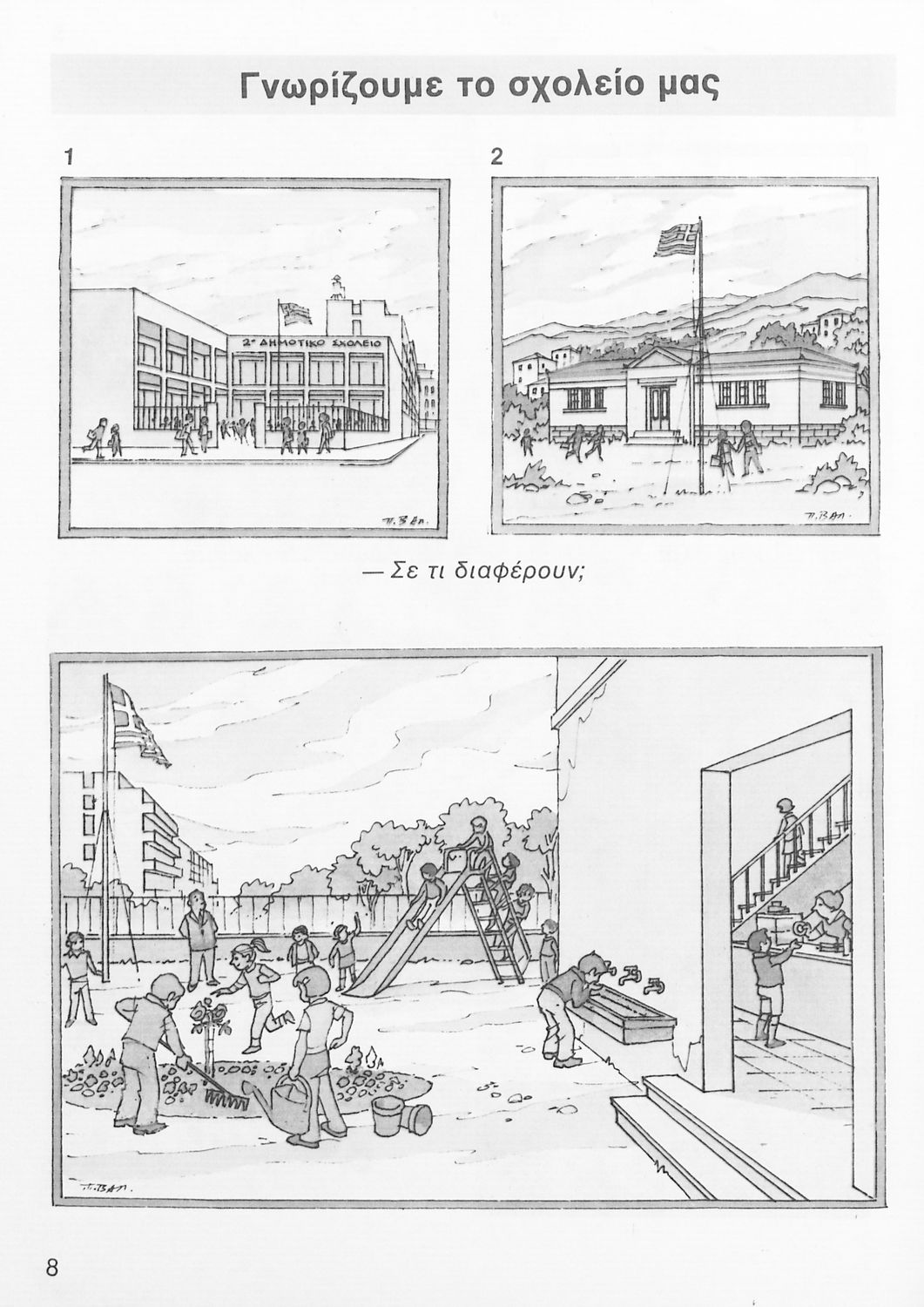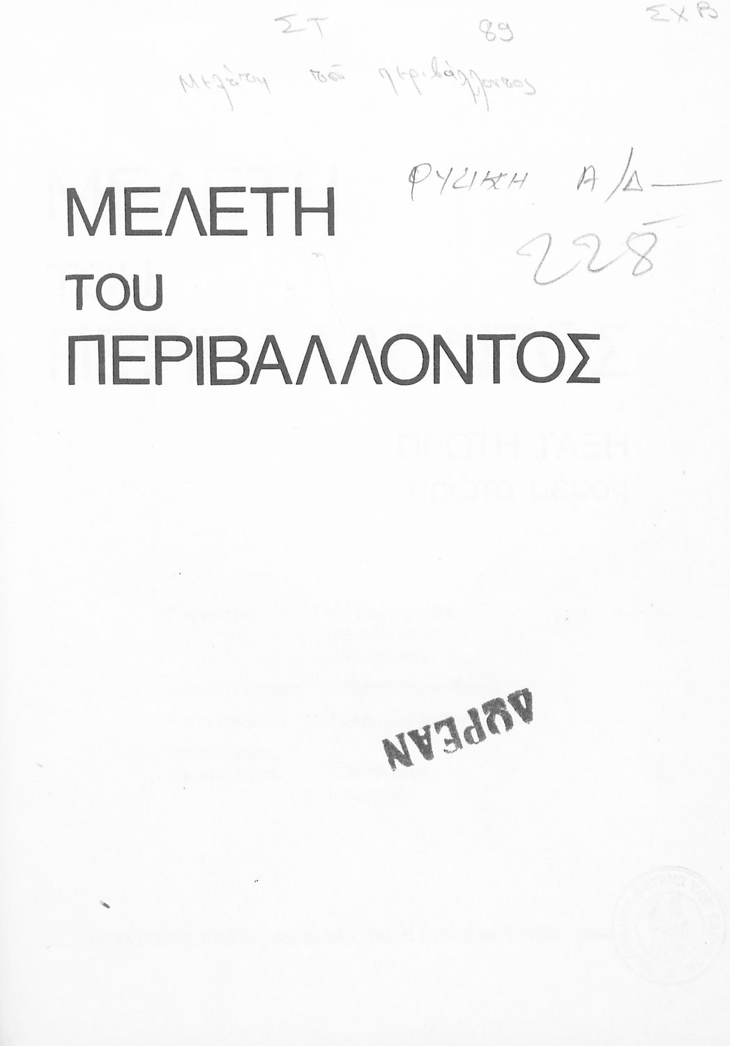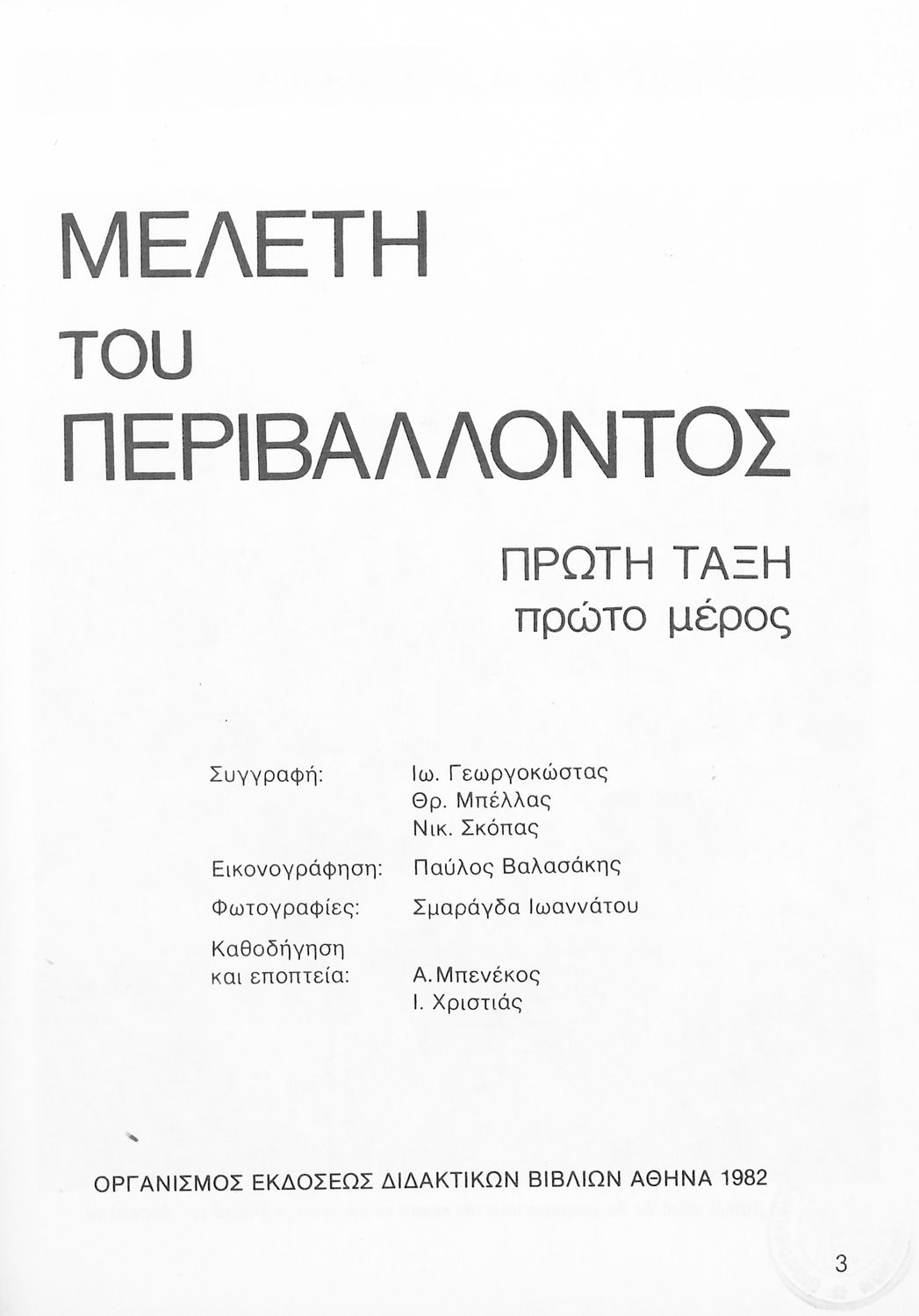 Σχολικό εγχειρίδιο Μελέτης Περιβάλλοντος για τους μαθητές της Α΄ τάξης του Δημοτικού. Εισάγει τους μαθητές στους βασικούς κώδικες επικοινωνίας με τους συμμαθητές τους καταρχήν και το κοινωνικό τους και φυσικό περιβάλλον γενικότερα.