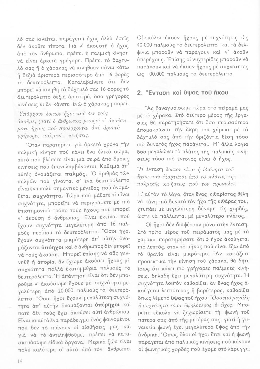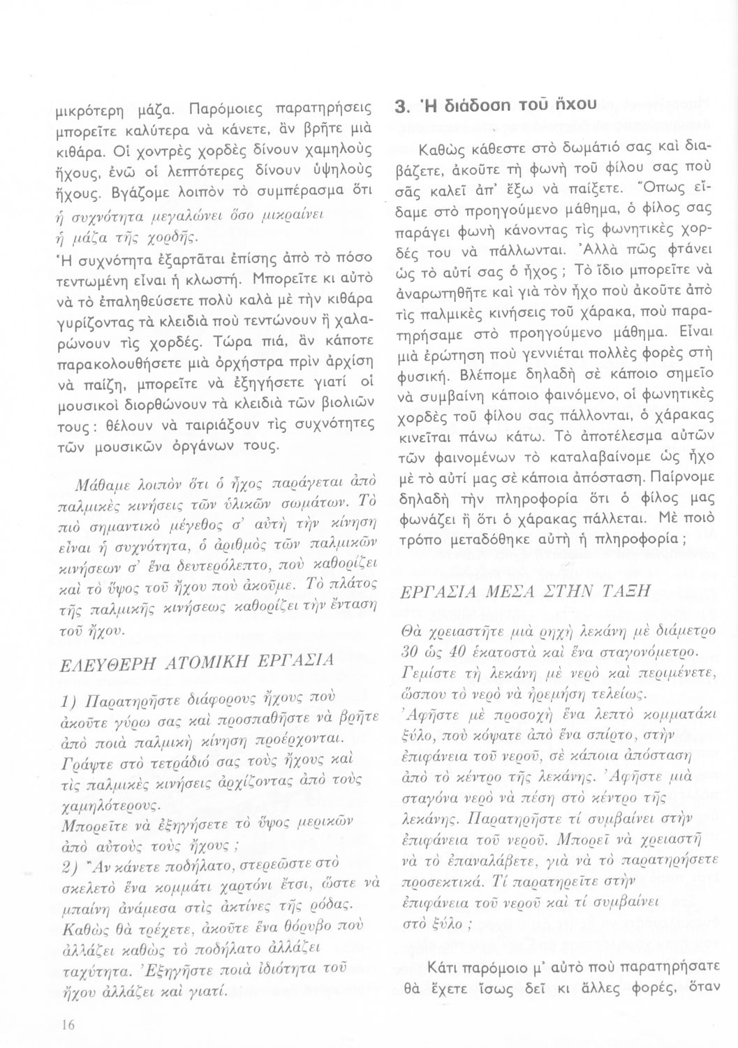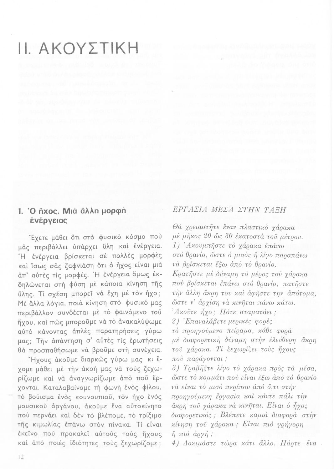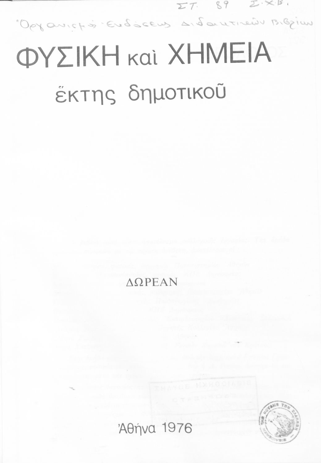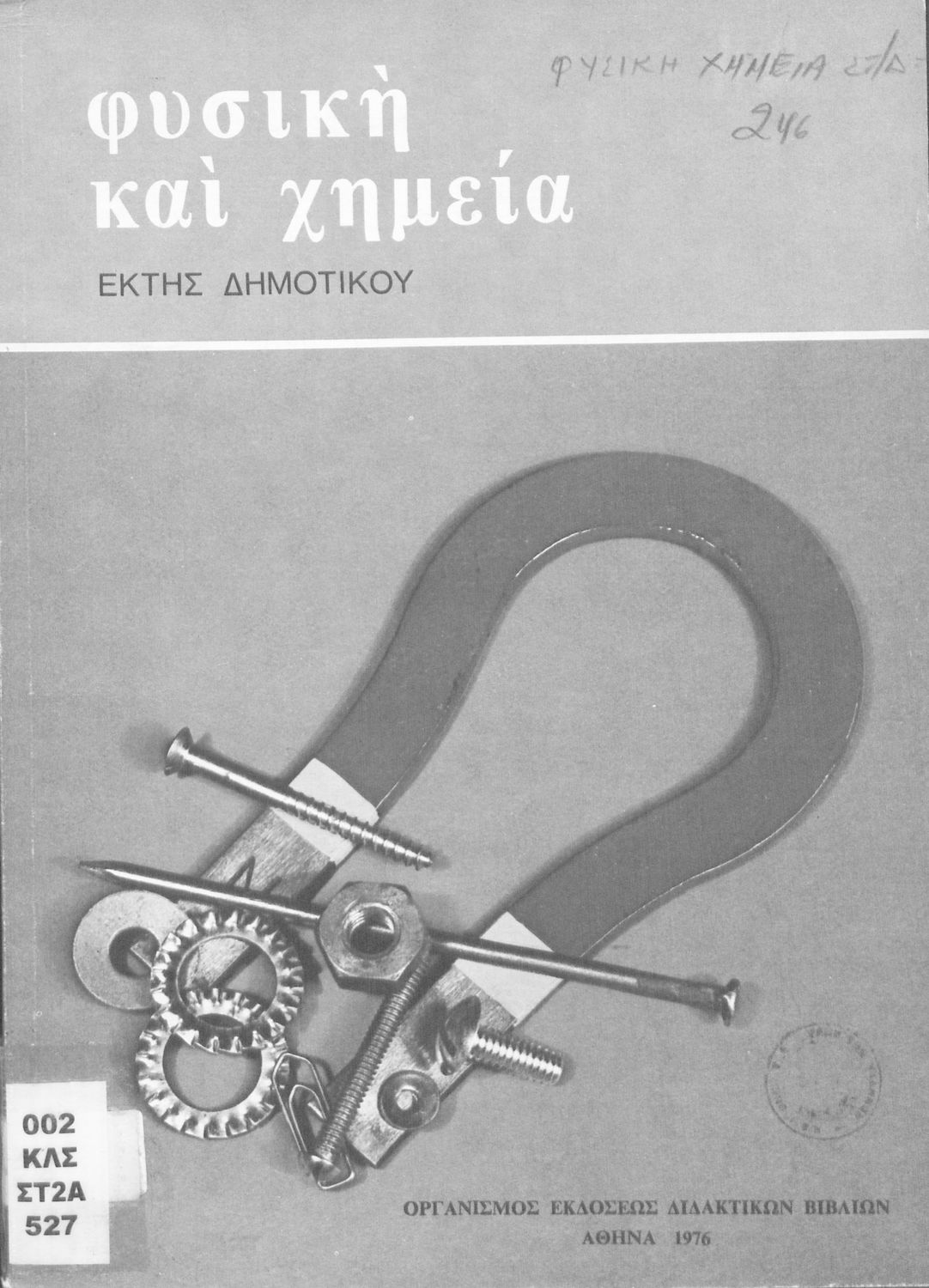 Βαθμίδα εκπαίδευσης: Πρωτοβάθμια Τάξη: ΣΤ' Δημοτικού Γλώσσα: Δημοτική Παρουσίαση περιεχομένου: Σχολικό εγχειρίδιο Φυσικής και Χημείας της ΣΤ΄ Δημοτικού. Το βιβλίο αποτελεί μια εισαγωγή στις βασικές έννοιες της Φυσικής και της Χημείας. Εξετάζει ζητήματα ακουστικής, οπτικής, ηλεκτρομαγνητισμού, ατομικής και πυρηνικής φυσικής. Το βιβλίο τελειώνει με μια εισαγωγή στη Χημεία, τα καύσιμα και τη χρησιμότητά τους στον άνθρωπο. |