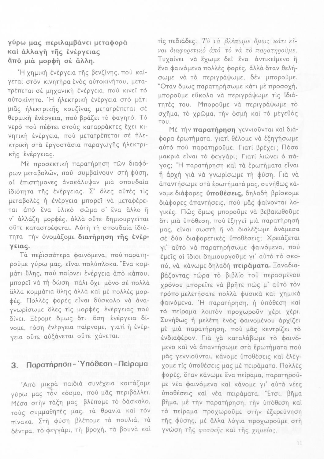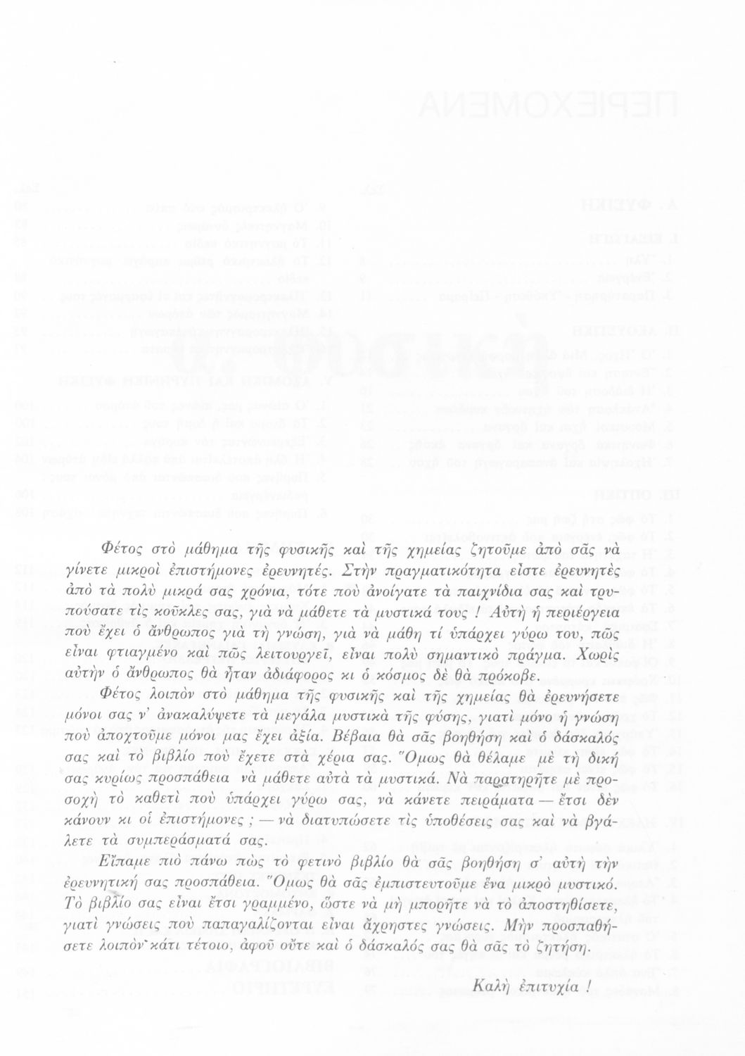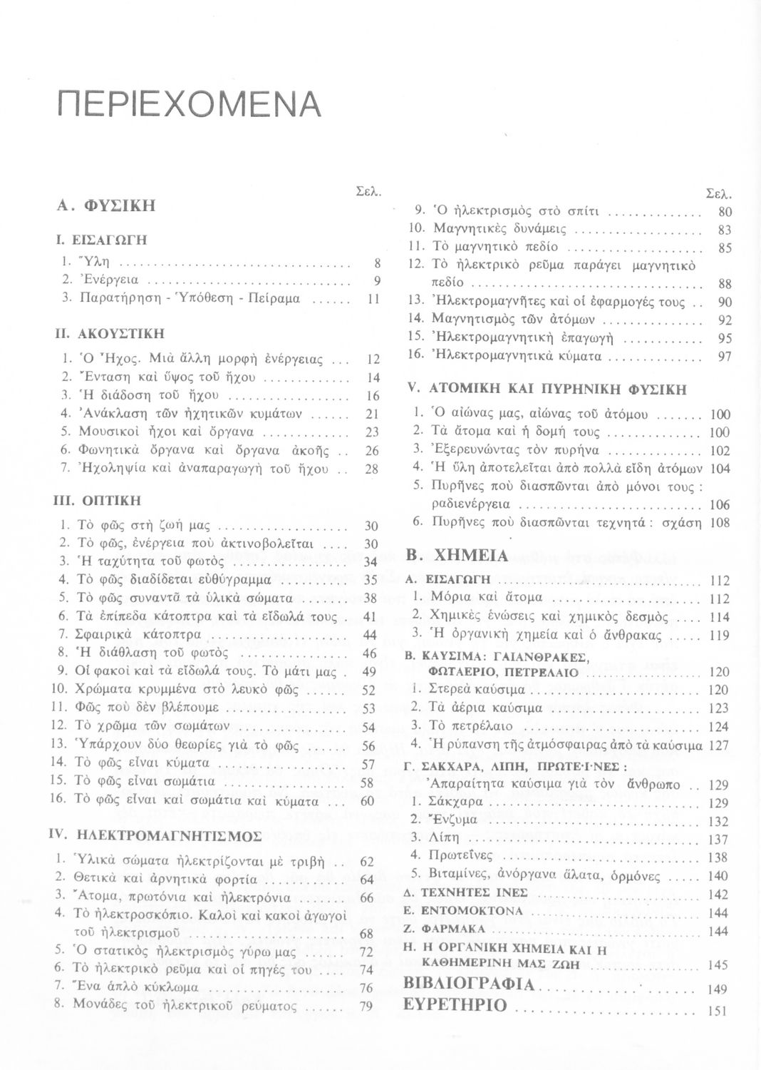 Σχολικό εγχειρίδιο Φυσικής και Χημείας της ΣΤ΄ Δημοτικού. Το βιβλίο αποτελεί μια εισαγωγή στις βασικές έννοιες της Φυσικής και της Χημείας. Εξετάζει ζητήματα ακουστικής, οπτικής, ηλεκτρομαγνητισμού, ατομικής και πυρηνικής φυσικής. Το βιβλίο τελειώνει με μια εισαγωγή στη Χημεία, τα καύσιμα και τη χρησιμότητά τους στον άνθρωπο.
