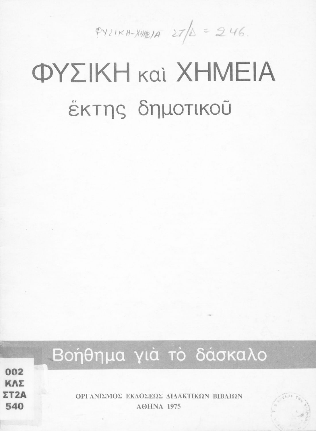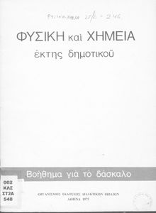 Βαθμίδα εκπαίδευσης: Πρωτοβάθμια Τάξη: ΣΤ' Δημοτικού Γλώσσα: Δημοτική με στοιχεία καθαρεύουσας Παρουσίαση περιεχομένου: Παιδαγωγικό βοήθημα για το δάσκαλο στα μαθήματα της Φυσικής και της Χημείας της ΣΤ΄ τάξης Δημοτικού. Το βιβλίο είναι χωρισμένο σε πενήντα επτά ενότητες. Στην κάθε ενότητα αναφέρεται ο στόχος του μαθήματος και ο τρόπος διδασκαλίας του. |
