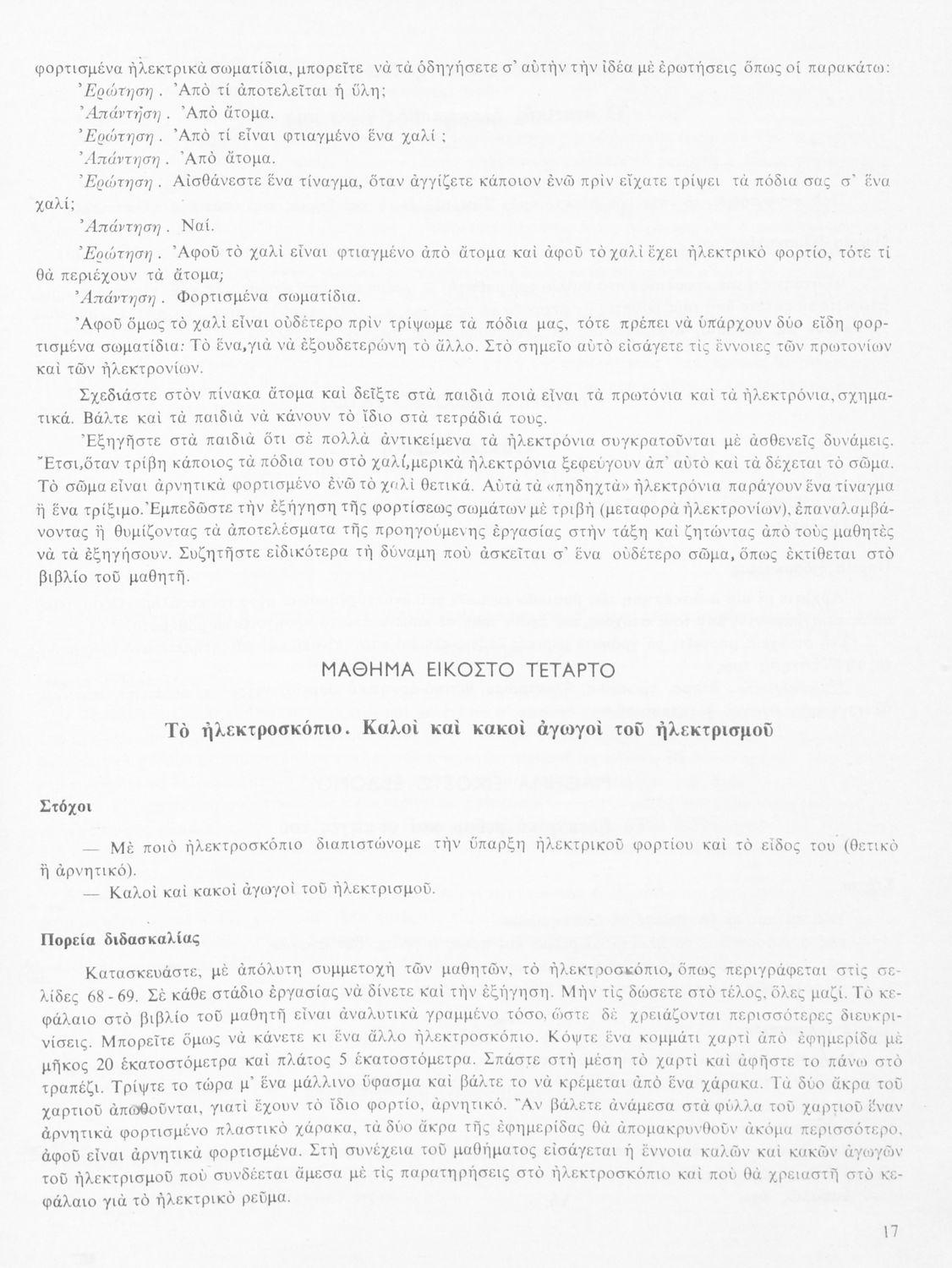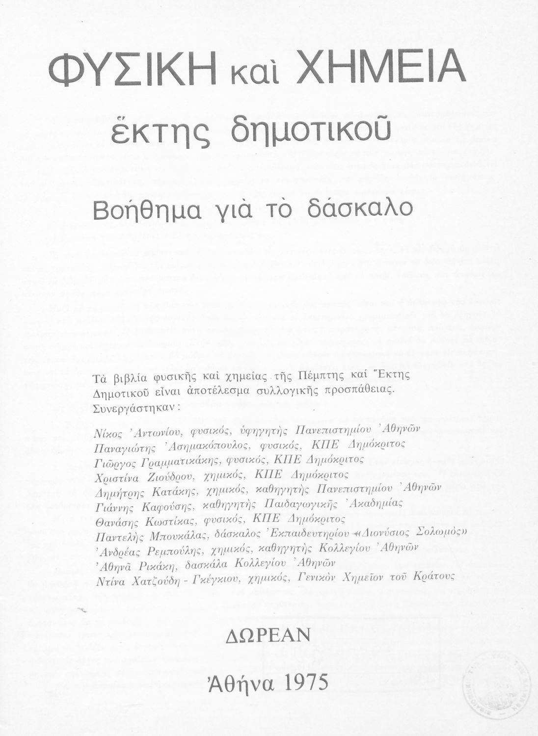 Παιδαγωγικό βοήθημα για το δάσκαλο στα μαθήματα της Φυσικής και της Χημείας της ΣΤ΄ τάξης Δημοτικού. Το βιβλίο είναι χωρισμένο σε πενήντα επτά ενότητες. Στην κάθε ενότητα αναφέρεται ο στόχος του μαθήματος και ο τρόπος διδασκαλίας του.