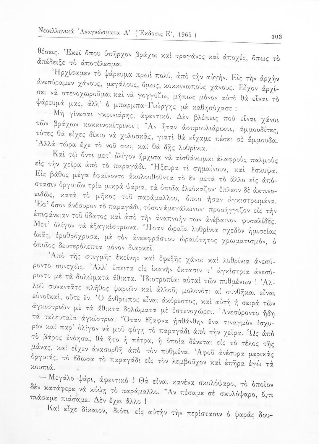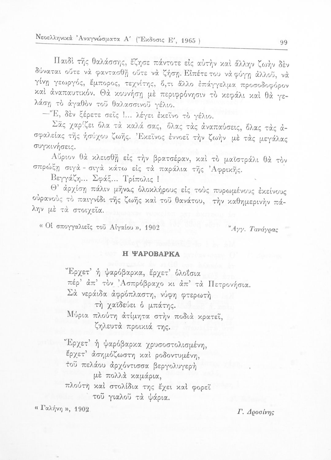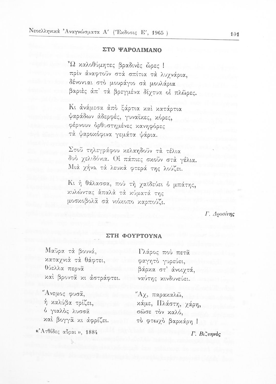 Σχολικό εγχειρίδιο Νέων Ελληνικών Α' Γυμνασίου που περιέχει ποιήματα και πεζά Ελλήνων συγγραφέων εμπνευσμένα από την αρχαία ελληνική ιστορία και μυθολογία, τη βυζαντινή και σύγχρονη ελληνική ιστορία και την καθημερινή ζωή. Περιέχει παράρτημα με βιογραφίες των συγγραφέων και λεξιλόγιο.