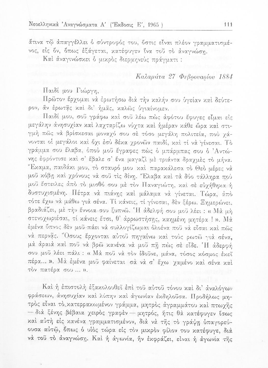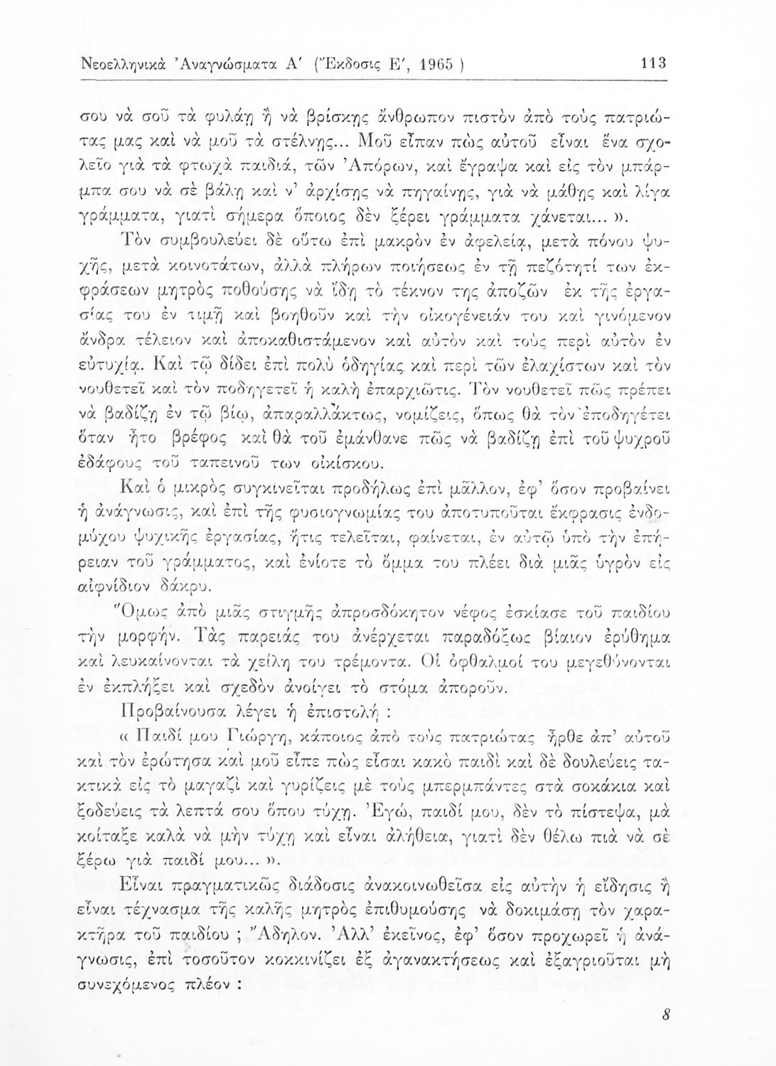 Βαθμίδα εκπαίδευσης: Δευτεροβάθμια Τάξη: Α' Γυμνασίου Μάθημα: Νέα Ελληνικά Γλώσσα: Καθαρεύουσα Παρουσίαση περιεχομένου: Σχολικό εγχειρίδιο Νέων Ελληνικών Α' Γυμνασίου που περιέχει ποιήματα και πεζά Ελλήνων συγγραφέων εμπνευσμένα από την αρχαία ελληνική ιστορία και μυθολογία, τη βυζαντινή και σύγχρονη ελληνική ιστορία και την καθημερινή ζωή. Περιέχει παράρτημα με βιογραφίες των συγγραφέων και λεξιλόγιο. |