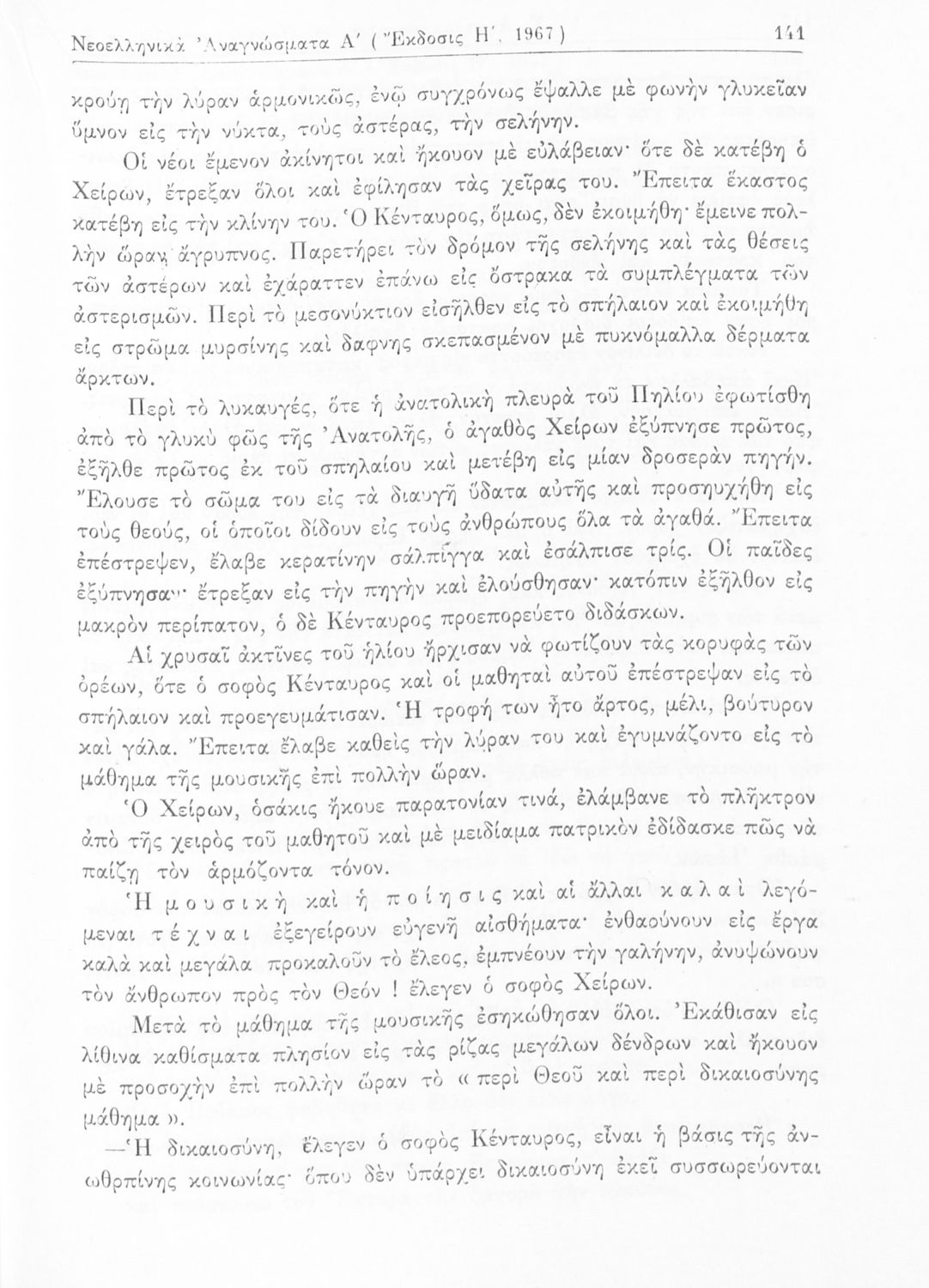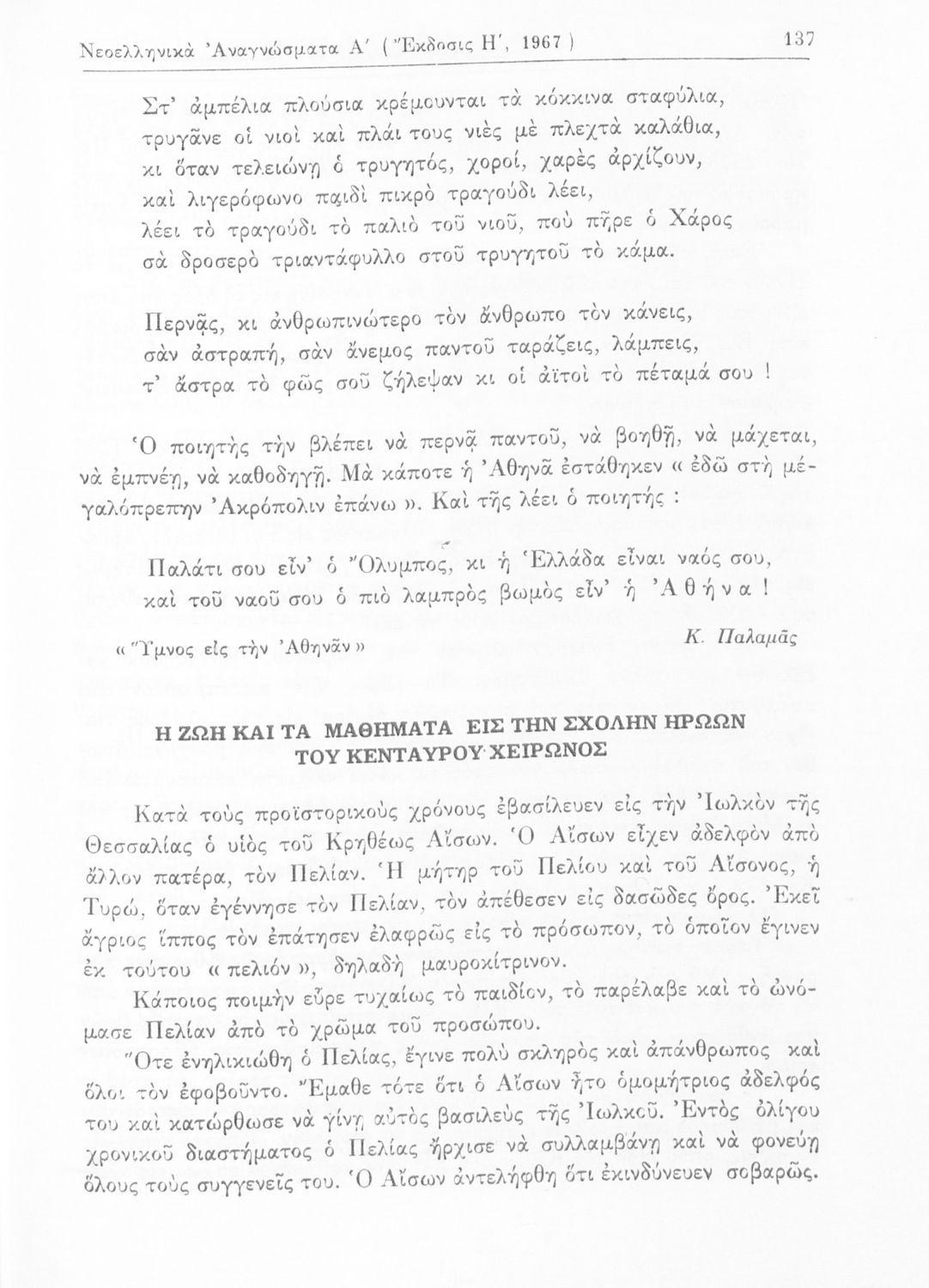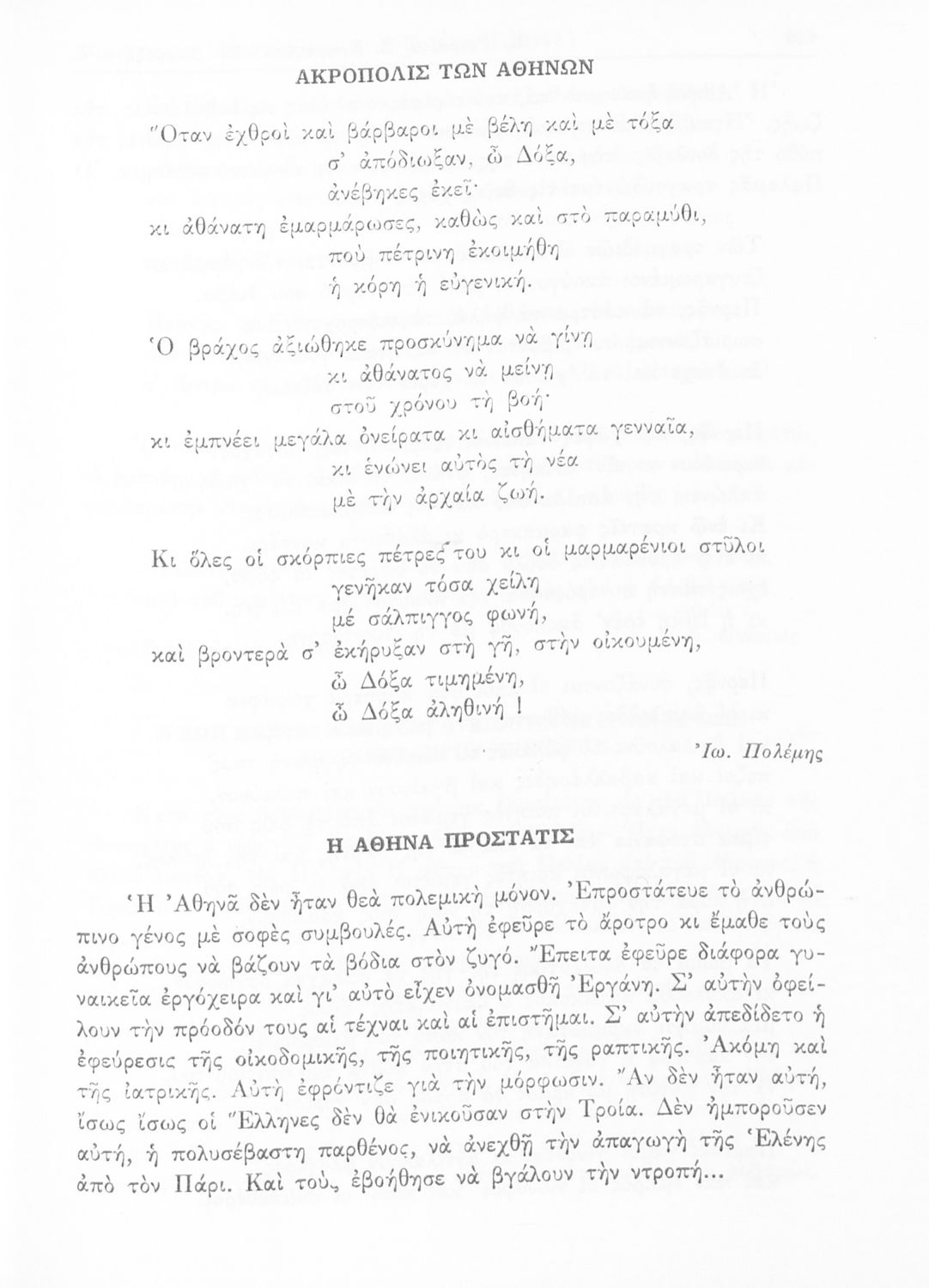 Σχολικό εγχειρίδιο Νέων Ελληνικών Γ΄ Γυμνασίου και Α' Αστικού Σχολείου που περιέχει πεζά και ποιήματα Ελλήνων συγγραφέων εμπνευσμένα από τη θρησκευτική και κοινωνική ζωή, την ελληνική μυθολογία, την αρχαία και